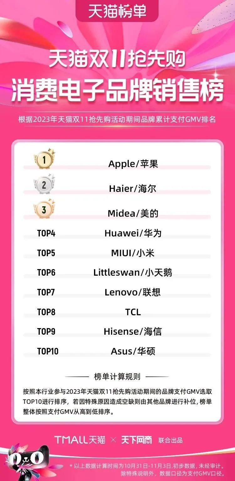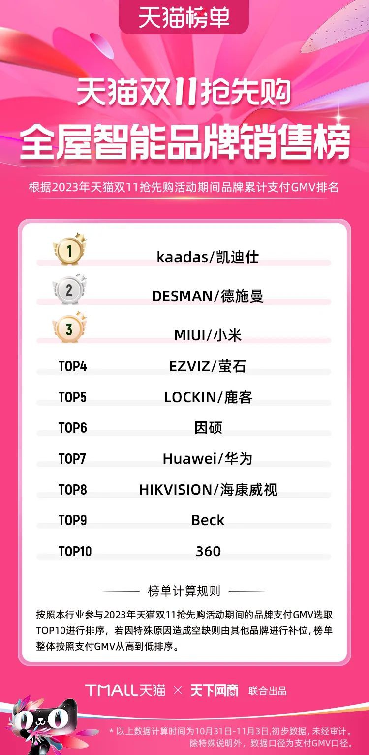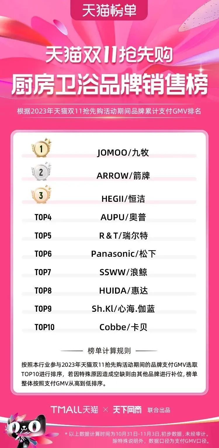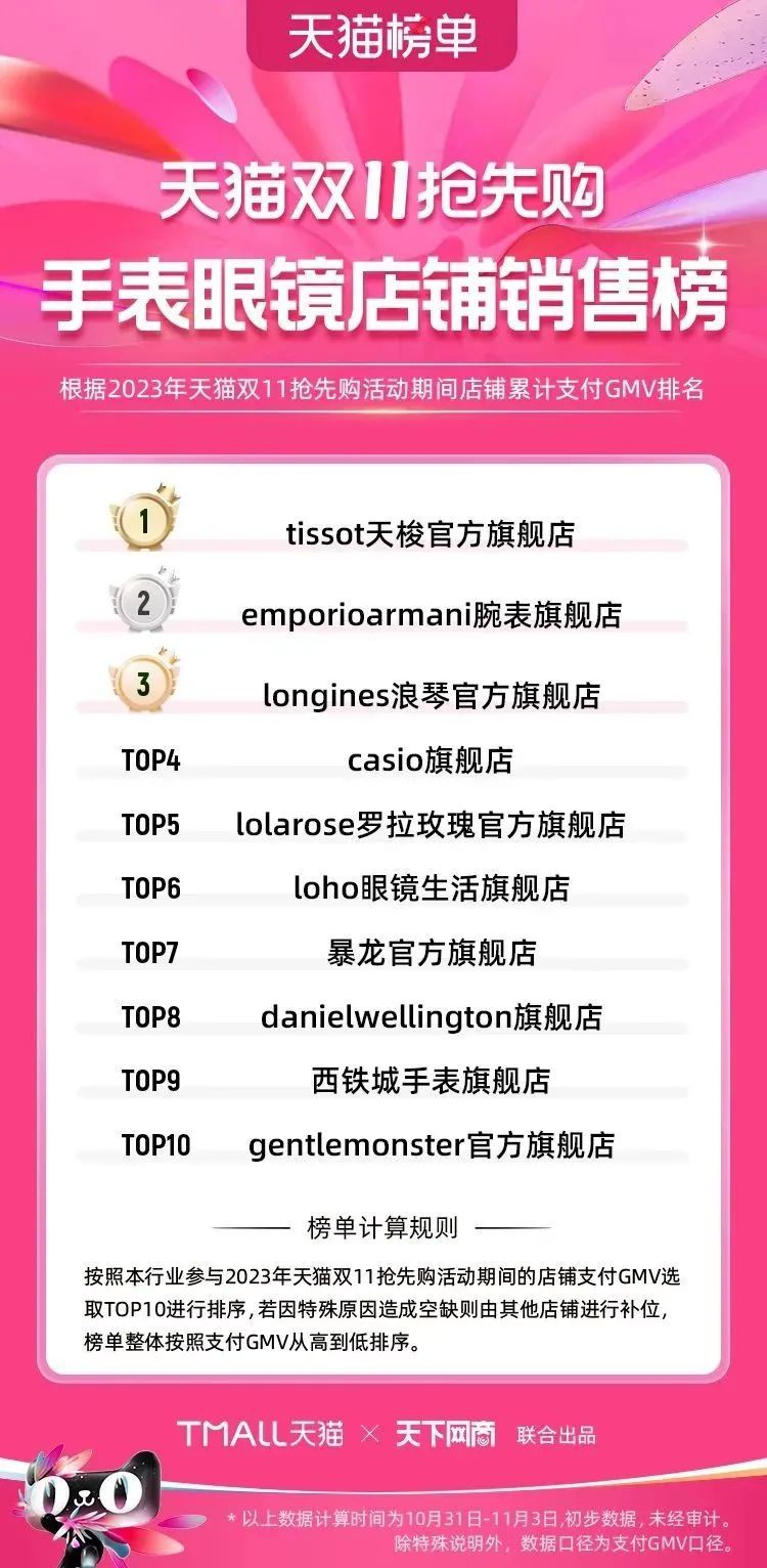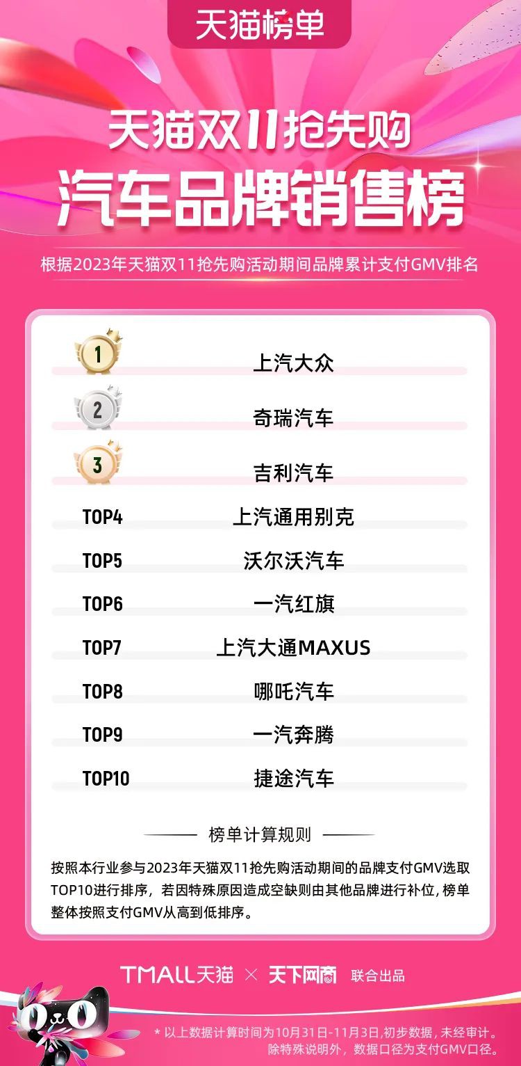 2023年天貓雙11強(qiáng)勁開局,第一波剛開售155個(gè)品牌開賣成交即破億,開售首小時(shí)7.19萬(wàn)個(gè)品牌成交額超去年首日全天。 11月4日,天貓雙11發(fā)布第一階段(10月31日-11月3日)品牌商家成交金額排行榜及品牌商家成交人數(shù)排行榜,大快消、服飾、運(yùn)動(dòng)戶外、消費(fèi)電子、家裝家居、玩具潮玩、食品生鮮、汽車等行業(yè)的“領(lǐng)跑者”出爐。 星圖最新數(shù)據(jù)顯示,2023年雙11正式開售首日,淘寶天貓份額占比近6成,市場(chǎng)份額相比去年進(jìn)一步擴(kuò)大。此外,QuestMobile數(shù)據(jù)顯示,2023年10月24日雙11預(yù)售當(dāng)天,淘寶APP活躍用戶數(shù)達(dá)5.07億,為行業(yè)第一,DAU同比增幅超5%。 作為品牌線上經(jīng)營(yíng)的主陣地,天貓雙11前,天貓投入總額20億的“真金白銀”,用于品牌商家經(jīng)營(yíng)激勵(lì),支持品牌以最小的投入,獲得最大的增長(zhǎng)。 以下為天貓雙11第一階段(10月31日-11月3日)榜單: 快消銷售榜 快消人氣榜 服飾時(shí)尚銷售榜 服飾時(shí)尚人氣榜 運(yùn)動(dòng)戶外銷售榜 運(yùn)動(dòng)戶外人氣榜 消費(fèi)電子銷售榜 消費(fèi)電子人氣榜 家裝家居銷售榜 家裝家居人氣榜 玩具潮玩銷售榜 玩具潮玩人氣榜 香氛香薰銷售榜 香氛香薰人氣榜 寵物銷售榜 寵物人氣榜 食品銷售榜 食品人氣榜 汽車人氣榜 汽車銷售榜 生鮮銷售榜 生鮮人氣榜 文教銷售榜 文教人氣榜 珠寶飾品銷售榜 珠寶飾品人氣榜 企業(yè)服務(wù)銷售榜 企業(yè)服務(wù)人氣榜 健康銷售榜 |