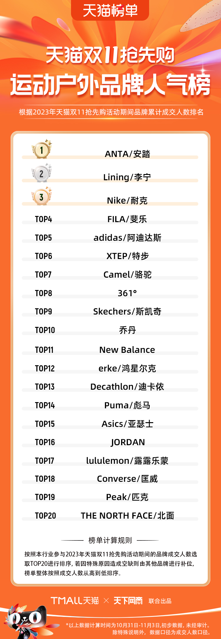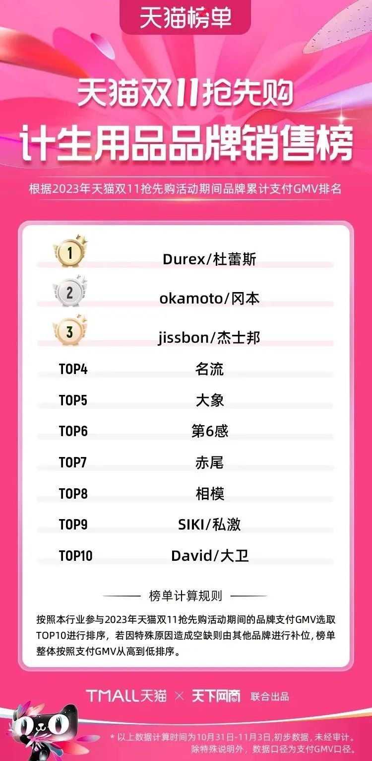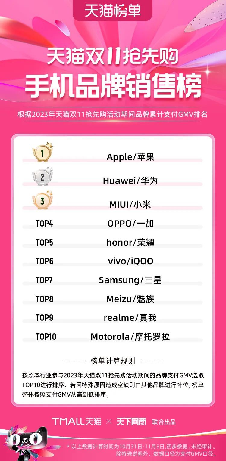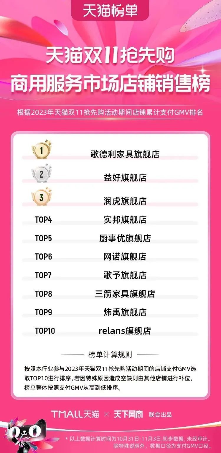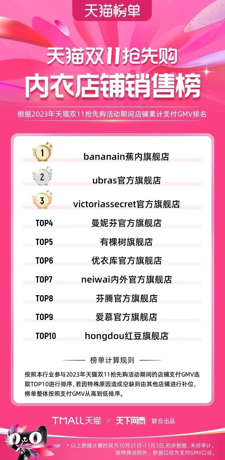 2023年天貓雙11強(qiáng)勁開局,第一波剛開售155個(gè)品牌開賣成交即破億,開售首小時(shí)7.19萬(wàn)個(gè)品牌成交額超去年首日全天。 11月4日,天貓雙11發(fā)布第一階段(10月31日-11月3日)品牌商家成交金額排行榜及品牌商家成交人數(shù)排行榜,大快消、服飾、運(yùn)動(dòng)戶外、消費(fèi)電子、家裝家居、玩具潮玩、食品生鮮、汽車等行業(yè)的“領(lǐng)跑者”出爐。 星圖最新數(shù)據(jù)顯示,2023年雙11正式開售首日,淘寶天貓份額占比近6成,市場(chǎng)份額相比去年進(jìn)一步擴(kuò)大。此外,QuestMobile數(shù)據(jù)顯示,2023年10月24日雙11預(yù)售當(dāng)天,淘寶APP活躍用戶數(shù)達(dá)5.07億,為行業(yè)第一,DAU同比增幅超5%。 作為品牌線上經(jīng)營(yíng)的主陣地,天貓雙11前,天貓投入總額20億的“真金白銀”,用于品牌商家經(jīng)營(yíng)激勵(lì),支持品牌以最小的投入,獲得最大的增長(zhǎng)。 以下為天貓雙11第一階段(10月31日-11月3日)榜單: 快消銷售榜 快消人氣榜 服飾時(shí)尚銷售榜 服飾時(shí)尚人氣榜 運(yùn)動(dòng)戶外銷售榜 運(yùn)動(dòng)戶外人氣榜 消費(fèi)電子銷售榜 消費(fèi)電子人氣榜 家裝家居銷售榜 家裝家居人氣榜 玩具潮玩銷售榜 玩具潮玩人氣榜 香氛香薰銷售榜 香氛香薰人氣榜 寵物銷售榜 寵物人氣榜 食品銷售榜 食品人氣榜 汽車人氣榜 汽車銷售榜 生鮮銷售榜 生鮮人氣榜 文教銷售榜 文教人氣榜 珠寶飾品銷售榜 珠寶飾品人氣榜 企業(yè)服務(wù)銷售榜 企業(yè)服務(wù)人氣榜 健康銷售榜 |