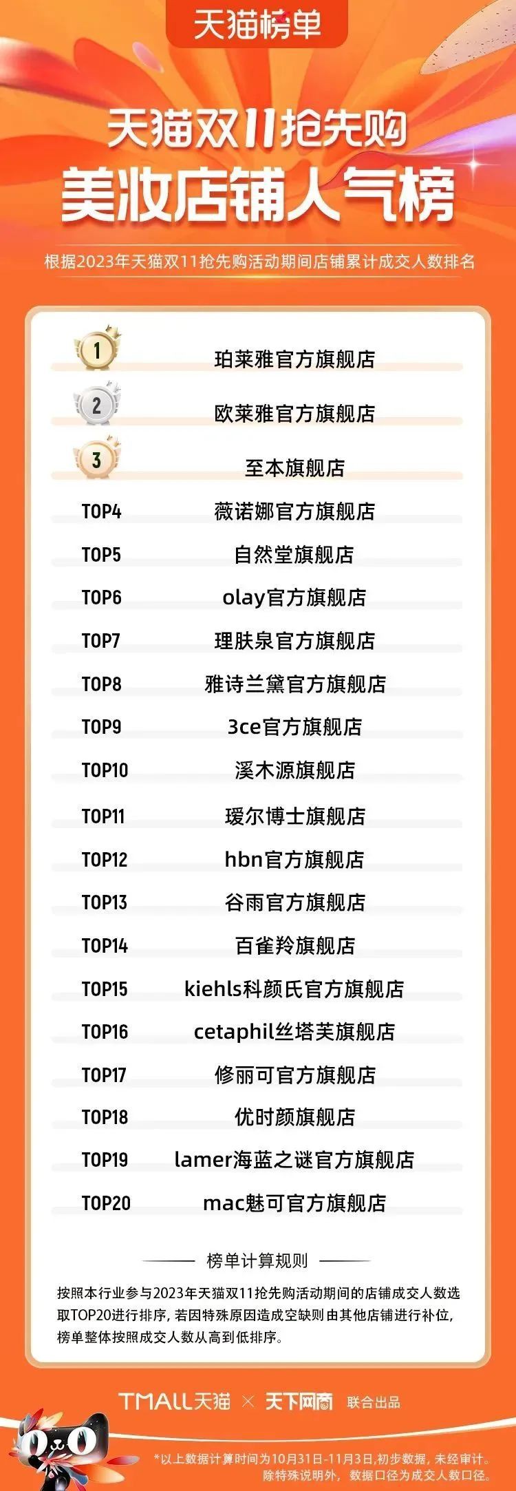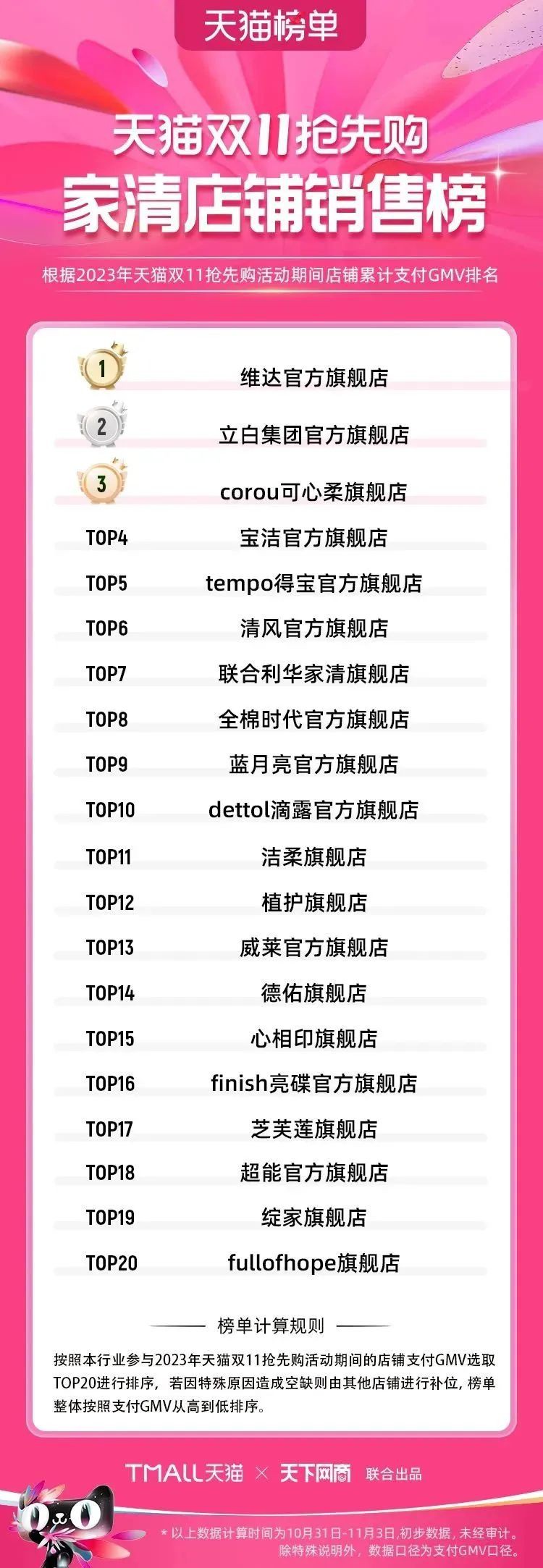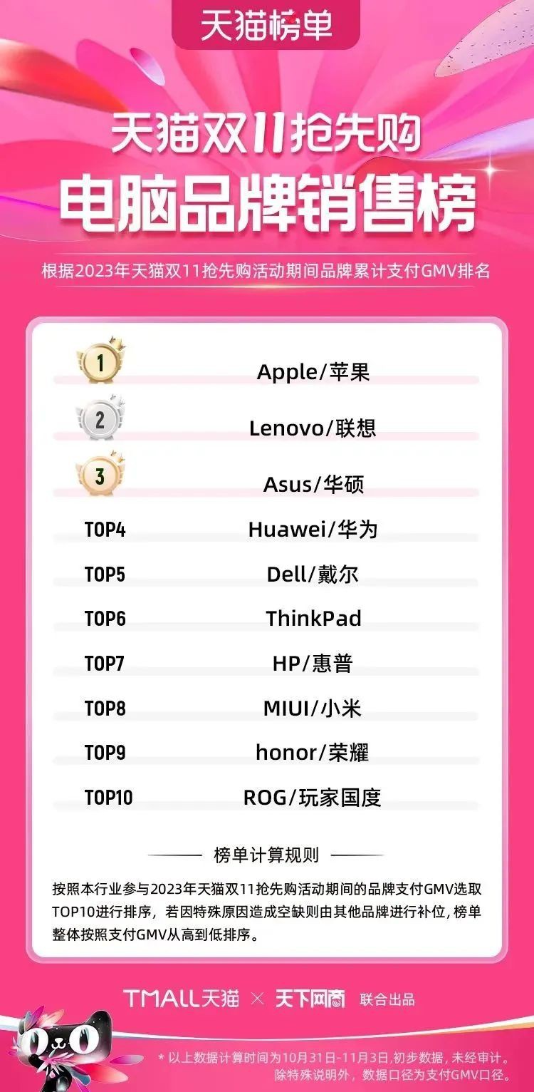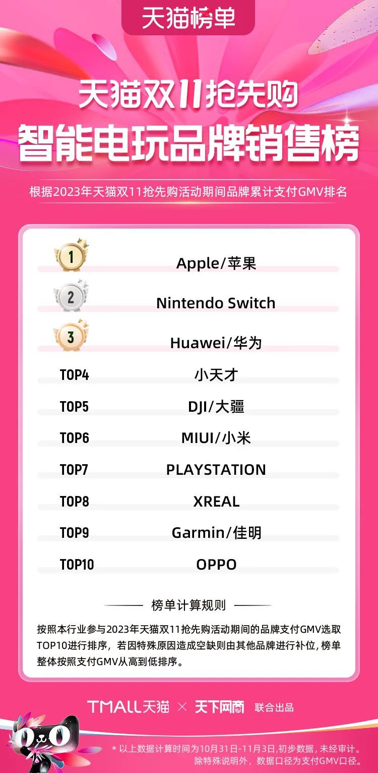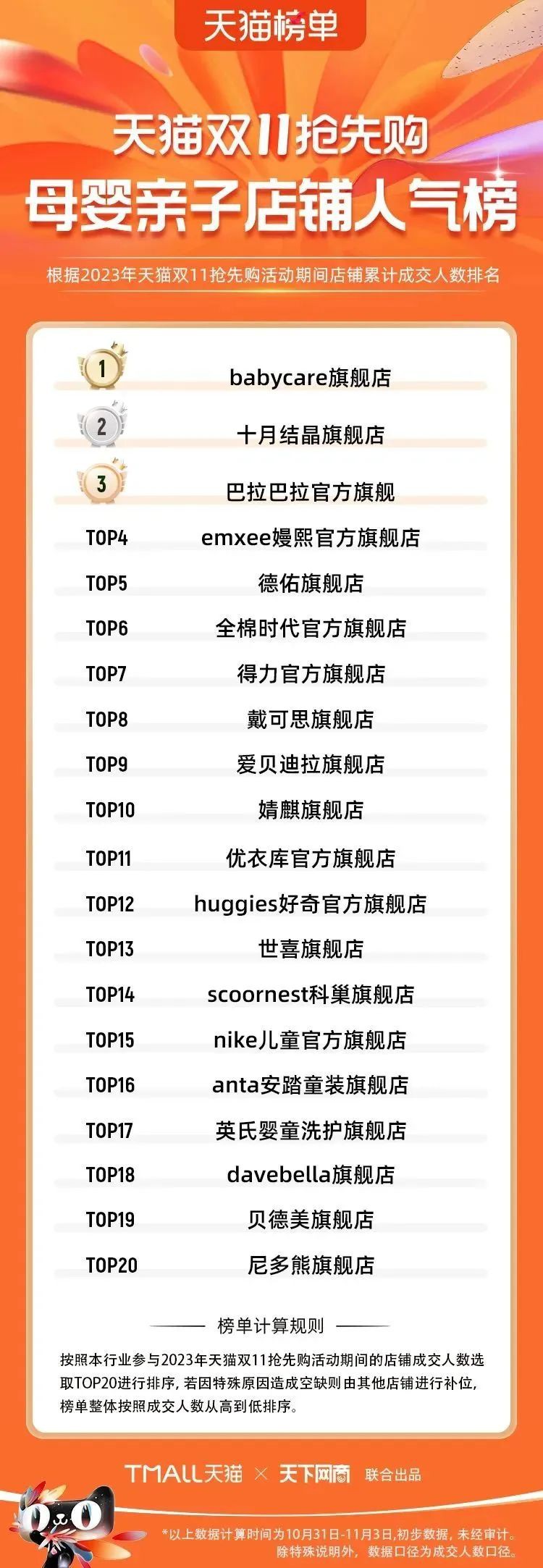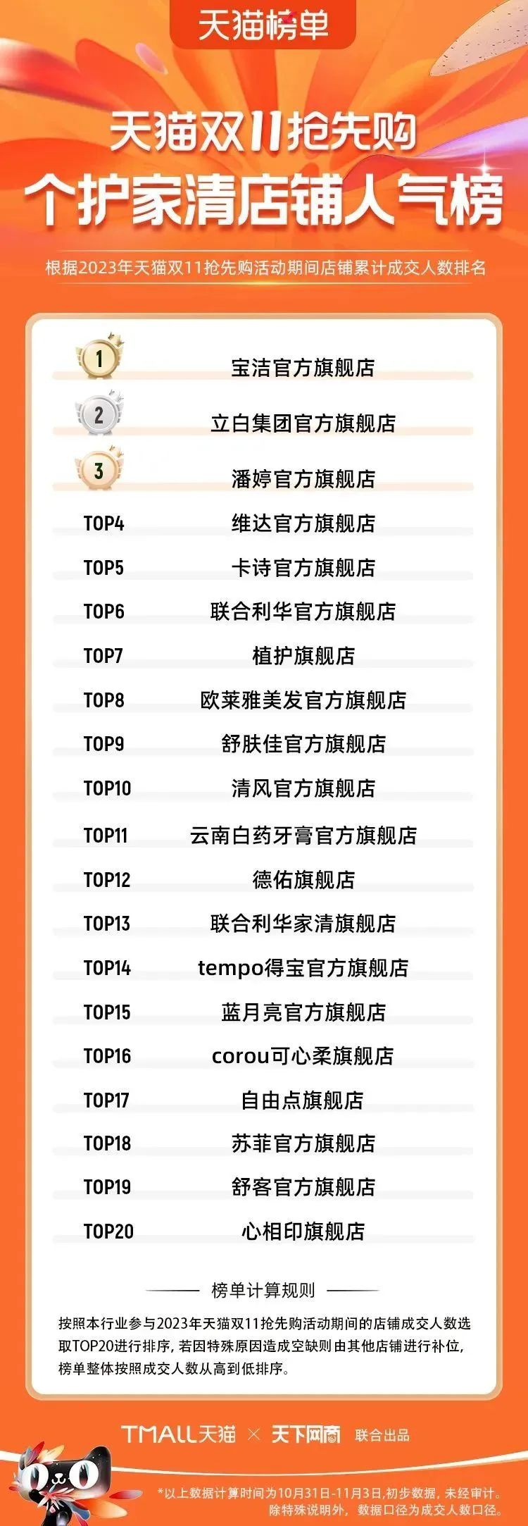 2023年天貓雙11強(qiáng)勁開局,第一波剛開售155個(gè)品牌開賣成交即破億,開售首小時(shí)7.19萬(wàn)個(gè)品牌成交額超去年首日全天。 11月4日,天貓雙11發(fā)布第一階段(10月31日-11月3日)品牌商家成交金額排行榜及品牌商家成交人數(shù)排行榜,大快消、服飾、運(yùn)動(dòng)戶外、消費(fèi)電子、家裝家居、玩具潮玩、食品生鮮、汽車等行業(yè)的“領(lǐng)跑者”出爐。 星圖最新數(shù)據(jù)顯示,2023年雙11正式開售首日,淘寶天貓份額占比近6成,市場(chǎng)份額相比去年進(jìn)一步擴(kuò)大。此外,QuestMobile數(shù)據(jù)顯示,2023年10月24日雙11預(yù)售當(dāng)天,淘寶APP活躍用戶數(shù)達(dá)5.07億,為行業(yè)第一,DAU同比增幅超5%。 作為品牌線上經(jīng)營(yíng)的主陣地,天貓雙11前,天貓投入總額20億的“真金白銀”,用于品牌商家經(jīng)營(yíng)激勵(lì),支持品牌以最小的投入,獲得最大的增長(zhǎng)。 以下為天貓雙11第一階段(10月31日-11月3日)榜單: 快消銷售榜 快消人氣榜 服飾時(shí)尚銷售榜 服飾時(shí)尚人氣榜 運(yùn)動(dòng)戶外銷售榜 運(yùn)動(dòng)戶外人氣榜 消費(fèi)電子銷售榜 消費(fèi)電子人氣榜 家裝家居銷售榜 家裝家居人氣榜 玩具潮玩銷售榜 玩具潮玩人氣榜 香氛香薰銷售榜 香氛香薰人氣榜 寵物銷售榜 寵物人氣榜 食品銷售榜 食品人氣榜 汽車人氣榜 汽車銷售榜 生鮮銷售榜 生鮮人氣榜 文教銷售榜 文教人氣榜 珠寶飾品銷售榜 珠寶飾品人氣榜 企業(yè)服務(wù)銷售榜 企業(yè)服務(wù)人氣榜 健康銷售榜 |