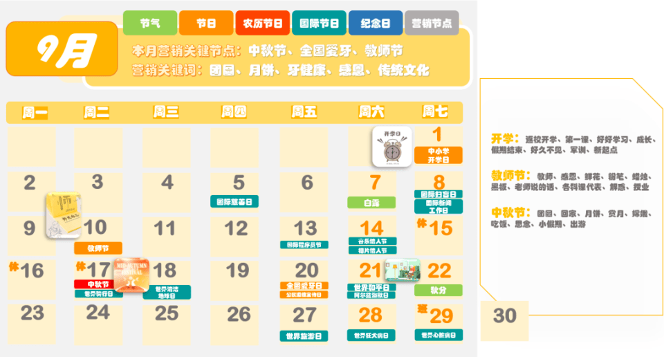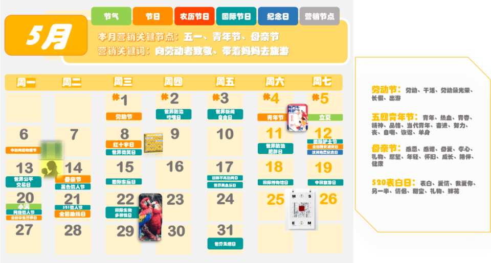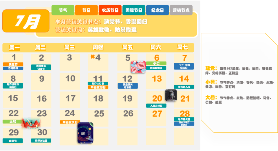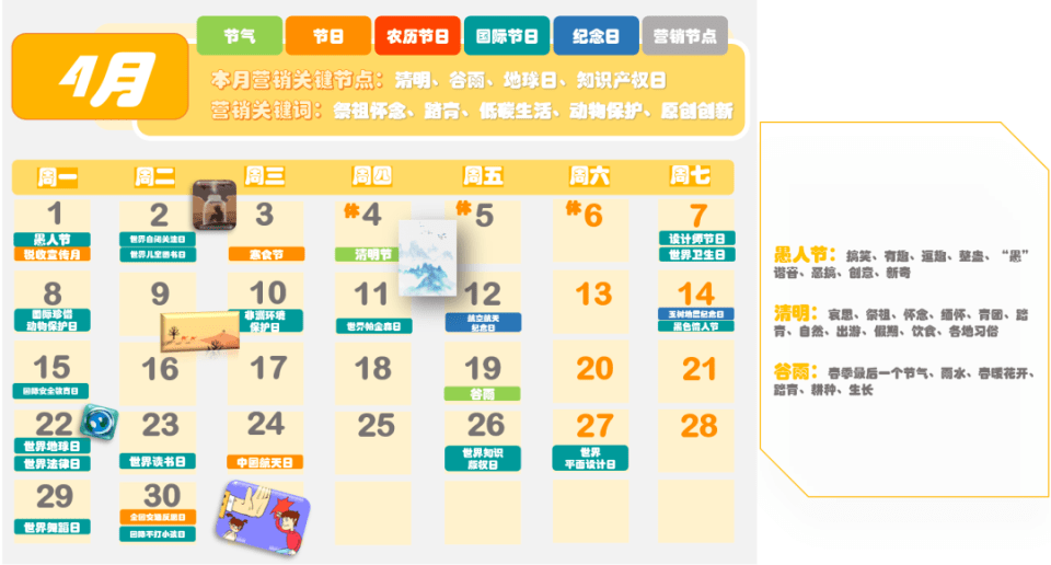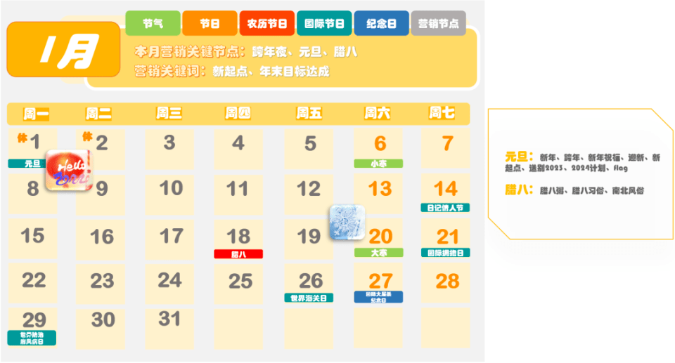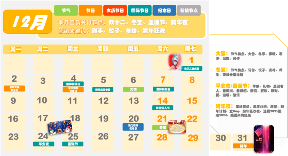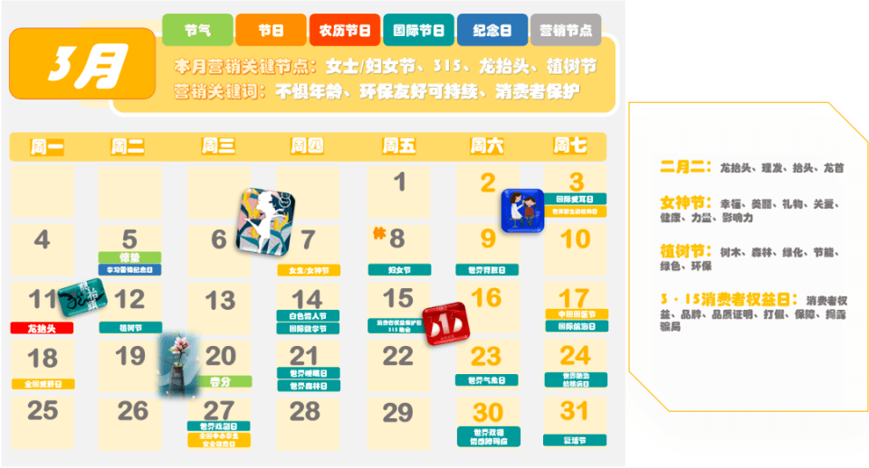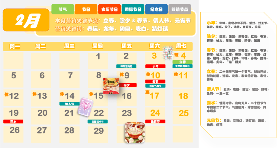 圖來源:時趣 2024年全年營銷日歷,是專門為營銷人員量身定制的日歷,包含了節(jié)氣、節(jié)日、農(nóng)歷節(jié)日、國際節(jié)日、紀(jì)念日以及營銷節(jié)點等信息。對于企業(yè)來說,在新的一年中,除了常規(guī)的春節(jié)、元旦、國慶、中秋等節(jié)日外,還有很多其他的節(jié)日和節(jié)氣可以作為營銷的熱點。 例如,2月14日是情人節(jié),這是一個充滿浪漫氣息的節(jié)日,很多年輕人都期待著在這一天享受到特別的驚喜和待遇。因此,企業(yè)可以在這一天推出浪漫溫馨的主題活動,吸引年輕人的關(guān)注和參與。 3月8日是婦女節(jié),這是一個屬于女性的節(jié)日,企業(yè)可以推出以女性為主題的活動,展示對女性的尊重和關(guān)愛。同時,還可以通過推出特別的產(chǎn)品和服務(wù),滿足女性消費者的需求和期望。 4月1日是愚人節(jié),這是一個充滿趣味和幽默的節(jié)日。企業(yè)可以推出有趣的互動游戲或者搞笑的短片,吸引消費者的眼球,提高品牌的知名度和美譽度。 5月1日是勞動節(jié),這是一個屬于廣大勞動者的節(jié)日。企業(yè)可以推出以勞動者為主題的活動,表達對勞動者的尊重和感謝。同時,還可以通過推出特別的產(chǎn)品和服務(wù),滿足勞動者的需求和期望。 6月1日是兒童節(jié),這是一個屬于孩子們的節(jié)日。企業(yè)可以推出以兒童為主題的活動,為孩子們帶來歡樂和快樂。同時,還可以通過推出特別的產(chǎn)品和服務(wù),滿足孩子們的需求和期望。 除了以上這些節(jié)日和節(jié)氣外,《2024年全年營銷日歷》還包含了其他的節(jié)日和營銷熱點信息。對于企業(yè)來說,了解這些節(jié)日和節(jié)氣的特點和文化背景是非常重要的,這有助于更好地把握市場需求和消費者心理,從而更好地開展?fàn)I銷活動,提高品牌知名度和美譽度。 |