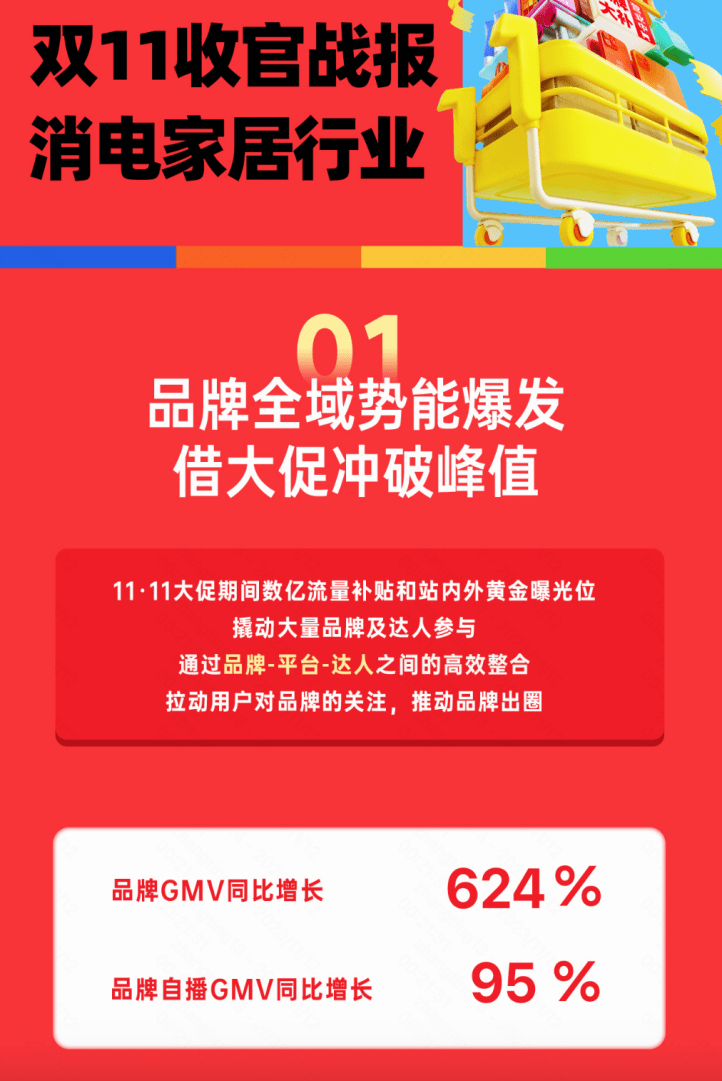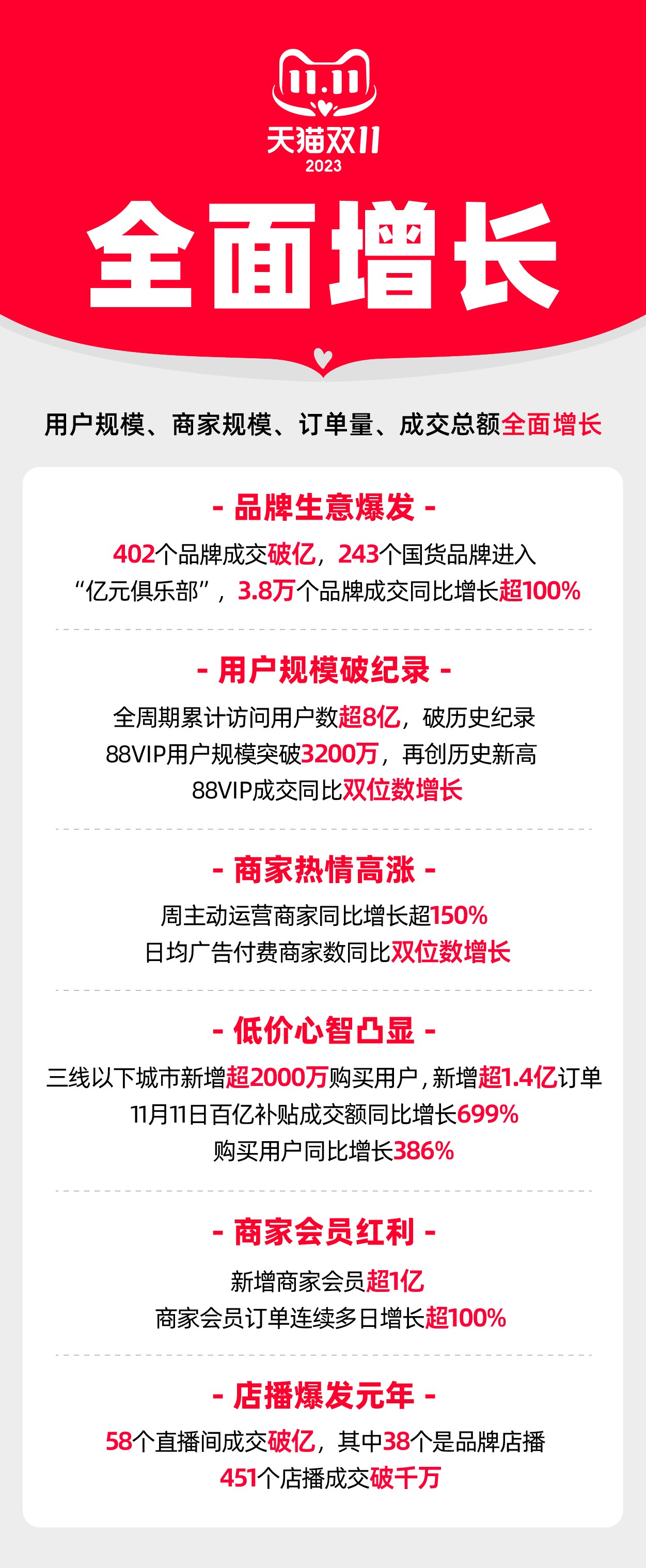 截至11月11日24時,2023雙11正式落下帷幕。 與去年相似,天貓、京東、唯品會、拼多多、抖音、快手等電商直播平臺均未公布具體的交易數(shù)據(jù),各大電商主打“低價”牌,“實用主義”成為今年的主題。 那么,今年的雙11數(shù)據(jù)中有哪些亮點和趨勢呢?讓我們一起來探討一下。 01 天貓雙11 價格力、商家會員、店鋪直播 三大增長新引擎 11月12日0點,2023年天貓雙11完美收官。用戶規(guī)模和商家規(guī)模顯著增長,規(guī)模優(yōu)勢進一步擴大,帶動訂單量和成交總額全面增長,品牌在天貓獲得一年中最重要的一次生意爆發(fā)。 天貓雙11整體數(shù)據(jù): 品牌生意爆發(fā):截至11月11日0點,共有402個品牌成交破億,其中有243個是國貨品牌,3.8萬個品牌成交同比增長超過100%。 價格力效應(yīng):僅三線以下市場,今年天貓雙11就新增了2000余萬購買用戶和超1.4億筆新增訂單。 用戶規(guī)模破紀(jì)錄:全周期累計訪問用戶數(shù)超8億,創(chuàng)下歷史峰值。88vip用戶規(guī)模突破3200萬,再創(chuàng)歷史新高,成交同比雙位數(shù)增長 商家會員紅利:截至11月11日0點,淘寶天貓累計為商家?guī)硇略鰰䥺T規(guī)模超1億,全平臺商家會員規(guī)模同比增長近30%,商家會員訂單連續(xù)多日增長超100%。 店播爆發(fā)元年:截至11月11日0點,全平臺58個破億直播間中,店鋪直播占比超過6成,451個店播成交破千萬,預(yù)售期4小時內(nèi)首次出現(xiàn)成交破億的品牌直播間。 淘寶穩(wěn)居酒水直播第一平臺:11月11日0點,酒水行業(yè)直播成交破18億,成交同比增長628%,帶動國產(chǎn)白酒增長超過250%。茅臺、五糧液等品牌成交破億,郎酒、習(xí)酒等成交增速超100%。 中小商家成交翻倍:截止到11月11日0點,天貓雙11已經(jīng)有超過220萬中小商家實現(xiàn)成交翻倍。200多萬淘寶新商家領(lǐng)取了流量補貼,13萬中小商家獲得了新商流量加速包,菜鳥物流補貼也覆蓋了50萬淘寶中小商家。 各個品類數(shù)據(jù): 美妝品牌:10分鐘,歐萊雅、蘭蔻、雅詩蘭黛等品牌紛紛破億;1小時,25個美妝品牌破億,9款商品實現(xiàn)銷售額破億。 手機數(shù)碼家電:開賣首小時,4791個品牌成交超去年全天。 運動戶外:整個行業(yè)全面爆發(fā),首小時328個品牌成交超去年全天,騎行、滑雪、戶外鞋服同比增長達300%。 服飾行業(yè):1143個品牌首小時成交超去年全天。 奢侈品牌:10月31日20點正式開賣的首小時內(nèi),涌入天貓奢品選購下單的消費者總數(shù)是去年同期的1.5倍。超20家奢侈品牌首小時成交遠(yuǎn)超去年同期全天。 潮玩行業(yè):迪士尼瘋狂動物城新品玩偶、sonnyangel冬日夢境系列盲盒、黑玩旗艦店在天貓獨家首發(fā)的哦崽第四代盲盒紛紛秒罄。萬代官方旗艦店30分鐘超去年全天,寶寶巴士認(rèn)知啟蒙大全成交額破千萬。 家裝家居行業(yè):開售1小時,806個品牌首小時成交超去年全天。林氏木業(yè)、源氏木語、全友、喜臨門、九牧、顧家、芝華仕、TATA等紛紛破億。 02 京東雙11 成交額、訂單量、用戶數(shù)齊創(chuàng)新高 截至11月11日晚23:59,2023年京東11.11成交額、訂單量、用戶數(shù)齊創(chuàng)新高,京東采銷直播火爆出圈,京東采銷直播的總觀看人數(shù)已突破3.8億。 “9塊9包郵”、“京東百億補貼”、“京東秒殺”為品牌和商家打造了一個又一個增量場,目前累計超過60個品牌銷售破10億元,近20000個品牌成交額同比增長超3倍,新商家成交單量環(huán)比增長超5倍。 京東零售CEO辛利軍在開放日上表示,京東的低價,始終是在為消費者提供更豐富的低價商品的同時,更有品質(zhì)和服務(wù)作為支撐。京東采銷直播通過“不收坑位費、不收達人傭金”的方式,希望能夠讓品牌廠商、讓產(chǎn)業(yè)鏈上下游都能夠賺到錢,也讓消費者可以最大程度的享受到實惠。 京東雙11整體數(shù)據(jù): 全面低價舉措:10月31日晚8點開啟的京東11.11百億補貼日,開賣不到4分鐘,頻道成交額即破億;在11月2日啟動的“9.9包郵日”,京東9.9包郵頻道全天訂單量較今年京東618當(dāng)天增長超35倍,購物用戶數(shù)提升超28倍。 商家數(shù)量再破紀(jì)錄:參加京東11.11的商家數(shù)量再破紀(jì)錄,較去年同期增長超1.5倍,京東也為廣大消費者帶來了超5億件新品。 物流服務(wù)方面:10月23日從京東物流亞洲一號青島智能產(chǎn)業(yè)園區(qū)發(fā)出的波司登羽絨服,成為了2023年全國第1000億件快遞。 各個品類數(shù)據(jù): 商超食品:食用油成交額同比增46倍,大米品類增長37倍,面粉品類增長12倍。雞肉成交額同比增長超32倍;低溫奶增長超28倍,餅干增長16倍,常溫奶、咖啡成交額同比增長近13倍,白酒增長19倍;各類預(yù)制菜品類成交額同比增速均超200%。 日常民生:其中洗潔精成交額同比增長47倍,抽紙增長超20倍,成人尿褲增長17倍,衛(wèi)生巾套裝增長11倍。 跨境:429個跨境品牌同比增長超100%,愛他美、雀巢、美贊臣、美素佳兒等跨境母嬰奶粉品牌增長超18倍。 珠寶首飾:10月23日晚8點,珠寶首飾品類成交金額超去年全天8倍。 美妝品:成交額同比增長11倍,其中,乳液面霜成交額同比增長超20倍、面部精華增長超23倍、爽膚水/化妝水增長超10倍、潔面增長超11倍、面膜增長13倍。 手機數(shù)碼:10月23日晚8點,iPhone、小米、榮耀、華為、OPPO、一加、vivo手機成交額1秒破億。 電家居品牌:10分鐘內(nèi)超過100個家電家居品牌