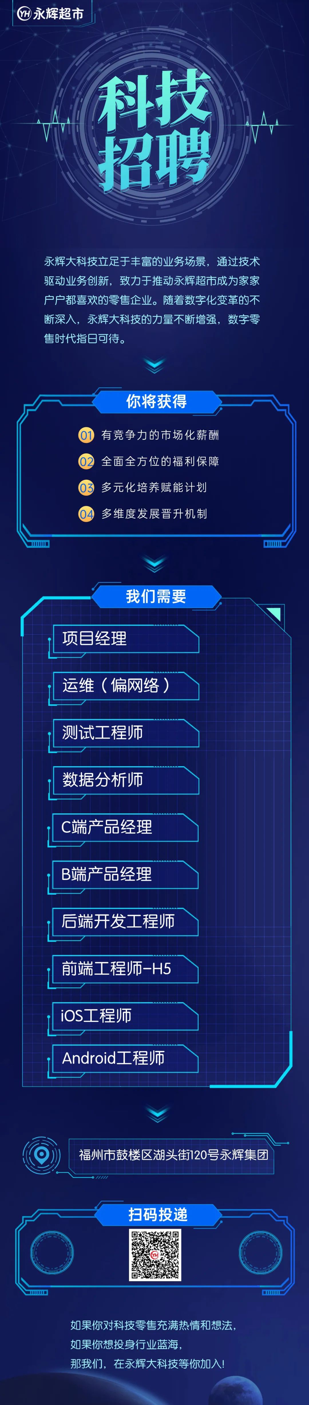 近日,永輝超市公開(kāi)招募高端科技專(zhuān)項(xiàng)人才,此次招聘涉及項(xiàng)目經(jīng)理、運(yùn)維(偏網(wǎng)絡(luò))、質(zhì)量工程師、數(shù)據(jù)分析師、C端產(chǎn)品經(jīng)理、B端產(chǎn)品經(jīng)理、后端開(kāi)發(fā)工程師、前端工程師-H5、Android工程師、IOS工程師等崗位,工作地點(diǎn)為福州市鼓樓區(qū)湖頭街120號(hào)永輝集團(tuán)。 永輝集團(tuán),立足總部福州,遍布全國(guó)近600個(gè)城市,以滿(mǎn)足用戶(hù)多場(chǎng)景消費(fèi)需求為導(dǎo)向,發(fā)力品牌年輕化,營(yíng)造好逛、好玩的新型門(mén)店,建立起質(zhì)量更高、效率更高的線上線下全渠道運(yùn)營(yíng)體系。永輝大科技致力于為實(shí)現(xiàn)豐富的業(yè)務(wù)場(chǎng)景,通過(guò)技術(shù)驅(qū)動(dòng)業(yè)務(wù)創(chuàng)新,推動(dòng)永輝超市成為以生鮮為基礎(chǔ),以客戶(hù)為中心的全渠道科技零售平臺(tái)。 |