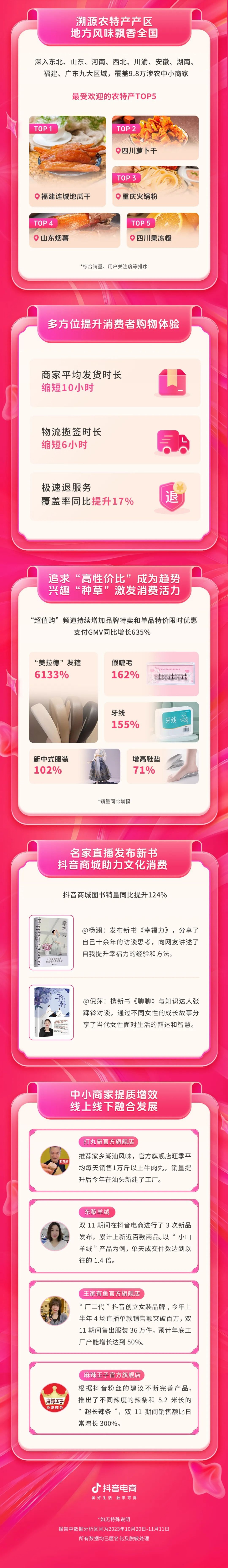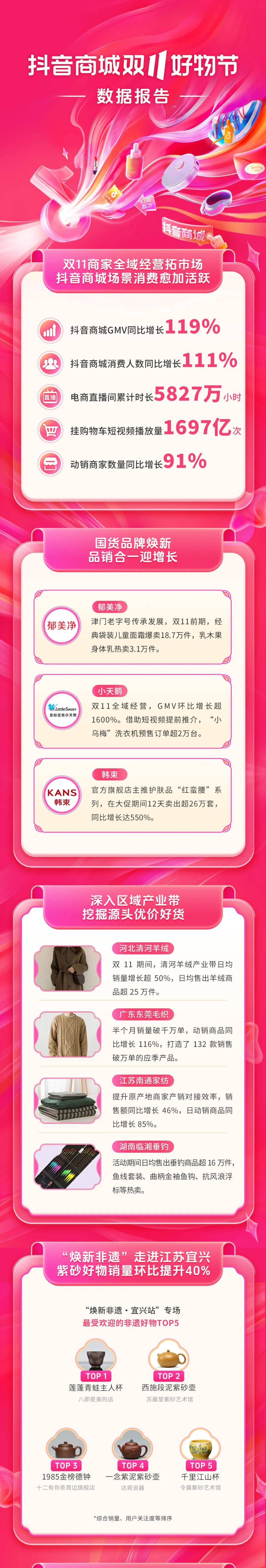 截至11月12日零點,抖音商城雙11好物節(jié)正式收官!抖音商城雙11戰(zhàn)績,GMV雙11同期增長119%! 今年雙11,抖音電商無疑成為海量商家尋找生意增量的重要戰(zhàn)場。2023年抖音商城雙11好物節(jié)期間,抖音電商支付GMV較去年雙11同期增長119%,增速超過預(yù)期;抖音商城消費人數(shù)同比增長111%,平臺記錄再度刷新。與此同時,消費者購物體驗也有所升級,數(shù)據(jù)顯示,10月20日至11月11日,參加大促活動的商家平均發(fā)貨時長縮短10小時,物流攬簽時長縮短6小時,平臺“極速退”服務(wù)覆蓋率同比提升17%。 全域營銷玩法、財經(jīng)玩法、售后保障的重磅升級,為消費者提供優(yōu)價好物、優(yōu)質(zhì)服務(wù)的同時,也為商家提供了生意爆發(fā)的機會。活動期間,動銷商家數(shù)較去年雙11同期提升91%,抖音電商直播間累計時長5827萬小時,掛購物車短視頻播放量1697億次。借勢平臺全域勢能,眾多商家、達(dá)人收獲大促生意爆發(fā)。 多元核心玩法 打爆商家貨架生意 抖音商城作為抖音電商的重要經(jīng)營陣地,也是抖音商城雙11好物節(jié)的重頭戲、爆發(fā)點。活動期間,抖音電商推出「定金預(yù)售」、「官方立減」、「重點貨品」、「抖音旗艦-商家會員」、「超值購」、「低價秒殺」等多元玩法和特色促銷頻道,為商家提供多種補貼和曝光資源扶持,吸引更多消費人群,幫助商家快速打造全平臺爆款。 在多元玩法的加持下,活動期間,抖音商城支付GMV同比去年雙11提升119%,抖音商城消費人數(shù)同比去年雙11增長111%。其中,在「重點貨品」、「官方立減」、「定金預(yù)售」等玩法加持下,爆品好物成為驅(qū)動生意增長的引擎力量。 同時,抖音商城的「低價秒殺」頻道,以爆款好物疊加價格優(yōu)勢,在短時間內(nèi)帶動商家拉新打爆;而通過0.01元鎖定贈品、大額券抽獎、大額優(yōu)惠券等形式沉淀品牌會員的「抖音旗艦-商家會員」玩法,也成為商家創(chuàng)造增量的重點動作之一。 此外,大促也為品牌商家創(chuàng)造了更廣闊的發(fā)展空間。抖音商城「超值購」為商家商品帶來搜索、推薦、店鋪等全場景的億級曝光流量資源,超值購支付GMV同比去年雙11提升635%。其中,迎合今冬時尚風(fēng)潮的“美拉德”發(fā)箍,銷量相比去年同期增長6133%;國潮流行下的新中式服裝,銷量相比去年同期增長102%;而家居必備的假睫毛和牙線,銷量相比去年同期分別上漲162%、155%。今年雙11,高性價比、流行的優(yōu)質(zhì)好物成為消費者的心頭好。 聚焦人群增長 助力商家持續(xù)拉新拓客 每逢大促,商家競相爭“流”,搶奪用戶注意力,以提升種草人群規(guī)模,獲得更多生意增量。活動期間,抖音電商從流量扶持、曝光資源、新客增長等維度出發(fā),推出「好物直播間」、「大咖直播間」、「直播任務(wù)賽」、「百萬單品計劃」、「商家拉新激勵賽」等多元玩法,助力品牌提升經(jīng)營客群規(guī)模,實現(xiàn)生意爆發(fā)。 大促期間,抖音電商內(nèi)容場景優(yōu)勢顯著。數(shù)據(jù)顯示,電商直播間累計時長達(dá)5827萬小時,而在短視頻領(lǐng)域,掛購物車短視頻播放量累計達(dá)到1697億。其中,小天鵝品牌借助短視頻提前推介,在抖音商城雙11好物節(jié)期間,“小烏梅”洗衣機預(yù)售訂單超2萬臺。 同時,為了進一步釋放內(nèi)容種草力,抖音電商推出了「好物直播間」、「大咖直播間」等內(nèi)容玩法,通過直播間運營扶持、貨品補貼,助力商家更好地通過興趣內(nèi)容實現(xiàn)銷售轉(zhuǎn)化。直播對助力中小商家提質(zhì)增效帶動明顯,@王家有魚官方旗艦店 2023年上半年,4場直播單款銷售額突破百萬,雙11期間售出服裝36萬件,預(yù)計帶動工廠產(chǎn)能增長達(dá)到50%。 而「直播任務(wù)賽」、「百萬單品計劃」、「商家拉新激勵賽」等玩法,則以紅包、流量、禮金等福利為獎勵,鼓勵商家、達(dá)人產(chǎn)出優(yōu)質(zhì)內(nèi)容,通過更豐富的創(chuàng)意,提升內(nèi)容的吸引力,觸達(dá)更廣泛的群體。 全域協(xié)同 這些品牌好物喜迎生意爆發(fā) 雙11這個下半年最重要的購物狂歡節(jié),也是商家們?nèi)曜钪匾纳獗l(fā)時刻。在這個充滿機遇和挑戰(zhàn)的關(guān)鍵節(jié)點,無數(shù)品牌商家通過抖音商城雙11好物節(jié),乘風(fēng)而起,實現(xiàn)生意躍遷。今年,又有哪些品牌、商品閃耀雙11? 大促期間,國貨品牌生意增長十分可觀。“津門老字號”國貨郁美凈,雙11前期,經(jīng)典袋裝兒童面霜爆賣18.7萬件,乳木果身體乳熱賣3.1萬件;而國貨美妝品牌韓束在大促期間也是漲勢喜人,主推護膚品“紅蠻腰”系列,12天賣出超26萬套,同比增長達(dá)550%。 除國貨品牌外,各地的優(yōu)質(zhì)源頭好物也伴隨大促熱潮走進千家萬戶。福建連城地瓜干、四川蘿卜干、重慶火鍋粉、山東煙薯、四川果凍橙成為抖音商城最受歡迎的農(nóng)特產(chǎn)TOP5,除了產(chǎn)地美食外,產(chǎn)業(yè)帶的秋冬保暖單品也倍受消費者喜愛。雙11期間,河北清河羊絨產(chǎn)業(yè)帶日均銷量增長超50%,日均售出羊絨商品超25萬;廣東東莞毛織半個月銷量破千萬單,動銷商品同比增長116%,打造了132款銷售破萬單的應(yīng)季產(chǎn)品。 而在競爭尤為激烈的美妝日化行業(yè),也有品牌借助抖音電商貨架場景的勢能,利用爆款好物撬動新的生意增量。如花至旗艦店,通