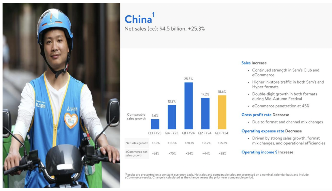 本文來源 / 小食代 11月16日,沃爾瑪發(fā)布2024財(cái)年第三季度(截至2023年10月31日),總營收達(dá)到了1608億美元(約合人民幣11657億元),同比增長5.2%;調(diào)整后營業(yè)利潤為62億美元(約合人民幣449.48億元),同比增長3%。 在中國市場(chǎng)的凈銷售45億美元(約合人民幣326.24億元),同比增長25.3%;可比銷售額增長18.6%;電商凈銷售同比上升38%。然后,毛利率出現(xiàn)下滑,受業(yè)態(tài)和渠道組合變化影響。在中國市場(chǎng)山姆會(huì)員店和電商繼續(xù)帶來了增長動(dòng)力,其中電商業(yè)務(wù)滲透率已達(dá)45%。 分業(yè)態(tài)來看,山姆和大賣場(chǎng)的到店客流量均有上升,兩種業(yè)態(tài)在中秋節(jié)期間銷售都錄得雙位數(shù)增長。 沃爾瑪全球首席執(zhí)行官董明倫(Doug McMillon)在分析師會(huì)議上講道,本季度的早些時(shí)候,我第一次在疫情后重返中國。在疫情前,我們的團(tuán)隊(duì)就在中國經(jīng)營著一些世界上(好到)令人不可思議的山姆店。在數(shù)字化滲透和創(chuàng)新方面,中國一直是公司里的“領(lǐng)導(dǎo)者”。 |