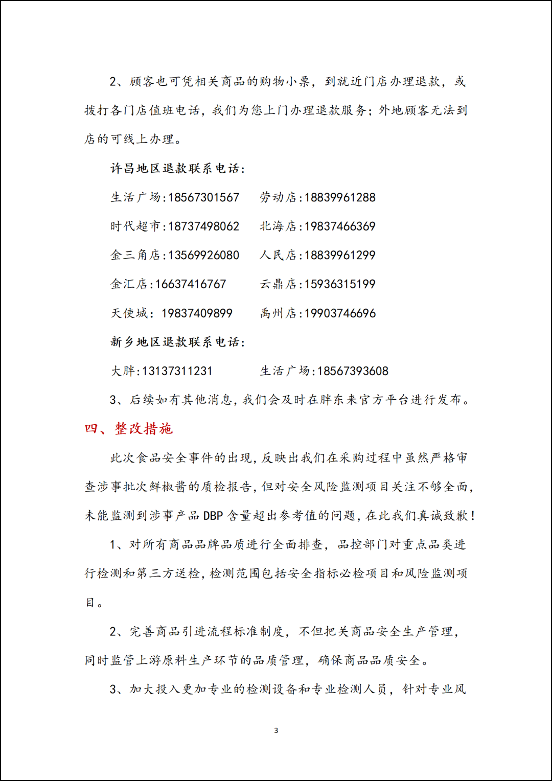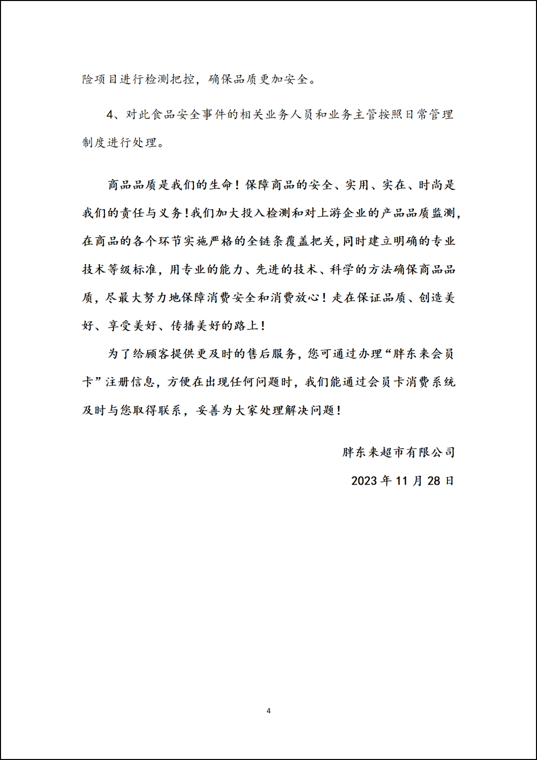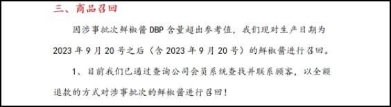 繼“東北農(nóng)嫂甜玉米”事件之后,胖東來又一次宣布召回商品。 《零售網(wǎng)》獲悉,11月28日,新鄉(xiāng)胖東來超市在官方微信公眾號(hào)發(fā)布了一份關(guān)于“山海好兄弟鮮椒醬”的召回公告。 公告中指出,由于鮮椒醬DBP含量超過了參考值,胖東來決定以全額退款的方式進(jìn)行召回。同時(shí),他們向消費(fèi)者表示了誠摯的歉意,并公布了一些整改措施。 這已經(jīng)不是胖東來第一次進(jìn)行商品召回了。之前,他們?cè)驗(yàn)椤皷|北農(nóng)嫂甜玉米”和“沙土牌話梅味西瓜子”的價(jià)格事件進(jìn)行了商品召回并全額退款。 而這次“山海好兄弟鮮椒醬”召回事件,胖東來從事情起因、調(diào)查經(jīng)過、商品召回、整改措施等方面的公開透明,體現(xiàn)了胖東來的認(rèn)真、專業(yè)和嚴(yán)謹(jǐn)態(tài)度。 胖東來對(duì)這次召回事件進(jìn)行了深入的調(diào)查,還制作了一份長達(dá)4頁的調(diào)查報(bào)告,這無疑也超市同行樹立了一個(gè)典范。 以下為原文: 一、事件起因 河南省市場(chǎng)監(jiān)督管理局按照《2023 年河南食品安全風(fēng)險(xiǎn)監(jiān)測(cè)計(jì)劃》有關(guān)要求,2023年10月09日,對(duì)胖東來新鄉(xiāng)大胖店經(jīng)銷的山海好兄弟鮮椒醬(微辣) 進(jìn)行安全風(fēng)險(xiǎn)監(jiān)測(cè),結(jié)果顯示樣品中鄰苯二甲酸二丁醋 (DBP) 實(shí)測(cè)值為1.20mg/kg,高于參考值≤0.3 mg/kg,為問題樣品。 二、調(diào)查經(jīng)過 我們收到市場(chǎng)監(jiān)督部門《食品安全抽樣檢驗(yàn)風(fēng)險(xiǎn)隱患告知書》后立即通知下架所有乳山好兄弟食品有限公司生產(chǎn)的相關(guān)產(chǎn)品,將庫存的商品進(jìn)行封存,并成立調(diào)查小組,安排人員到廠家實(shí)地調(diào)查,從原輔料、包裝材料等各方面進(jìn)行排查,并將相關(guān)多批次樣品送至第三方檢測(cè)機(jī)構(gòu)進(jìn)行檢測(cè),全面落實(shí)批次產(chǎn)品風(fēng)險(xiǎn)項(xiàng)目鄰苯二甲酸二丁醋(DBP) 實(shí)測(cè)值高于參考值的原因。 (一) 抽查產(chǎn)品信息 (二) 調(diào)查結(jié)果及原因 檢測(cè)排查結(jié)果為生立日期在 2023年9月20號(hào)之后的鮮椒醬生產(chǎn)原料中的黃豆醬 DBP 含量高于參考值 0.3mg/kg,其原因?yàn)辄S豆醬在生產(chǎn)或儲(chǔ)存運(yùn)輸過程中,由所接觸的塑料類器具遷移到食品中引起。 (三) 對(duì)于鄰苯二甲酸二丁醋 (DBP) 的補(bǔ)充說明 鄰苯二甲酸二丁醋 (DBP) 為增塑劑?捎糜谑称钒b材料,不是食品原料,也不是食品添加劑。按照我國目前食品容器、包裝材料用添加劑使用衛(wèi)生標(biāo)準(zhǔn),DBP 遷移到食品中的最大量不得超過0.3mg/kg。 據(jù)食品安全標(biāo)準(zhǔn)與監(jiān)測(cè)評(píng)估司官方網(wǎng)站顯示: 1、DBP 急性毒性較低。動(dòng)物實(shí)驗(yàn)表明 DBP 具有內(nèi)分泌干擾作用嚙齒類動(dòng)物長期攝入該類物質(zhì)可造成生殖和發(fā)育障礙,但目前尚缺乏臨床案例及人體健康損害的直接證據(jù),也沒有證據(jù)表明其具有致癌作用。動(dòng)物試驗(yàn)發(fā)現(xiàn),絕大部分 DBP 在 24-48 小時(shí)內(nèi)會(huì)隨尿液或糞便排出體外,一般不會(huì)在體內(nèi)蓄積。 2、國家食品安全風(fēng)險(xiǎn)評(píng)估專家委員會(huì)通過檢索國際權(quán)威網(wǎng)站分析科學(xué)文獻(xiàn)資料后認(rèn)為,對(duì)于 60kg 體重的人來講,每天攝入不超過 0.6mg 的 DBP 是安全的。根據(jù)本次《食品安全風(fēng)險(xiǎn)監(jiān)測(cè)檢驗(yàn)報(bào)告》顯示,“山海好兄弟鮮椒醬”(規(guī)格: 225g/瓶)DBP 實(shí)測(cè)值為 1.2mg/kg:即每人每日食用不超過 500g (約 2 瓶)的“山海好兄弟鮮椒醬”不會(huì)超過安全值。 三、商品召回 因涉事批次鮮椒醬DBP含量超出參考值,我們現(xiàn)對(duì)生產(chǎn)日期為2023年9月20號(hào)之后 (含 2023 年9月20號(hào)) 的鮮椒醬進(jìn)行召回。 1、目前我們已通過查詢公司會(huì)員系統(tǒng)查找并聯(lián)系顧客,以全額退款的方式對(duì)涉事批次的鮮椒醬進(jìn)行召回! 2、顧客也可憑相關(guān)商品的購物小票,到就近門店辦理退款,或撥打各門店值班電話,我們?yōu)槟祥T辦理退款服務(wù),外地顧客無法到店的可線上辦理。 3、后續(xù)如有其他消息,我們會(huì)及時(shí)在胖東來官方平臺(tái)進(jìn)行發(fā)布。 四、整改措施 此次食品安全事件的出現(xiàn),反映出我們?cè)诓少忂^程中雖然嚴(yán)格審查涉事批次鮮椒醬的質(zhì)檢報(bào)告,但對(duì)安全風(fēng)險(xiǎn)監(jiān)測(cè)項(xiàng)目關(guān)注不夠全面未能監(jiān)測(cè)到涉事產(chǎn)品DBP含量超出參考值的問題。在此我們真誠致歉! 1、對(duì)所有商品品牌品質(zhì)進(jìn)行全面排查,品控部門對(duì)重點(diǎn)品類進(jìn)行檢測(cè)和第三方送檢。檢測(cè)范圍包括安全指標(biāo)必檢項(xiàng)目和風(fēng)險(xiǎn)監(jiān)測(cè)項(xiàng)項(xiàng)目。 2、完善商品引進(jìn)流程標(biāo)準(zhǔn)制度,不但把關(guān)商品安全生產(chǎn)管理同時(shí)監(jiān)管上游原料生產(chǎn)環(huán)節(jié)的品質(zhì)管理,確保商品品質(zhì)安全。 3、加大投入更加專業(yè)的檢測(cè)設(shè)備和專業(yè)檢測(cè)人員,針對(duì)專業(yè)風(fēng)險(xiǎn)項(xiàng)目進(jìn)行檢測(cè)把控,確保品質(zhì)更加安全。 4、對(du