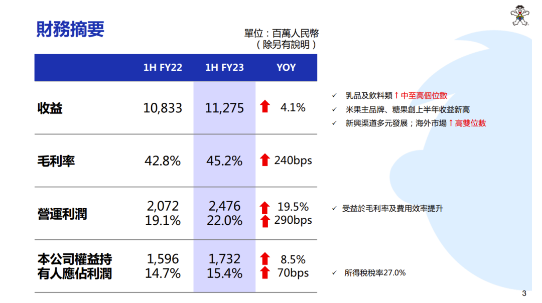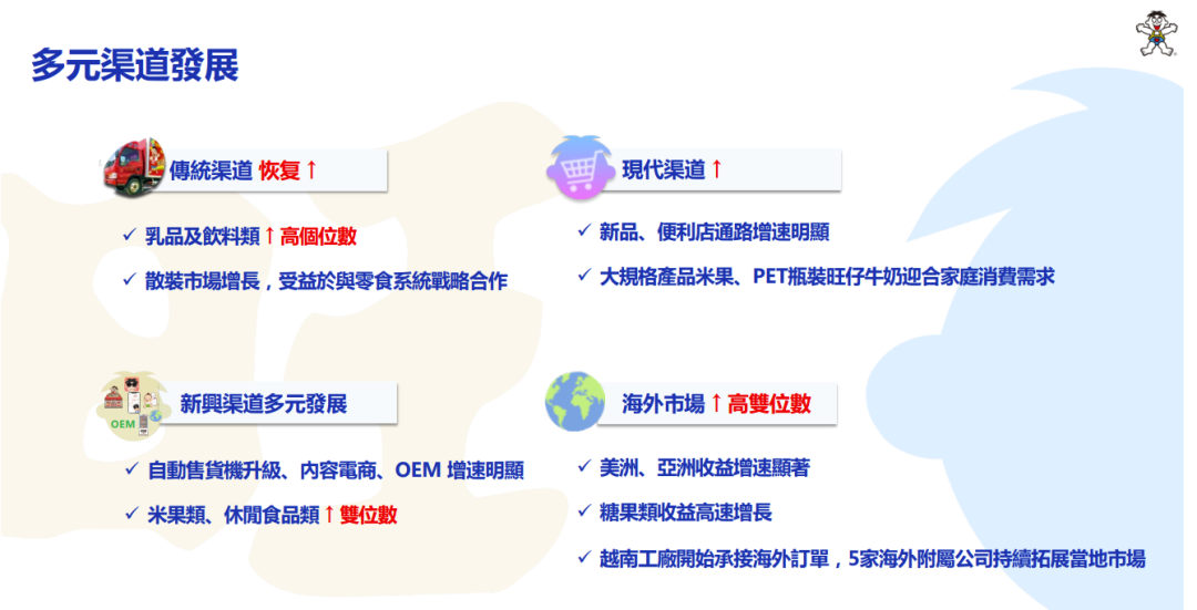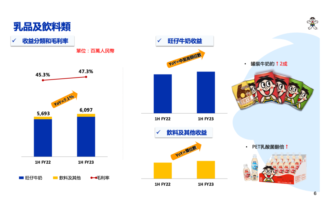 本文來源 / 食品板(tyjspb) 11月28日,中國(guó)旺旺發(fā)布2023財(cái)年上半年財(cái)報(bào)。半年報(bào)顯示,報(bào)告期內(nèi)總收益達(dá)112.748億元,同比增長(zhǎng)4.1%。公司權(quán)益持有人應(yīng)占利潤(rùn)17.322億元,同比增長(zhǎng)8.5%。 1、旺仔牛奶半年?duì)I收破50億 報(bào)告顯示,2023財(cái)年上半年,乳品及飲料大類收益同比成長(zhǎng)7.1%,達(dá)到60.967億人民幣。其中「旺仔牛奶」收益同比成長(zhǎng)中至高個(gè)位數(shù),主要受益于「罐裝牛奶」同比成長(zhǎng)約2成。 旺旺解釋稱,“乳品類銷售恢復(fù)增長(zhǎng),系針對(duì)罐裝牛奶打造多元生動(dòng)的終端陳列場(chǎng)景,及餐飲和自販機(jī)等終端需求恢復(fù)!卑l(fā)展至今,旺仔牛奶為中國(guó)旺旺貢獻(xiàn)了超百億的營(yíng)收,并組建了罐裝、利樂裝、PET瓶裝等多規(guī)格產(chǎn)品,持續(xù)向多場(chǎng)景、全渠道發(fā)力。 2、pet乳酸菌飲料實(shí)現(xiàn)翻倍增長(zhǎng) 同時(shí),旺旺飲料類產(chǎn)品亦取得突破性收益增長(zhǎng),系業(yè)務(wù)組織的調(diào)整及市場(chǎng)的精耕。 產(chǎn)品方面「旺旺O泡」表現(xiàn)良好,同時(shí)「PET乳酸菌」飲料推出「開蓋掃碼百分百中獎(jiǎng)」?fàn)I銷活動(dòng),利用在線廣告片投放和線下海報(bào)展示等營(yíng)銷策略,增加與消費(fèi)者的品牌互動(dòng),令「PET乳酸菌」飲料收益較去年同期翻倍成長(zhǎng)。 3、點(diǎn)名表?yè)P(yáng)零食量販、家庭消費(fèi)等渠道 同時(shí),中國(guó)旺旺也開啟了多元渠道的精耕。2023財(cái)年上半年,新興渠道持續(xù)推進(jìn)多元化發(fā)展,拓展終端網(wǎng)點(diǎn)覆蓋,其中自動(dòng)售貨機(jī)機(jī)器升級(jí)、內(nèi)容電商、OEM以及新興零食量販等渠道增速顯著;米果類與休閑食品類保持雙位數(shù)成長(zhǎng)。 其中,2023財(cái)年上半年現(xiàn)代渠道收益同比成長(zhǎng),其中新品及便利店通路增速明顯。新推出的1公斤裝「雪餅」、「仙貝」大規(guī)格產(chǎn)品及PET瓶裝「旺仔牛奶」新品等,迎合了消費(fèi)者家庭消費(fèi)的需求。 |