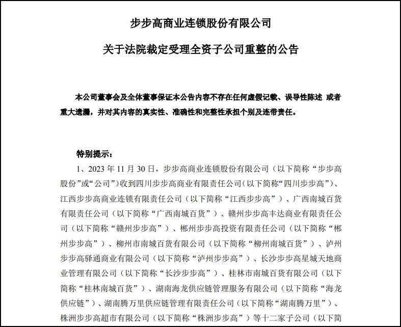 12月1日,步步高商業(yè)連鎖股份有限公司公告稱,11月30日,公司收到四川步步高等十二家子公司轉(zhuǎn)發(fā)的(2023)湘03破申15-26號《民事裁定書》,湘潭中院依法裁定受理四川步步高等十二家子公司重整。 據(jù)了解到,四川步步高等十二家子公司分別為四川步步高商業(yè)有限責(zé)任公司、江西步步高商業(yè)連鎖有限責(zé)任公司、廣西南城百貨有限責(zé)任公司、贛州步步高豐達(dá)商業(yè)有限責(zé)任公司、郴州步步高投資有限責(zé)任公司、柳州市南城百貨有限公司、瀘州步步高驛通商業(yè)有限公司、長沙步步高星城天地商業(yè)管理有限公司、桂林市南城百貨有限公司、湖南海龍供應(yīng)鏈管理服務(wù)有限公司、湖南騰萬里供應(yīng)鏈管理有限責(zé)任公司、株洲步步高超市有限公司。 湖南湘潭中院認(rèn)為,上述四川步步高等十二家子公司雖然不能清償?shù)狡趥鶆?wù),并且資產(chǎn)不足以清償全部債務(wù),但其母公司步步高股份常年深耕百貨、超市等業(yè)務(wù),具有豐富的經(jīng)驗(yàn),在湖南地區(qū)具有較強(qiáng)的競爭優(yōu)勢。 目前,步步高股份已進(jìn)入重整程序,有望通過重整程序化解風(fēng)險,四川步步高等十二家子公司依托步步高股份良好的品牌形象和豐富的經(jīng)營經(jīng)驗(yàn),商業(yè)綜合體管理服務(wù)專業(yè)化程度高,運(yùn)營模式成熟,如能夠和母公司協(xié)同重整,統(tǒng)籌利用母公司償債資源提高債權(quán)清償率,并協(xié)同母公司通過引戰(zhàn)等方式補(bǔ)充增量資源,預(yù)計能夠改善經(jīng)營狀況,進(jìn)一步提升運(yùn)營管理能力,提高經(jīng)營效益,因此四川步步高等十二家子公司具備重整價值,有重整可能,符合破產(chǎn)重整條件。 |