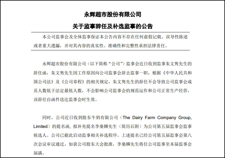 12月4日消息,近日,永輝超市發(fā)布公告稱,永輝超市監(jiān)事會(huì)近日收到監(jiān)事朱文雋先生的辭任函,朱文雋先生因工作原因向公司監(jiān)事會(huì)辭去監(jiān)事一職。 公告中表示,根據(jù)相關(guān)規(guī)定,朱文雋先生的辭任不會(huì)導(dǎo)致公司監(jiān)事會(huì)成員人數(shù)低于法定最低人數(shù),不會(huì)影響公司監(jiān)事會(huì)的規(guī)范運(yùn)作和公司正常生產(chǎn)經(jīng)營(yíng),該辭任自函件送達(dá)監(jiān)事會(huì)時(shí)生效。 同時(shí),公司近日收到股東牛奶有限公司(The Dairy Farm Company Group,Limited)的提名函, 擬補(bǔ)充提名李燊韡先生(簡(jiǎn)歷后附)為公司第五屆監(jiān)事會(huì)監(jiān)事候選人。 公告還稱,,公司已據(jù)此啟動(dòng)監(jiān)事相關(guān)補(bǔ)選程序。上述提名已經(jīng)公司第五屆監(jiān)事會(huì)第八次會(huì)議審議通過,如獲公司股東大會(huì)批準(zhǔn),李燊韡先生將任公司監(jiān)事至本屆監(jiān)事會(huì)屆滿。 據(jù)介紹,李燊韡,男,1984 年生,中國(guó)香港籍,畢業(yè)于墨爾本大學(xué),獲商業(yè)(主修會(huì)計(jì)與金融)及法律學(xué)士學(xué)位,具有特許金融分析師專業(yè)資格,F(xiàn)任 DFI 零售集團(tuán)企業(yè)戰(zhàn)略及 yuu 獎(jiǎng)賞計(jì)劃總監(jiān)。 |