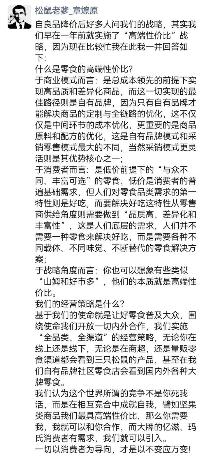 據(jù)證券時報報道,12月3日,三只松鼠創(chuàng)始人、董事長章燎源在朋友圈發(fā)文回應(yīng)良品鋪子降價事項。章燎源表示,公司早在一年前就實施了“高端性價比”戰(zhàn)略。 從商業(yè)模式來說,零食的高端性價比是總成本領(lǐng)先的前提下實現(xiàn)高品質(zhì)和差異化商品,而這一切實現(xiàn)的最佳路徑則是自有品牌,因為只有自有品牌才能解決商品的定制與全鏈路的優(yōu)化,這不僅僅是中間環(huán)節(jié)的成本優(yōu)化,更重要的是商品原料和配方的優(yōu)化,采銷模式更靈活則是其優(yōu)勢核心之一。 對于消費者而言,高端性價比是低價前提下的“與眾不同、豐富可選”的零食,低價是消費者的普遍基礎(chǔ)需求,但人們對零食品類需求的第一特性則是好吃,而要解決好吃這特性從零售商供給角度則需要做到“品質(zhì)高、差異化和豐富性”,人們并不需要一種零食來解決好吃,而是需要各種不同載體、不同味覺、不斷替代的零食解決方案。 從戰(zhàn)略角度來看,零食的高端性價比類似“山姆和好市多”。三只松鼠的使命是讓好零食普及大眾,圍繞使命開放一切內(nèi)外合作,實施“全品類、全渠道”的經(jīng)營策略。在章燎源看來,所謂的競爭不是你死我活,而是在相互競合中成就自我。 11月30日,良品鋪子新上任的董事長、總經(jīng)理楊銀芬發(fā)出全員公開信,提出良品鋪子圍繞“強化業(yè)務(wù)創(chuàng)新,全面提升經(jīng)營效率”這一主題,啟動新一輪改革。作為這項改革的核心內(nèi)容之一,在業(yè)務(wù)端,良品鋪子圍繞“降價不降質(zhì)”這一原則,同步實施17年來首次最大規(guī)模降價,300款產(chǎn)品平均降價22%,最高降幅45%。 三只松鼠三季度報告顯示,公司前三季度的營業(yè)收入為45.82億元,同比減少14.07%。歸屬于上市公司股東的凈利潤為1.70億元,同比增加81.42%。 相較而言,良品鋪子今年前三季度營收凈利雙雙下降,實現(xiàn)營收59.99億元,同比下降14.33%;凈利潤1.91億元,同比下降33.43%。其中第三季度凈利潤同比更是跌去97.88%。 |