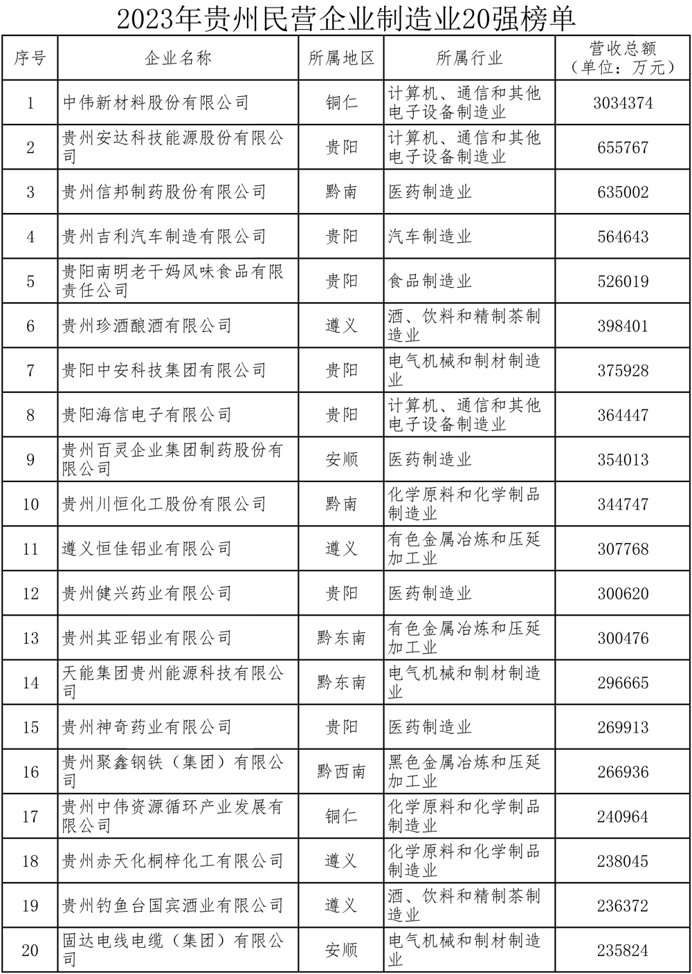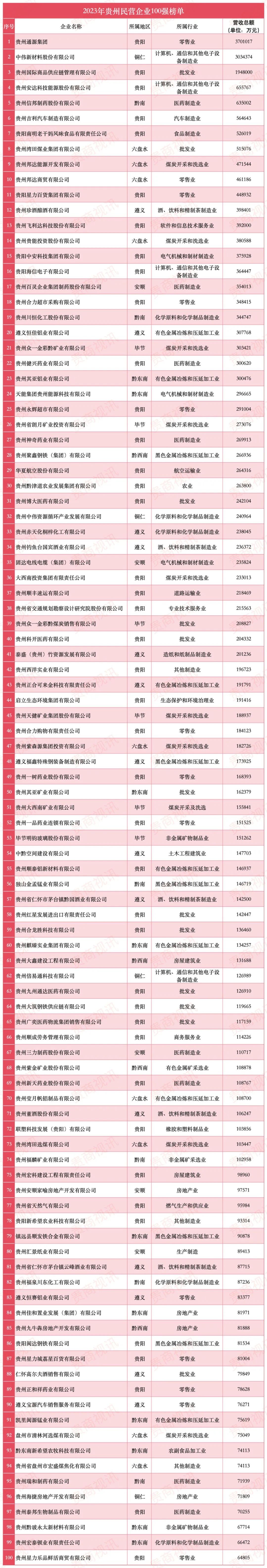 12月2日,貴州省工商業(yè)聯(lián)合會、省企業(yè)家協(xié)會聯(lián)合發(fā)布“2023年貴州民營企業(yè)100強(qiáng)”和“2023年制造業(yè)民營企業(yè)20強(qiáng)”榜單。 報告顯示,2023貴州民營企業(yè)100強(qiáng)共實(shí)現(xiàn)營業(yè)收入2831.66億元,民營企業(yè)100強(qiáng)入圍門檻為6.48億元,民營企業(yè)100強(qiáng)資產(chǎn)總額為3432.69億元,利潤總額為182.45億元,上繳稅金總額為146.21億元,年末員工人數(shù)為160010人。 貴州民營企業(yè)100強(qiáng)主要集中在服務(wù)業(yè)和制造業(yè)。其中,服務(wù)業(yè)有28家,制造業(yè)有39家。 值得一提的是,貴州通源集團(tuán)、中偉新材料股份有限公司和貴州國際商品供應(yīng)鏈管理有限公司位列貴州民營企業(yè)100強(qiáng)榜單前三,營業(yè)收入分別為371.10億元、303.44億元、194.80億元,營業(yè)收入均超百億元。 此外,貴陽南明老干媽以52.6億排名第7位、星力百貨以44.89億元排名第11位、貴州合力超市采購以34.84億元排名第18位、貴州永輝超市以29.1億元排名第25位,貴州合力購物以18.41億元排名第46位、貴州星力樂品鮮活以6.48億元排名第100名。 附1:2023年貴州民營企業(yè)100強(qiáng) 附2:2023年制造業(yè)民營企業(yè)20強(qiáng) |