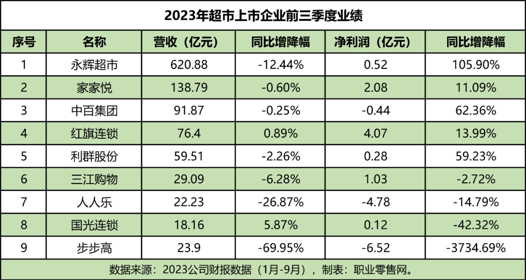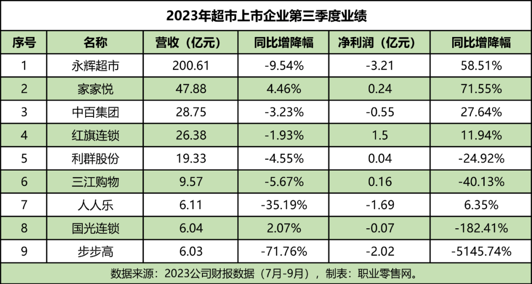 PS:各大公司財政年度的起始時間不同于自然年,因此會出現(xiàn)財政季度、年度等與自然年不一致的情況。 截至12月4日,據(jù)《零售網(wǎng)》不完全統(tǒng)計,沃爾瑪、永輝、聯(lián)華等十多家超市,都已發(fā)布了今年三季度營收情況。從我們統(tǒng)計的9家超市上市企業(yè)三季度營收情況來看,超市行業(yè)近況可謂喜憂參半。 在第三季度營收方面,除了家家悅、國光連鎖二家企業(yè),其他7家超市企業(yè)都出現(xiàn)了不同程度的營收下滑。其中,下滑最多的2家超市,一個是步步高下滑超7成至71.76%,一個是人人樂下滑近四成至35.19%。 在第三季度凈利潤方面,有5家超市凈利潤的增長,但是只有紅旗連鎖和家家悅為正。另外4家超市凈利潤降幅超2位數(shù),其中國光和步步高下滑最多,分別是182.41%和5145.47%。 若將時間放長,前三季度,營收增長的也僅有紅旗連鎖和國光連鎖,凈利潤增長且為正的也只有永輝、家家悅、紅旗連鎖和利群股份4家超市。 然而,作為“中國超市一哥”的沃爾瑪中國,第三季度營收326億元,同比25.3%。其中電商業(yè)務和山姆會員店成為最大亮點。這或許與他們堅持轉型、變革離不開,也讓沃爾瑪中國連續(xù)兩年禪聯(lián)中國超市一哥。 而曾被譽為“超市陸戰(zhàn)之王”的大潤發(fā),2024財年半年報營收357.68億元,同比下滑了11.9%,虧損3.78億擴大至334.5%。作為昔日的霸主,如今也到了急需調整的時期。近年來,大潤發(fā)除了升級大賣場,還在布局中型超市和倉儲會員店。經(jīng)過升級和布局新業(yè)態(tài),是否能重回昔日地位呢?還有待時間檢驗。 總的來說,超市行業(yè)目前是喜憂參半。雖然有一些超市表現(xiàn)不佳,但也有一些強者依然在市場上領跑。 圖示:2023年超市上市企業(yè)第三季度業(yè)績表。 圖示:2023年超市上市企業(yè)前三季度業(yè)績表。 下面我們一起看看: 1、沃爾瑪中國:營收326.24億元、同比增長25.3% 11月16日,沃爾瑪發(fā)布2024財年第三季度(截至2023年10月31日的三個月),總營收達到了1608億美元(約合人民幣11657億元),同比增長5.2%;歸屬于普通股東凈利潤為4.53億美元(約合人民幣32.82億元),同比增長125.19%;調整后營業(yè)利潤為62億美元(約合人民幣449.48億元),同比增長3%。 沃爾瑪美國收入為1094億美元,同比增長4.4%;山姆會員美國收入189億美元,同比增長3.2%;沃爾瑪國際收入267億美元,同比增長5.4%。 中國市場的凈銷售45億美元(約合人民幣326.24億元),同比增長25.3%;電商業(yè)務滲透率已達45%,銷售同比上升38%。其中,山姆和大賣場的到店客流量均有上升,兩種業(yè)態(tài)在中秋節(jié)期間銷售都錄得雙位數(shù)增長。 沃爾瑪全球首席執(zhí)行官董明倫(Doug McMillon)在分析師會議上講道,本季度的早些時候,我第一次在疫情后重返中國。在疫情前,我們的團隊就在中國經(jīng)營著一些世界上(好到)令人不可思議的山姆店。在數(shù)字化滲透和創(chuàng)新方面,中國一直是公司里的“領導者”。 2、高鑫零售:營收357.68億元,凈利潤虧損3.78億元 11月14日,大潤發(fā)母公司高鑫零售發(fā)布2024財年(2023年4月1日至2023年9月30日)中期業(yè)績報告。 報告顯示,高鑫零售營收達到357.68億元,同比下滑11.9%;歸母凈利潤虧損3.78億元,相比去年同期的虧損0.89億元,同比擴大334.5%;公司擁有人應占虧損3.59億元,同比擴大420.3%;毛利率為24.9%,與去年同期持平。 截至2023年9月30日,高鑫零售已完成整店重構8家,專案及局部改造50余家。報告期內,新開3家大潤發(fā),1家M會員店和7家中超。然而,也同時也關閉了4家大賣場。 截至2023年9月30日,大潤發(fā)母公司高鑫零售共擁有485家大賣場、19家中型超市以及1家M會員店,全國范圍內共有14個自建生鮮食品加工倉(“生鮮倉”)。 3、永輝超市:第三季度虧損3.21億元 10月27日,永輝超市發(fā)布2023年第三季度報告。報告期內,永輝超市實現(xiàn)營收200.61億元,同比下降9.54%,歸母凈利潤為-3.21億元,虧損幅度收窄了58.51%。 今年前三季度,永輝超市實現(xiàn)營業(yè)收入達620.88億元,同比下降12.44%;歸母凈利潤為0.52億元,同比增加9.39億元,實現(xiàn)扭虧為盈,盈利達到了105.90%。 永輝超市表示,一方面經(jīng)濟在逐步恢復,居民消費選擇較多,競爭環(huán)境仍十分嚴峻;另一方面,公司主動進行門店優(yōu)化,淘汰部分虧損門店;報告期內門店數(shù)量較上年同期下降,兩方面因素共同導致公司前三季度營業(yè)收入同比下滑。 4、聯(lián)華超市:前三季度營收約186.33億元 10月30日,聯(lián)華超市發(fā)布截至2023年9月30日止9個月業(yè)績報告。報告顯示,聯(lián)華超市營業(yè)收入約186.33億元,未經(jīng)審計營業(yè)成本約人民幣148.9億元,未經(jīng)審計歸屬于公司所有者的凈虧損約人民幣2.87億元。 近日,百聯(lián)股份回復投資者提問時表示,公司三季度營業(yè)收入70億中近八成是聯(lián)華超市的營收,且聯(lián)華超市處于虧損狀態(tài)。 百聯(lián)股份方面表示,聯(lián)華超市正積極通過擴展多項合作、多渠道引流、加強店倉一體化建設,促進全渠道發(fā)展;徹底梳理供應鏈結構,優(yōu)化、提升供應鏈效率;多渠道尋找優(yōu)質通路,完善生鮮供應鏈,加強生鮮基地建設;加強外區(qū)數(shù)字化門店全面推廣,加速數(shù)字化轉型項目進程。 5、家家悅:第三季度凈利潤同比增長71.55% 10月27日,家家悅披露第三季度財報。報