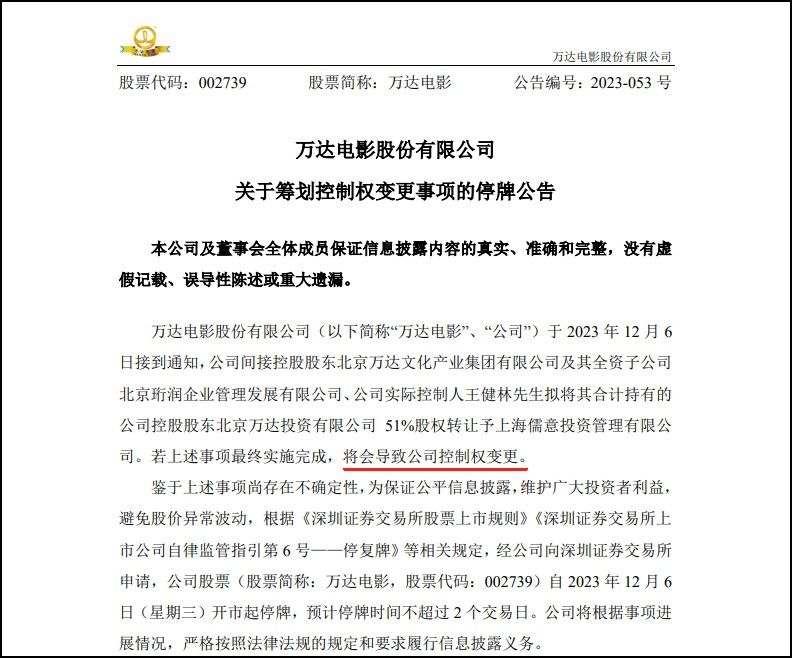 萬達上市推遲,王健林又開啟賣賣賣了。 01 萬達電影易主 12月6日,萬達電影午間公告,宣布了一場股權變動。 公司間接控股股東北京萬達文化產業(yè)集團及其全資子公司北京珩潤、公司實際控制人王健林擬將其合計持有的公司控股股東北京萬達投資有限公司51%股權轉讓予上海儒意投資管理有限公司。 若上述事項最終實施完成,將會導致公司控制權變更。經公司向深圳證券交易所申請,公司股票自12月6日(星期三)開市起停牌,預計停牌時間不超過2個交易日。 這也意味著,此次交易完成后,王健林將不再控股萬達電影。 受上述消息影響,中國儒意盤中大漲逾9%,市值升至220億港元。 02 萬達電影國院龍頭 萬達電影長期穩(wěn)居國內院線龍頭。 燈塔數(shù)據顯示,2023年至今,全國電影票房已達514.5億元,其中萬達院線票房89.4億元,遠超第二名的44.81億元。萬達院線觀影人次1.9億,場均人次15人,均處于行業(yè)領先地位。 萬達影投在全國排名也常年穩(wěn)居第一。萬達電影旗下影院和熒幕規(guī)模,均居行業(yè)第一。2023年以來,全國排名前30的影院,有9家為萬達影城。 據2023年三季報,今年1-9月,萬達電影國內影院實現(xiàn)票房62.2億元(不含服務費),同比增長67.6%,較2019年同期增長5.2%;觀影人次1.5億,同比增長68.7%,較2019年同期增長3.7%。 截至2023年9月30日,萬達電影國內擁有已開業(yè)影院877家,7338塊銀幕,其中直營影院709家,6159塊銀幕,輕資產影院168家,1179塊銀幕,前三季度公司累計市場份額16.5%。 03 中國儒意何許人也 “儒意系”堪稱近年來電影行業(yè)的一匹黑馬。燈塔數(shù)據顯示,上海儒意影視近年來累計出品作品43部,累計出品總票房176.77億元,累計發(fā)行總票房74.34億元。其中包括《你好,李煥英》《消失的她》《獨行月球》《送你一朵小紅花》等知名作品。 上海儒意影視為香港上市公司中國儒意控股有限公司(以下簡稱“中國儒意”00136.HK)協(xié)議控制的下屬公司,中國儒意擁有上海儒意影視100%的實際權益。騰訊是中國儒意主要股東之一。 財報資料顯示,柯利明是一位80后,現(xiàn)年39歲,曾經在對沖基金管理公司任高級分析師。畢業(yè)于澳大利亞格里菲斯大學,于2005年獲得風險管理學士學位,并于2006年獲得貨幣銀行學碩士學位。 此次擬接手萬達投資51%股權的上海儒意投資,與此前接手萬達投資49%股權的上海儒意影視,均由柯利明控制。 而在此次擬轉讓萬達投資51%股權之前,2023年7月20日,萬達文化集團已與上海儒意影視制作有限公司(以下簡稱“上海儒意影視”)簽署了《股權轉讓協(xié)議》。 萬達文化集團擬將其持有的萬達投資49%股權以人民幣22.62億元轉讓予上海儒意影視。股權轉讓后,北京萬達投資由萬達文化持股49.8%,由上海儒意持股49%,王健林持股1.2%。 當時有報道稱,王健林是為了還債,內部人士露,其資金主要用于還債。萬達集團將出售獲得的資金用于償還7月23日到期的4億美元債(約合人民幣28億元)本金。 再往前,7月10日,萬達投資向東方財富(300059)“老板娘”陸麗麗轉讓萬達電影1.8億股,占公司總股本8.26%,轉讓價格為12.07元/股,價值人民幣21.7億元;7月17日,又向其一致行動人莘縣融智轉讓股份1.77億股,占公司總股本8.14%,轉讓價格為13.17元/股,價值23.35億元。 04 王健林為何賣賣賣? 分析認為,王健林“賣賣賣”的背后,正是當下萬達所面臨的資金緊張的困境以及珠海萬達商管短期在港股上市無望又面臨對賭協(xié)議回購壓力有關。 根據此前港股IPO申報材料,萬達商管集團子公司珠海萬達商管正申請在港交所上市,如果不能于2023年底成功上市,萬達商管集團需向上市前投資者支付約300億元的股權回購款。 截至2023年6月末,萬達商管境內公開市場債券存量規(guī)模123.41億元,境外債券存量規(guī)模約為18億美元。 萬達今年至少出售了5個萬達廣場。9月底,萬達將旗下廣西北海合浦萬達廣場轉讓給北海當?shù)胤科蠛掀滞头康禺a;10月份,萬達商管轉讓上海萬達廣場置業(yè)有限公司100%股權。 |