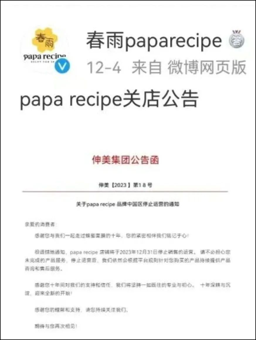 12月8日,#春雨面膜退出中國市場#話題上了微博熱搜第一,曾經(jīng)在國內(nèi)紅極一時的春雨面膜宣布將停止運營。曾一年賣出1億片,簽下明星范丞丞為代言人的爆款面膜,為何突然關(guān)店? papa recipe(春雨)中國市場代理商伸美集團在12月4日發(fā)布了關(guān)于papa recipe品牌中國區(qū)停止運營的通知,12月6日,關(guān)于papa recipe品牌中國區(qū)停止運營”的公告出現(xiàn)在春雨面膜天貓旗艦店。 目前,春雨papa recipe微博、拼多多、抖音、小紅書papa recipe旗艦店等官方店鋪渠道的品牌代理商,也都發(fā)布了停止運營公告。這意味著,春雨面膜將全面下架。從12月31日起,將不再負責(zé)春雨在中國的相關(guān)運營,線下渠道也將停止供貨。 據(jù)時代周報報道,伸美集團春雨品牌負責(zé)人陳余長在接受媒體采訪時表示,伸美集團與品牌方終止了運營合作,將不再負責(zé)春雨在中國的相關(guān)運營,線下渠道也已經(jīng)停止供貨。針對春雨品牌后續(xù)動作,他進一步表示:“是獨立運營,還是與其他公司合作,暫不清楚! 據(jù)時代周報,創(chuàng)立于2012年的春雨,是韓國COSTORY株式會社旗下的化妝品品牌;2014年,伸美集團將其引入國內(nèi)。彼時,面膜市場概念戰(zhàn)尚未打響,憑借“0添加”“精華中含有87%的蜂蜜原液”等宣傳概念,春雨迅速打開中國市場,圈粉無數(shù)。 2016年,春雨共賣出1億片面膜,有90%都銷往了中國;2018年,春雨簽下范丞丞作為其品牌代言人,得益于明星效應(yīng),當(dāng)年年度新品“春雨果蔬面膜”在開售后的90分鐘,銷售額便突破了200萬元。 到2020年巔峰時期年度零售成交額達到20億級別,2022年,春雨經(jīng)典的蜂蜜面膜更是成為了天貓國際面膜銷量第一名。據(jù)業(yè)內(nèi)透露,2023年春雨前端GMV區(qū)間為5億-6億元。不難看出,春雨依舊是中國市場“搶手”的韓妝品牌。美妝營銷從業(yè)人士孔思瀚認為,papa recipe春雨在中國市場尋找新的代理商的可能性更大。 |
