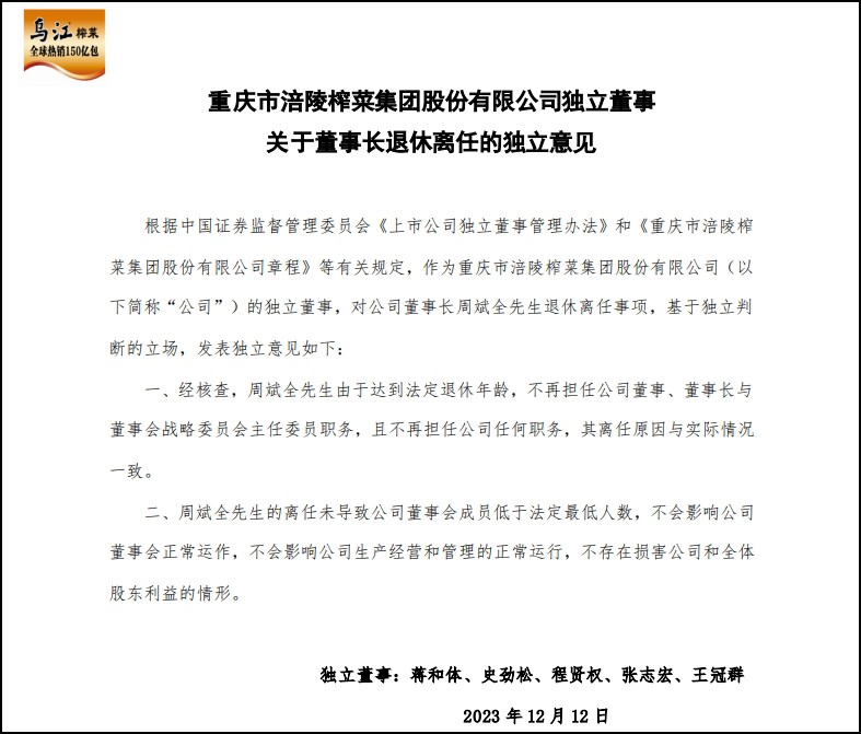 12月11日,涪陵榨菜發(fā)布公告稱,董事長(zhǎng)周斌全由于達(dá)到法定退休年齡,不再擔(dān)任公司董事、董事長(zhǎng)、董事會(huì)戰(zhàn)略委員會(huì)主任委員職務(wù),不再擔(dān)任公司任何職務(wù)。 于2023年12月7日接到重慶市涪陵區(qū)國(guó)有資產(chǎn)監(jiān)督管理委員會(huì)通知,并于同日收到公司副總經(jīng)理陳林的辭職申請(qǐng),由于達(dá)到法定退休年齡,陳林不再擔(dān)任公司副總經(jīng)理職務(wù),且不再擔(dān)任公司任何職務(wù),該申請(qǐng)自送達(dá)董事會(huì)之日起生效。陳林的離任不會(huì)影響公司正常經(jīng)營(yíng)運(yùn)作。截至本公告日,陳林持有公司股票281,385股。 涪陵榨菜公告中提到,周斌全自2000年加入公司以來(lái),帶領(lǐng)公司進(jìn)行現(xiàn)代企業(yè)制度改革;主導(dǎo)完成股份制改造,推動(dòng)公司在深交所上市,成為中國(guó)醬腌菜行業(yè)上市第一股;把一個(gè)瀕臨破產(chǎn)、資不抵債的國(guó)有榨菜企業(yè)發(fā)展成為如今凈資產(chǎn)80.77億元,年稅利過(guò)10億元的國(guó)有控股上市公司。 涪陵榨菜在公告中表示,公司及公司董事會(huì)對(duì)周斌全任職期間推動(dòng)行業(yè)進(jìn)步、帶領(lǐng)公司發(fā)展所做的貢獻(xiàn)表示崇高的敬意和衷心的感謝。 |