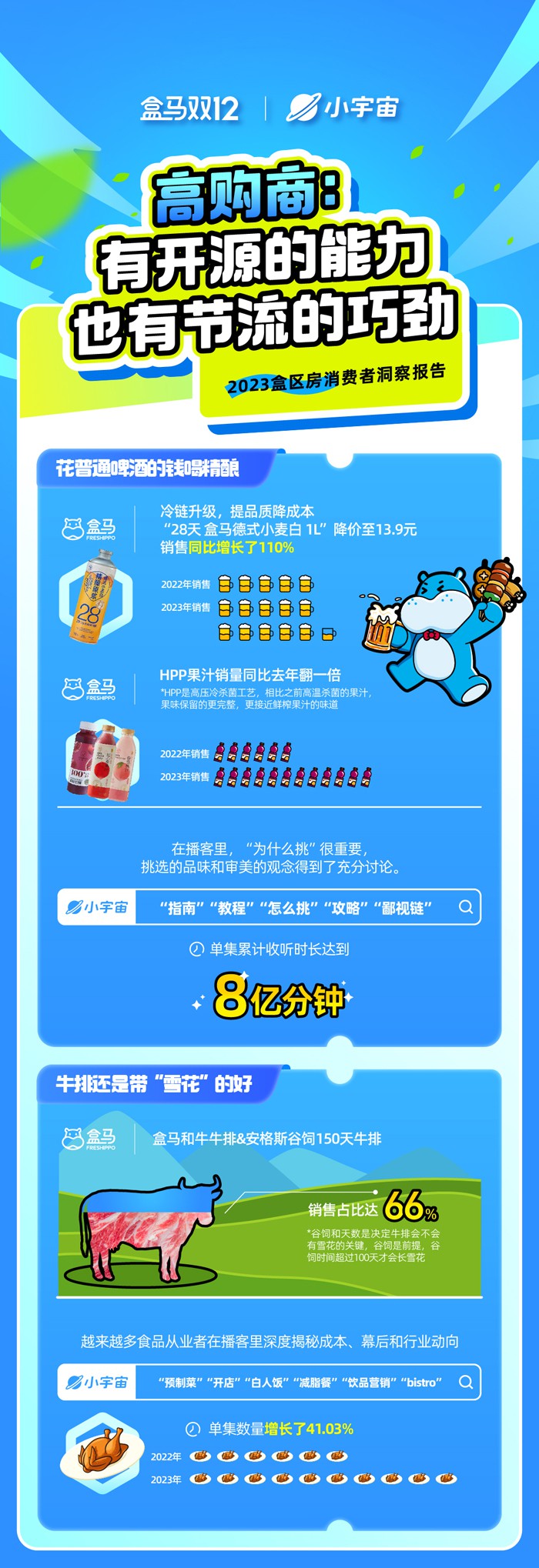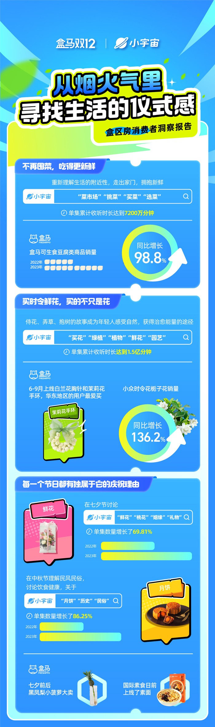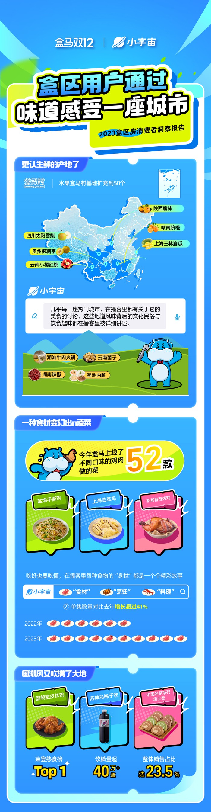 近日,盒馬聯(lián)合小宇宙App共同發(fā)布了《2023年盒區(qū)房消費趨勢報告》。該報告顯示,健康、高購商、產(chǎn)地尋鮮和煙火氣復(fù)燃成為2023年的四個關(guān)鍵詞。 以下為報告全文: |