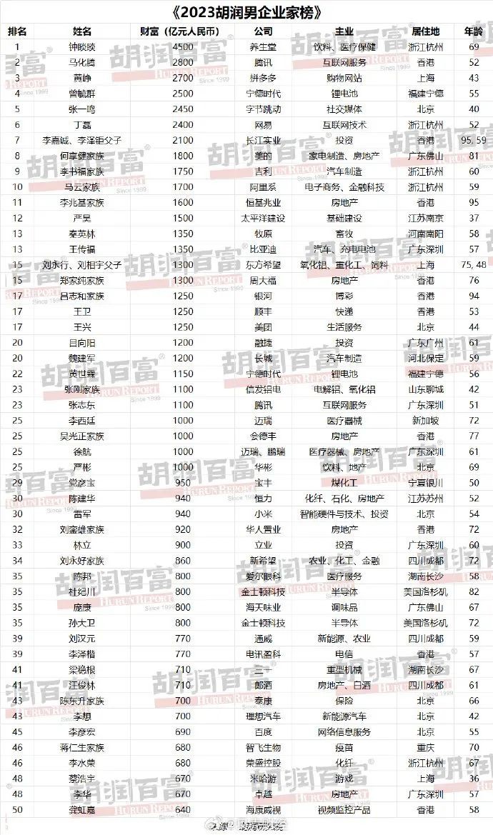 12月12日,胡潤(rùn)研究院發(fā)布《2023胡潤(rùn)男企業(yè)家榜》,列出了胡潤(rùn)百富榜中前50名中國(guó)男性企業(yè)家,總財(cái)富6.37萬(wàn)億元,上榜門檻640億元。這是胡潤(rùn)研究院首次發(fā)布男企業(yè)家榜單。榜單顯示,前50名中國(guó)男性企業(yè)家從事食品飲料和傳媒娛樂(lè)行業(yè)的比例最高,分別有14%和12%,并且總體來(lái)看有90%屬于白手起家。(澎湃新聞) |