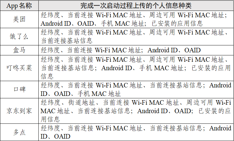 近期,中國網(wǎng)絡空間安全協(xié)會對“餐飲外賣類”公眾大量使用的部分App收集個人信息情況進行了測試。 測試發(fā)現(xiàn),7款App上傳了5種類型個人信息,包括位置信息、唯一設備識別碼、應用列表信息、用戶截圖操作信息、用戶使用App產(chǎn)生的交互信息。(中國網(wǎng)絡空間安全協(xié)會微信公號) |