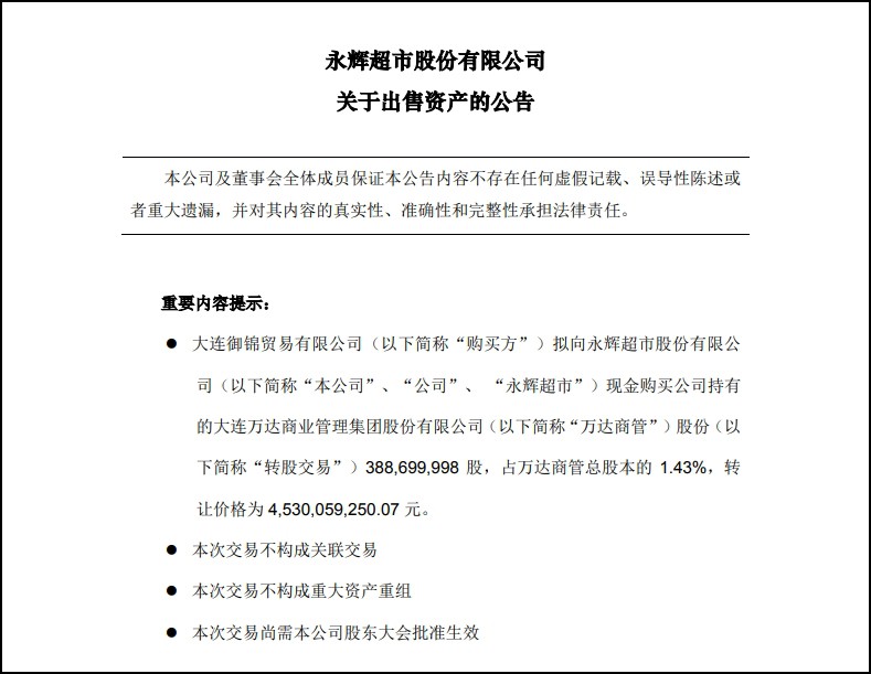 12月13日,永輝超市股份有限公司(以下簡(jiǎn)稱“永輝超市”)發(fā)布關(guān)于出售資產(chǎn)的公告。 公告顯示,永輝超市擬向大連御錦貿(mào)易有限公司出售公司持有的萬達(dá)商管1.43%股份,轉(zhuǎn)讓價(jià)格為45.3億元。 截止至本公告日,該股權(quán)投資賬面價(jià)值為39.18億元。本次股權(quán)交易價(jià)格較股權(quán)賬面價(jià)值溢價(jià)人民幣6.12億元,其中第一期股權(quán)交易完成后將影響公司2023年稅前利潤(rùn)人民幣2859.58萬元。 永輝超市表示,本次資產(chǎn)交易的目的是為了盤活公司資產(chǎn),符合公司縮小投資規(guī)模戰(zhàn)略。 企查查信息顯示,大連御錦貿(mào)易有限公司,成立于2023年11月30日,注冊(cè)資本50萬元,主營業(yè)務(wù)國內(nèi)貿(mào)易代理等。其股東為北京一方明實(shí)信息技術(shù)有限公司。 根據(jù)永輝超市2023年第三季度報(bào)告,公司實(shí)現(xiàn)營收200.61億元,同比下降9.54%,歸母凈利潤(rùn)為-3.21億元,虧損幅度收窄了58.51%。今年前三季度,永輝超市實(shí)現(xiàn)營業(yè)收入達(dá)620.88億元,同比下降12.44%;歸母凈利潤(rùn)為0.52億元,同比增加9.39億元,實(shí)現(xiàn)扭虧為盈,盈利達(dá)到了105.90%。 截至12月13日,永輝超市在全國997家門店,覆蓋29個(gè)省,530個(gè)市/縣。此外,公司還在籌備開設(shè)102家門店。根據(jù)三季度報(bào)告透露,四季度將開出近10家門店,并以調(diào)優(yōu)后新店型為主。 |