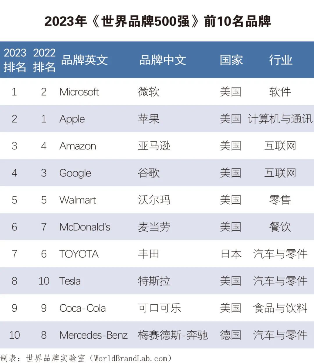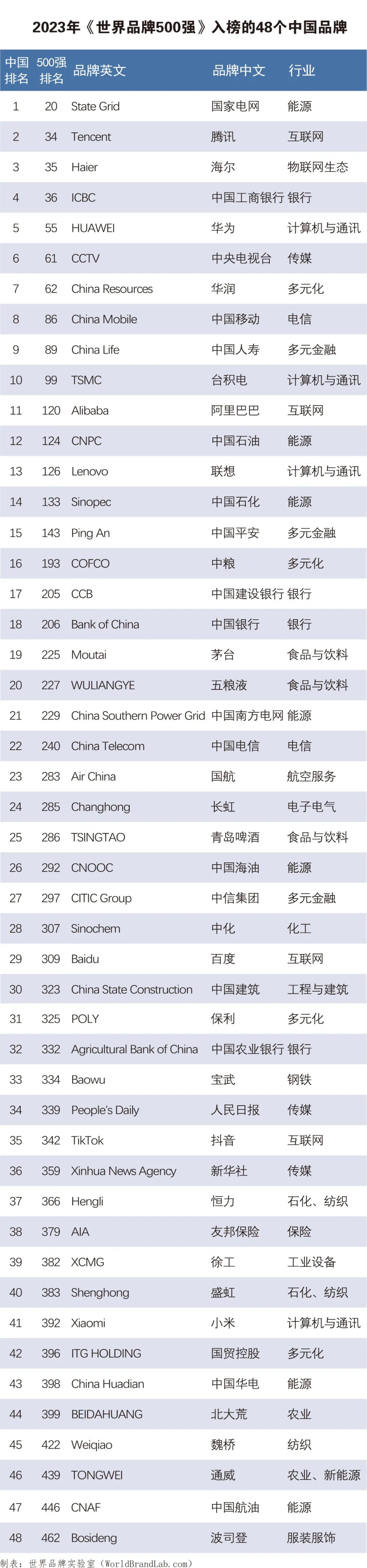 12月13日,由世界品牌實(shí)驗(yàn)室編制的2023年度《世界品牌500強(qiáng)》排行榜在美國(guó)揭曉。 該排行榜的評(píng)判依據(jù)是品牌的世界影響力,即品牌開拓和占領(lǐng)市場(chǎng)并獲得利潤(rùn)的能力,來編制的。其三項(xiàng)關(guān)鍵指標(biāo)為市場(chǎng)占有率、品牌忠誠(chéng)度和全球領(lǐng)導(dǎo)力。 從排行榜前十名來看,微軟(Microsoft)超過蘋果(Apple)位列第一,而蘋果(Apple)退居第二。亞馬遜(Amazon)名列第三。第四位到第十位分別是,谷歌、沃爾瑪、麥當(dāng)勞、豐田、特斯拉、可口可樂和梅賽德斯-奔馳。 從國(guó)家入選數(shù)前10來看,美國(guó)的品牌數(shù)量最多,有193個(gè)品牌,法國(guó)次之,有49個(gè),中國(guó)第三,有48個(gè),與第二位的法國(guó)僅相差一個(gè)。接下來的排名依次是日本,英國(guó),德國(guó),瑞士,意大利,加拿大和荷蘭。 在從入選最多10個(gè)行業(yè)中,食品飲料行業(yè)有35個(gè)品牌,汽車與零件行業(yè)有32個(gè)品牌,能源行業(yè)有28個(gè)品牌。接下來的排名依次是零售、傳媒、銀行、互聯(lián)網(wǎng)、保險(xiǎn)、計(jì)算機(jī)與通訊和電信。 新上榜的品牌中,信諾集團(tuán)、太空探索技術(shù)公司和意大利國(guó)家電力位列前三。接下來的排名依次是巴西國(guó)家石油、阿斯麥、保利、抖音、泛西人壽、中國(guó)華電和超威半導(dǎo)體。 最古老的10個(gè)品牌中,前五位分別是,圣戈班、英杰華、茅臺(tái)、葛蘭素史克、馬爹利。第五到第十分別是人頭馬、蘇格蘭皇家銀行、酩悅香檳、蘇富比、江詩(shī)丹頓。 最年輕的10個(gè)品牌中,抖音、OpenAI、艾伯維、Instagram小米位列前五。第五到第十位分別是優(yōu)步、WhatsApp、沙特電信、愛彼迎、X(推特)、Spotify、日本郵政、聯(lián)合圣保羅銀行。 值得注意的是,中國(guó)品牌入選數(shù)48個(gè)首次超越日本43個(gè),躍居全球第三。其中表現(xiàn)亮眼的品牌有國(guó)家電網(wǎng)、騰訊、海爾、華為、華潤(rùn)、中國(guó)人壽、五糧液、中國(guó)南方電網(wǎng)、青島啤酒、中化、恒力、徐工、盛虹和國(guó)貿(mào)控股。 附:世界品牌500強(qiáng)排行榜前100名 |