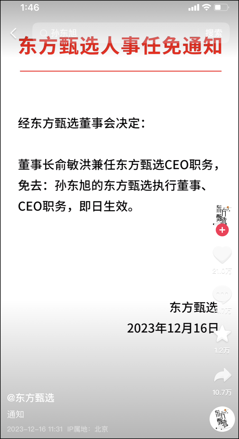 12月16日,東方甄選抖音賬號發(fā)布通知,經(jīng)東方甄選董事會決定,董事長俞敏洪兼任東方甄選CEO職務(wù),免去孫東旭的東方甄選執(zhí)行董事、CEO職務(wù),即日生效。 就在16日凌晨,東方甄選抖音賬號更新簡介,宣布當(dāng)天暫時停播!伴]門思過,敬請大家批評!俞老師在帶領(lǐng)大家進行檢討。12月17日準(zhǔn)時開播,感謝大家的厚愛和寬容!” 01 事件回顧 12月8日,東方甄選開啟了三天的“吉林行”。在東方甄選一則“吉林之行”視頻下,小編置頂了一條“宣傳文案出自誰手”的解答評論,稱“每一次小作文制作,都是主播在鏡頭前,背后是文案創(chuàng)作團隊、拍攝團隊、剪輯團隊的小伙伴們,大家協(xié)作,才有了一篇篇專場小作文! 此番回復(fù)立刻引發(fā)了董宇輝一些粉絲的不滿。有粉絲認(rèn)為,這是對董宇輝的一種“背刺”,否認(rèn)他為東方甄選做出的貢獻。12月11日,大量粉絲上演“董宇輝守護戰(zhàn)”,前往高途佳品其他直播間“報到”,以實際行動表達不滿。 12月12日晚間,東方甄選CEO孫東旭在直播中回應(yīng)“小作文”事件。直播中,孫東旭“摔手機”、“東方甄選拒絕飯圈文化”以及透露董宇輝收入薪酬等言論,再度引起輿論發(fā)酵。 12月13日凌晨,董宇輝發(fā)長文回應(yīng)了“小作文”事件。他表示,吉林場的“小作文”小編思路和自己一開始的不同,但很好,所以基本沒有改動。董宇輝表示自己錄制的文案,都會認(rèn)真對待。董宇輝還強調(diào),自己反對飯圈文化,也反對以“飯圈”名義污名化任何人。 在“小作文風(fēng)波”后,董宇輝社交媒體主頁已將簽名更改。此前,董宇輝個人簽名為“曾經(jīng)是老師,現(xiàn)在是售貨員”,而現(xiàn)在改成“勿意,勿必,勿固,勿我”。 此后,壓力給到了俞敏洪。12月14日,俞敏洪發(fā)布視頻聲明,回應(yīng)近期小作文爭議。俞敏洪批評了小編的行為及孫東旭談董宇輝薪酬的不當(dāng)行為,并稱自己不認(rèn)為東方甄選是飯圈文化,也堅決抵制飯圈文化。 俞敏洪呼吁粉絲們理性發(fā)言,希望大家用更加寬容的方式看待東方甄選在發(fā)展過程中的風(fēng)風(fēng)雨雨。最后,俞敏洪表示,歡迎大家各種理性的建議和批判。“我作為大家長會盡量公平對待公司的每一位成員,從他們身上學(xué)習(xí),也幫助他們成長! 同在12月14日,有自媒體賬號發(fā)出消息稱,東方甄選內(nèi)部流出的一份聊天記錄顯示,俞敏洪目前面臨要保CEO孫東旭還是要保主播董宇輝的二選一的處境。 對此俞敏洪曾否認(rèn)這一傳聞,并稱“沒事,沒這么嚴(yán)重”。孫東旭也稱“這是謠言,沒有此事”。董宇輝則表示,不方便回應(yīng)。 與此同時,12月14日,東方甄選發(fā)布甄選品牌日15日至17日全天直播宣傳海報,董宇輝未在其中。 同在12月14日,新東方創(chuàng)始人俞敏洪和東方甄選CEO孫東旭接連道歉。俞敏洪稱,官微小編做法缺乏職業(yè)精神,公司管理有很大漏洞,向董宇輝道歉。 孫東旭對自己近日在直播中神態(tài)“咄咄逼人”、疑似摔手機行為,以及提到董宇輝的薪酬,向網(wǎng)友和董宇輝道歉。 受“小作文風(fēng)波”影響,東方甄選抖音賬號粉絲總量快速跌破3000萬,且還在繼續(xù)減少,與12月9日的3116萬相比已掉粉超200萬。 截至12月15日收盤,在港股上市的東方甄選股價下跌5.58%,報26.25港元,單周跌幅接近22%,總市值縮水至266.44億港元。 02 董宇輝會離開東方甄選嗎? 改簽名、回陜西、不帶貨……董宇輝近日舉動,讓大家不禁猜測:東方甄選要“去董宇輝化”了嗎? 12月15日晚間,已經(jīng)傳出有電商巨頭要挖角董宇輝。一張網(wǎng)絡(luò)流傳的截圖顯示,劉強東的人力副總裁已拿著劉強東的親筆簽名前往陜西招募董宇輝,并且談得很順利,去京東的可能性很大。京東方面對此事件暫無回應(yīng)。 針對該傳聞,董宇輝表示:“不屬實,目前沒有接觸任何公司”。 同樣在15日,曾經(jīng)“新東方”走出來的高途董事長陳向東和羅永浩接連發(fā)聲。 陳向東表示,自己不會主動挖董宇輝,并認(rèn)為董宇輝也不會出來創(chuàng)業(yè),“不是人做的事”,除非董宇輝自己離開。 羅永浩更是在直播中表示,董宇輝應(yīng)該自己出來創(chuàng)業(yè),并會支持他,“如果董宇輝本人想創(chuàng)業(yè),我很愿意跟一些做投資和做企業(yè)的朋友們攢一個局,支持他順利創(chuàng)業(yè)!崩狭_還表示,電商這方面的巨頭都在嘗試接洽董宇輝,董宇輝的價值被嚴(yán)重低估了,他到今天都沒有出來說一句難聽的話,“我在他的年紀(jì)是絕對做不到的”,自己對這個年輕人非常佩服。 |