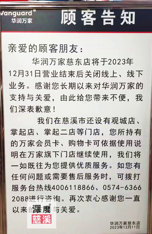 據(jù)網(wǎng)友爆料,華潤(rùn)萬(wàn)家慈東店發(fā)布顧客告知通知書,宣布將于12月31日后停止?fàn)I業(yè)。 公告中顯示,對(duì)于會(huì)員卡和購(gòu)物卡,消費(fèi)者可以根據(jù)使用說(shuō)明在萬(wàn)家旗下門店繼續(xù)使用,我們將一如既往為您提供優(yōu)質(zhì)服務(wù)。 該店關(guān)閉后,在慈溪市華潤(rùn)萬(wàn)家還有觀城店、掌起店、掌起二店等門店。 事實(shí)上,這并不是華潤(rùn)萬(wàn)家今年在慈溪關(guān)閉的第一家超市門店。在今年4月10日,華潤(rùn)萬(wàn)家坎墩店閉門謝客。 |