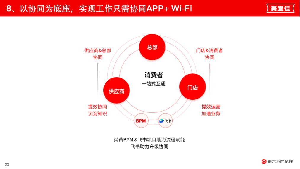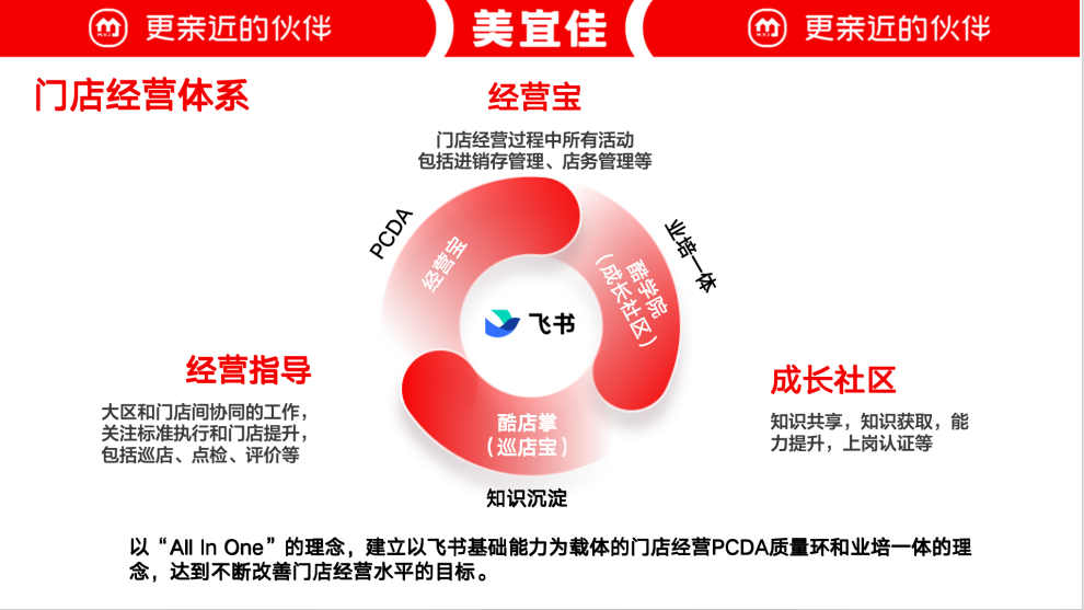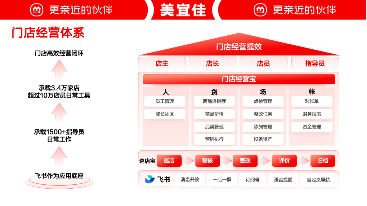 美宜佳,創(chuàng)立于1997年,系東莞市糖酒集團(tuán)旗下商業(yè)流通企業(yè),目前已成為中國門店數(shù)量最多的便利店品牌*。2023年1月,美宜佳和飛書正式攜手,以全業(yè)務(wù)鏈閉環(huán)為目標(biāo),搭建總部、加盟商、物流司機(jī)、供應(yīng)商等密切合作伙伴“All in one”辦公協(xié)同平臺。飛書目前已成為美宜佳總部全員的溝通陣地,實(shí)現(xiàn)辦公在飛書、知識在飛書、業(yè)務(wù)在飛書。(*數(shù)據(jù)出自CCFA《2022年中國便利店TOP 100》) 布局全國230多個城市、擁有33000家門店的「國民便利店」美宜佳2020年開始醞釀數(shù)字化變革,2022年正式實(shí)施數(shù)字化轉(zhuǎn)型戰(zhàn)略。如何更好地實(shí)現(xiàn)戰(zhàn)略協(xié)同,保障戰(zhàn)略高效落地?美宜佳副總經(jīng)理胡秋育給出了答案:“第一次接觸飛書的時候,感嘆這就是我們數(shù)字化轉(zhuǎn)型需要的工具!” 美宜佳副總經(jīng)理 胡秋育 12月13日,飛書聯(lián)合美宜佳打造"走進(jìn)先進(jìn)·走進(jìn)美宜佳”活動,解碼「國民便利店」美宜佳數(shù)字化力量構(gòu)建。 一、“上線即先進(jìn)”的能力建設(shè) 活動現(xiàn)場,美宜佳數(shù)據(jù)IT體系負(fù)責(zé)人助理陳秋明分享了美宜佳的數(shù)字化轉(zhuǎn)型歷程。 在創(chuàng)立初期,美宜佳便引入了商業(yè)流通ERP,加上自研的IT工具,支撐著業(yè)務(wù)的快速發(fā)展。然而,在數(shù)智時代到來后,“自研的IT工具越來越不能滿足和響應(yīng)業(yè)務(wù)快速發(fā)展對數(shù)字化、智能化的需求! 數(shù)據(jù)IT體系負(fù)責(zé)人助理 陳秋明 “我們需要一個重要的協(xié)同底座,能夠?qū)崿F(xiàn)無論何種終端、何種操作系統(tǒng),只要有一個APP+Wi-Fi,就能夠進(jìn)行業(yè)務(wù)操作!痹诮(jīng)過了一系列的產(chǎn)品試用與分析對比,“我們發(fā)現(xiàn)飛書在這一塊是脫穎而出的。” 以協(xié)同為底座 在飛書打造超級App 陳秋明將美宜佳上飛書的過程形容為“上線即先進(jìn)的能力建設(shè)”,飛書解決了美宜佳曾經(jīng)出現(xiàn)的“數(shù)據(jù)鏈路復(fù)雜”、“系統(tǒng)煙囪化嚴(yán)重”、“數(shù)字化工具缺乏”等一系列問題,幫助美宜佳十萬余員工、三萬余門店構(gòu)建起內(nèi)外鏈的連接協(xié)同,達(dá)到all in one的協(xié)作與管理。 圍繞“人”和“事” 打造All in one協(xié)作與管理平臺 美宜佳還在積極打造第四代服務(wù)平臺,希望能夠通過引入AI,讓整個企業(yè)變得更“智慧”。陳秋明表示,期待飛書開箱即用的AI應(yīng)用,賦能美宜佳帶來新一輪智能化辦公的革新。 二、飛書助力美宜佳打造「超級門店」 在門店應(yīng)用層面,美宜佳數(shù)據(jù)IT門店應(yīng)用產(chǎn)品負(fù)責(zé)人黃建銘分享了美宜佳的“飛書經(jīng)驗(yàn)”。 美宜佳數(shù)據(jù)IT門店應(yīng)用產(chǎn)品負(fù)責(zé)人 黃建銘 黃建銘坦言,在門店數(shù)量從三千家躍升至三萬家時,一系列問題都涌現(xiàn)而來。超過十萬人的員工如何協(xié)同?消息如何有效、及時地觸達(dá)門店并落地執(zhí)行?“飛書解決了我們的斷層問題,讓門店和總部不再是平行時空,實(shí)現(xiàn)在同一個空間中協(xié)同,形成一個完美的生態(tài)閉環(huán)! 以飛書為基座構(gòu)建門店經(jīng)營PCDA質(zhì)量閉環(huán)和業(yè)培一體化 借助飛書,美宜佳也實(shí)現(xiàn)了門店高效經(jīng)營閉環(huán),同時針對特定的業(yè)務(wù)場景個性化定制操作界面,提升員工端和門店端的協(xié)作效率與體驗(yàn)。黃建銘提到美宜佳遵循著“把復(fù)雜留給總部,把簡單留給一線”的理念,對于門店的員工,和總部的員工日常需求不同,只是需要關(guān)注和處理一些日常的信息!鞍研枨筇峤o飛書之后,很快就打造了一個專屬門店員工的飛書界面,更加簡潔方便! 當(dāng)決定所有門店上飛書后,外賣場景就成為了美宜佳的一個“痛點(diǎn)”問題。在之前,通過美宜佳的外賣中臺,會語音提示門店店員的外賣訂單信息;在用飛書之后,“外賣訂單不提醒”可能導(dǎo)致門店店員錯過訂單導(dǎo)致超時。在和飛書討論后,共創(chuàng)出針對外賣場景的「一站式方案」:語音提示、接訂單、處理訂單、配送揀貨一系列流程都能在飛書進(jìn)行。黃建銘表示,“這樣我們可以放心將外賣的能力承載到飛書上了,店員不需要關(guān)注很多終端,只要看飛書就可以了!” 外賣訂單飛書語音提醒,置頂展示 以飛書作為載體和基座,將美宜佳的經(jīng)營應(yīng)用全部集成至飛書平臺,所有的工作業(yè)務(wù)集成在飛書,真正實(shí)現(xiàn)了“all in one”的經(jīng)營理念。 美宜佳門店經(jīng)營體系 三、從“用上飛書”到“用爽飛書” 在活動現(xiàn)場,美宜佳數(shù)據(jù)IT辦公協(xié)同產(chǎn)品負(fù)責(zé)人王紅福用飛書云文檔給大家展示了美宜佳如何從“用上飛書”到“用好飛書”再到“用爽飛書”的歷程。 美宜佳數(shù)據(jù)IT辦公協(xié)同產(chǎn)品負(fù)責(zé)人 王紅福 通過飛書審批中心集成,美宜佳將分散在OA、ERP、財務(wù)、費(fèi)控等12個系統(tǒng)的管理流程統(tǒng)一到飛書,實(shí)現(xiàn)平臺整合。結(jié)合機(jī)器人提醒、“一鍵拉群”等功能,解決了“系統(tǒng)割裂驗(yàn)差”、“程繁瑣效率低”、“審批溝通耗工時”等問題,