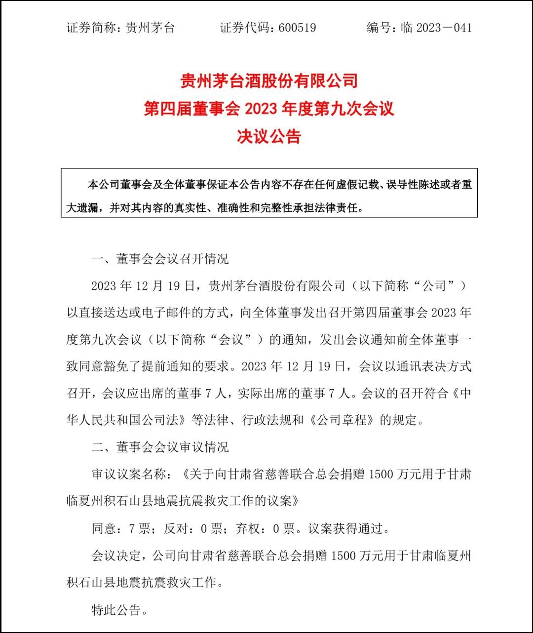 12月19日,貴州茅臺(tái)在上交所官網(wǎng)透露,將向甘肅省慈善聯(lián)合總會(huì)捐贈(zèng)1500萬(wàn)元,用于甘肅臨夏州積石山縣地震抗震救災(zāi)工作。 12月18日23時(shí)59分,甘肅臨夏州積石山縣發(fā)生6.2級(jí)地震,災(zāi)情牽動(dòng)著全國(guó)人民的心。 貴州茅臺(tái)第一時(shí)間啟動(dòng)救災(zāi)響應(yīng),于12月19日召開(kāi)第四屆董事會(huì)2023年度第九次會(huì)議。 公告顯示,《關(guān)于向甘肅省慈善聯(lián)合總會(huì)捐贈(zèng)1500萬(wàn)元用于甘肅臨夏州積石山縣地震抗震救災(zāi)工作的議案》獲得董事會(huì)全票通過(guò)。 據(jù)悉,貴州茅臺(tái)將向甘肅省慈善聯(lián)合總會(huì)捐贈(zèng) 1500萬(wàn)元,用于受災(zāi)地區(qū)的緊急救援物資保障及災(zāi)后恢復(fù)與重建工作。 |