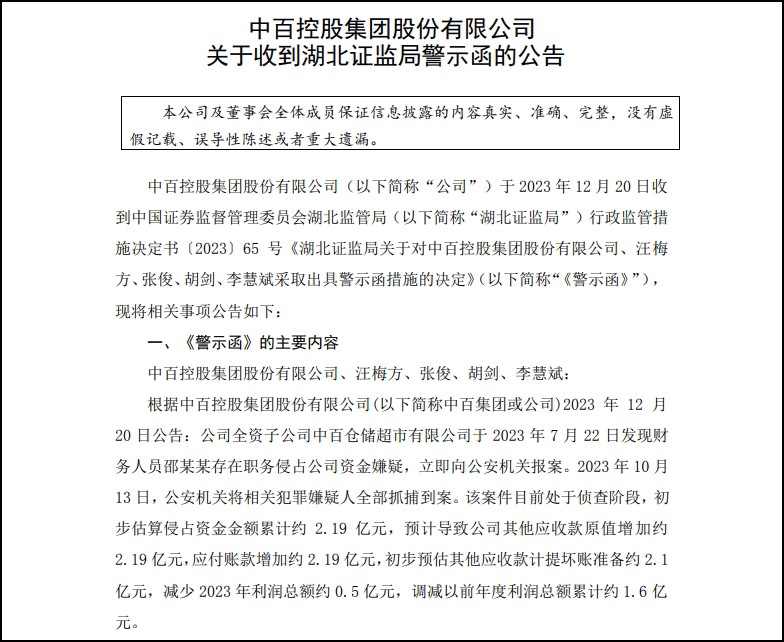 12月21日消息,中百集團(tuán)近日自曝遭員工職務(wù)侵占2.19億元,12月20日晚,中百集團(tuán)公告,收到湖北證監(jiān)局行政監(jiān)管措施決定書。 因重大事件存在信息披露不及時(shí),違反了相關(guān)規(guī)定,湖北證監(jiān)局決定對(duì)中百集團(tuán),及公司董事長(zhǎng)汪梅方、總經(jīng)理張俊、主管會(huì)計(jì)工作負(fù)責(zé)人胡劍、董秘李慧斌,采取出具警示函的行政監(jiān)管措施,并記入證券期貨市場(chǎng)誠(chéng)信檔案。 |