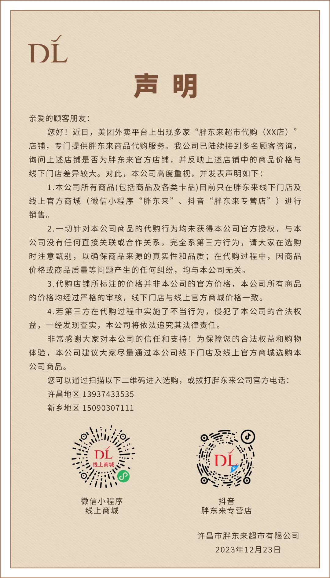 《零售網(wǎng)》獲悉,12月23日消息,胖東來超市官方微信發(fā)布一則聲明。 聲明中指出,在美團(tuán)外賣平臺上出現(xiàn)多家“胖東來超市代購 (XX店)”店鋪,專門提供胖東來商品代購服務(wù)。近期,胖東來收到了不少顧客咨詢詢問上述店鋪是否為胖東來官方店鋪,并反映上述店鋪中的商品價格與 線下門店差異較大。 胖東來在聲明中明確表示,所有胖東來的商品目前只在胖東來線下門店及線上官方商城銷售。對于那些代購店鋪,胖東來表示并未授權(quán)它們進(jìn)行銷售。因此,顧客在購買胖東來商品時,請務(wù)必選擇官方渠道,以免造成不必要的困擾。 聲明原文如下: 近日,美團(tuán)外賣平臺上出現(xiàn)多家“胖東來超市代購 (XX店)”店鋪,專門提供胖東來商品代購服務(wù)。 我公司已陸續(xù)接到多名顧客咨詢詢問上述店鋪是否為胖東來官方店鋪,并反映上述店鋪中的商品價格與線下門店差異較大。 對此,本公司高度重視,并發(fā)表聲明如下: 1.本公司所有商品(包括商品及各類卡品)目前只在胖東來線下門店及線上官方商城 (微信小程序“胖東來”、抖音“胖東來專營店”)進(jìn)行銷售。 2.一切針對本公司商品的代購行為均未獲得本公司官方授權(quán),與本公司沒有任何直接關(guān)聯(lián)或合作關(guān)系,完全系第三方行為,請大家在選購時注意甄別,以確保商品來源的真實(shí)性和品質(zhì),在代購過程中,因商品價格或商品質(zhì)量等問題產(chǎn)生的任何糾紛,均與本公司無關(guān)。 3.代購店鋪所標(biāo)注的價格并非本公司的官方價格,本公司所有商品的價格均經(jīng)過嚴(yán)格的審核,線下門店與線上官方商城價格一致。 4.若第三方在代購過程中實(shí)施了不當(dāng)行為,侵犯了本公司的合法權(quán)益,一經(jīng)發(fā)現(xiàn)查實(shí),本公司將依法追究其法律責(zé)任。 非常感謝大家對本公司的信任和支持!為保障您的合法權(quán)益和購物體驗(yàn),本公司建議大家盡量通過本公司線下門店及線上官方商城選購本公司商品。 許昌市胖東來超市有限公司 2023年12月23日 |