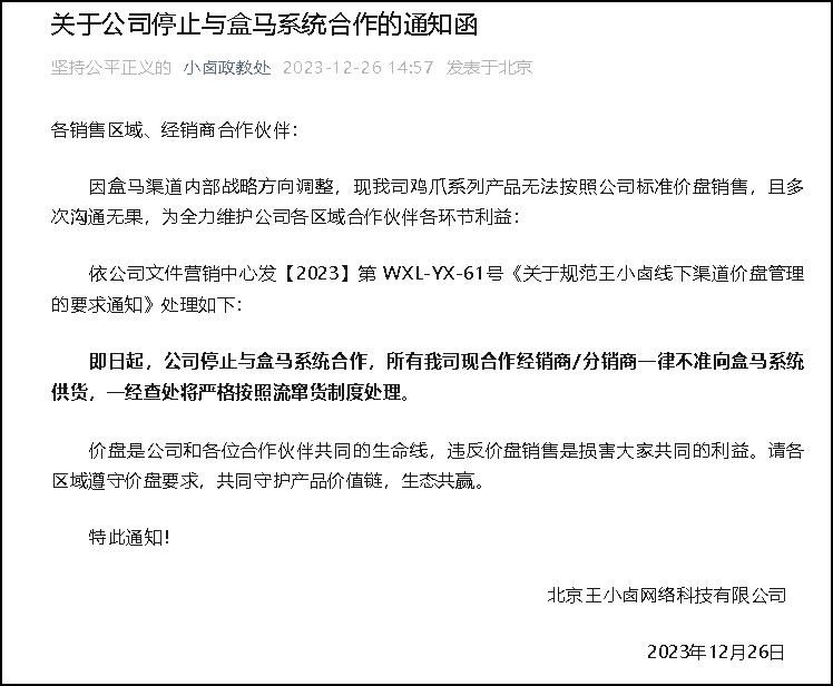 針對(duì)盒馬推行的低價(jià)策略,有供應(yīng)商選擇退出了。 12月27日消息,王小鹵官方公眾號(hào)于12月26日發(fā)布一則《關(guān)于公司停止與盒馬系統(tǒng)合作的通知函》。 通知函稱,因盒馬渠道內(nèi)部戰(zhàn)略方向調(diào)整,現(xiàn)我司雞爪系列產(chǎn)品無法按照公司標(biāo)準(zhǔn)價(jià)盤銷售,且多次溝通無果,為全力維護(hù)公司各區(qū)域合作伙伴各環(huán)節(jié)利益,王小鹵將停止與盒馬系統(tǒng)合作。 該通知函還宣布,即日起,公司停止與盒馬系統(tǒng)合作,所有我司現(xiàn)合作經(jīng)銷商/分銷商一律不準(zhǔn)向盒馬系統(tǒng)供貨,一經(jīng)查處將嚴(yán)格按照流竄貨制度處理。價(jià)盤是公司和各位合作伙伴共同的生命線,違反價(jià)盤銷售是損害大家共同的利益。請(qǐng)各區(qū)域遵守價(jià)盤要求,共同守護(hù)產(chǎn)品價(jià)值鏈,生態(tài)共贏。 王小鹵此次宣布停止與盒馬系統(tǒng)合作,顯然是對(duì)盒馬低價(jià)策略的一種回應(yīng)。今年7月,盒馬與山姆開打“價(jià)格戰(zhàn)”;10月,盒馬開始推出全新采購(gòu)模式,啟動(dòng)“折扣化”變革;12月,暫時(shí)不支持開通或者續(xù)費(fèi)盒馬會(huì)員,所有商品無需會(huì)員也能享受低價(jià)。 此前,盒馬CEO侯毅在新零供大會(huì)上也再次強(qiáng)調(diào)盒馬未來將全面推行折扣化變革。他表示,目前中國(guó)零售業(yè)的價(jià)格遠(yuǎn)遠(yuǎn)沒有競(jìng)爭(zhēng)力,在與電商低價(jià)競(jìng)爭(zhēng)時(shí),實(shí)體零售業(yè)沒有任何還手之力。但經(jīng)過折扣化的經(jīng)營(yíng)采購(gòu)模式改革后,零售行業(yè)反而比線上渠道更能做到低價(jià)!拔磥淼牡蛢r(jià)一定是在實(shí)體門店,而不是在電商。同時(shí),提升商品價(jià)格競(jìng)爭(zhēng)力將成為盒馬重心。” 而盒馬此舉,正如行業(yè)專業(yè)人士所說,從全球零售演進(jìn)趨勢(shì)來看,折扣化模式是大勢(shì)所趨。但是,低價(jià)策略也引發(fā)了與供應(yīng)商之間的利益沖突。 今年十月,王小鹵召開渠道伙伴大會(huì),創(chuàng)始人兼CEO王雄就線下業(yè)務(wù)暴露出的問題向廣大經(jīng)銷商道歉。王雄強(qiáng)調(diào),價(jià)盤是快消品的第一生命線。他當(dāng)時(shí)就指出,王小鹵將成立價(jià)盤委員會(huì),嚴(yán)控價(jià)盤。 此次,王小鹵因價(jià)格問題停止與盒馬的合作,或許是嚴(yán)控價(jià)盤一種體現(xiàn)。 |