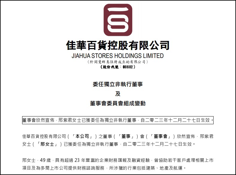 12月27日,佳華百貨控股有限公司公告宣布,邢紫君女士已獲委任為獨(dú)立非執(zhí)行董事,任命自2023年12月27日起生效。邢紫君將加入公司董事會(huì),并同時(shí)擔(dān)任審核委員會(huì)、提名委員會(huì)及薪酬委員會(huì)的成員。 邢紫君女士在企業(yè)財(cái)務(wù)報(bào)告及融資領(lǐng)域擁有超過(guò)23年的豐富經(jīng)驗(yàn)。她曾協(xié)助多家公司處理上市項(xiàng)目,并為多家上市公司提供專業(yè)的財(cái)務(wù)咨詢服務(wù)。邢紫君畢業(yè)于加拿大溫哥華不列顛哥倫比亞大學(xué)商業(yè)學(xué)專業(yè),獲得學(xué)士學(xué)位,并且她是美國(guó)注冊(cè)會(huì)計(jì)師協(xié)會(huì)的會(huì)員。 在職業(yè)生涯中,邢紫君女士曾在安永會(huì)計(jì)師事務(wù)所任職,并自2005年起專注于企業(yè)金融領(lǐng)域,曾在多家香港證監(jiān)會(huì)持牌金融機(jī)構(gòu)工作。她的工作經(jīng)歷涵蓋了中資、臺(tái)資以及港資金融機(jī)構(gòu),包括在海通國(guó)際資本有限公司和凱基證券亞洲有限公司的任職。最近的一份工作是在西證(香港)融資有限公司擔(dān)任執(zhí)行董事,任期從2022年至2023年。 市場(chǎng)認(rèn)為,邢紫君女士的加入將為佳華百貨在財(cái)務(wù)報(bào)告、融資、內(nèi)部監(jiān)控以及環(huán)境、社會(huì)和公司治理方面提供寶貴的專業(yè)見(jiàn)解。同時(shí),她的任命也被看作是增強(qiáng)公司董事會(huì)實(shí)力和多元化的重要一步。 佳華百貨控股有限公司是一家在開曼群島注冊(cè)成立的有限公司。此次董事會(huì)的變動(dòng)反映了公司致力于提升治理水平和增強(qiáng)企業(yè)實(shí)力,以更好地應(yīng)對(duì)市場(chǎng)挑戰(zhàn)和實(shí)現(xiàn)可持續(xù)發(fā)展。 |