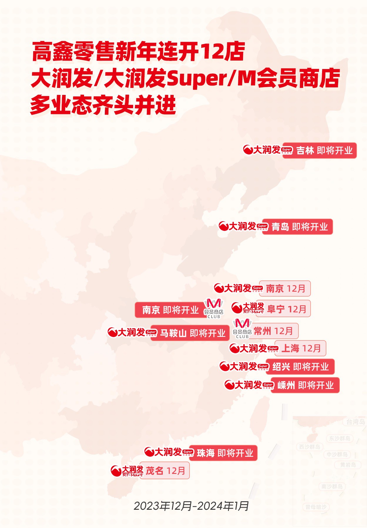 12月28日,大潤發(fā)Super上海大渡河店線下正式開業(yè)。緊跟著后一天,南京龍池店也將盛大開業(yè)。不止是中超業(yè)態(tài)大潤發(fā)Super,高鑫零售的主品牌大潤發(fā)也分別于12月23號(hào)在廣州茂名,12月30號(hào)江蘇鹽城新開出兩家門店。加速布局的M會(huì)員商店全國第二店、常州首店在12月30日也將迎來線下開業(yè)試營業(yè),南京首店即將在1月12日開業(yè)。 據(jù)悉,從2023年12月底到2024年1月,高鑫零售將在上海、南京、吉林、珠海、青島、常州、阜寧、茂名、紹興、馬鞍山、嵊州全國11個(gè)城市接連開出12家新店,涵蓋大潤發(fā)、大潤發(fā)Super、M會(huì)員商店三個(gè)業(yè)態(tài)。 這在家樂福、沃爾瑪?shù)壤吓粕坛娂婇]店,零售行業(yè)整體面臨結(jié)構(gòu)性轉(zhuǎn)型的寒冬周期里,高鑫零售旗下多個(gè)業(yè)態(tài)集中開店迎新年的開場(chǎng)顯得尤為難得。高鑫零售CEO林小海此前多次公開表示,“多業(yè)態(tài)全渠道”是公司的長期發(fā)展戰(zhàn)略,承擔(dān)第二增長曲線的中超業(yè)態(tài)大潤發(fā)Super、和M會(huì)員商店的加速開店,并不意味著大賣場(chǎng)業(yè)態(tài)大潤發(fā)的收縮,相反,大潤發(fā)也仍在全國范圍內(nèi)開出更多新店。 今日開業(yè)的大潤發(fā)Super店位于上海市普陀區(qū)梅嶺北路1098弄1號(hào),是大潤發(fā)在上海開出的第27家門店,也是大潤發(fā)Super在上海開出的第二家。大潤發(fā)Super定位社區(qū)型生鮮生活超市,門店面積約在1500-4000平方之間,品類和sku更為精選,約5000個(gè)。今年9家大潤發(fā)Super先后在宿遷、成都、東莞、松原、蘭州、唐山、長春、濟(jì)南等城市開業(yè)。從2020年開出首家至今,高鑫零售已擁有19家大潤發(fā)Super。 (上海大潤發(fā)Super大渡河路店12月28日開業(yè)現(xiàn)場(chǎng)) 1996年,大潤發(fā)在上海開出第一家門店,開啟了全國擴(kuò)張之路。不難發(fā)現(xiàn),大潤發(fā)新開店大多布局在長三角和珠三角,而華東區(qū)(江蘇省、浙江省、上海市、安徽。⿲(shí)際上也是大潤發(fā)的優(yōu)勢(shì)區(qū)域,全國500多家門店中的超過一半都分布在此。 今年4月28日在揚(yáng)州開出的M會(huì)員商店全國首店,也被認(rèn)為是從優(yōu)勢(shì)區(qū)域布局為先,并被視為將如今競(jìng)爭(zhēng)激烈的會(huì)員店賽道之爭(zhēng)的戰(zhàn)場(chǎng),從一線城市直接拉到了低線城市。 12月28日, M會(huì)員商店官宣落戶常州的全國二店將在12月30日搶在元旦前啟動(dòng)試營業(yè)。常州M會(huì)員商店坐落于常州市天寧區(qū)蘭陵北路301號(hào),獨(dú)棟建筑體總面積近4萬平方米(不含車道面積),1層和3層停車場(chǎng)共擁有800個(gè)專屬停車位,供會(huì)員免費(fèi)停車3小時(shí)。 常州迎來了首個(gè)主城區(qū)會(huì)員制商店,半個(gè)月后,南京首家M會(huì)員商店也將正式亮相,根據(jù)公開信息,高鑫零售計(jì)劃明年春季結(jié)束前開出5家M會(huì)員商店。 面對(duì)日益加劇的零售市場(chǎng)競(jìng)爭(zhēng),傳統(tǒng)商超如何在這場(chǎng)行業(yè)“風(fēng)暴”中突出重圍?或許還是那簡(jiǎn)單的8個(gè)字:商品、價(jià)格、服務(wù)、體驗(yàn)。零售一直都是最為活躍的商業(yè)形態(tài),也是最具煙火氣的,大潤發(fā)的接連開店,為行業(yè)帶來了積極向上的信號(hào)。 |