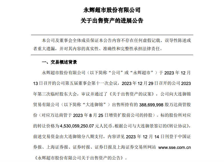 《零售網(wǎng)》獲悉,12月30日,永輝超市發(fā)布一則關(guān)于出售資產(chǎn)的進展公告。 公告中稱,12月29日召開的公司2023年第三次臨時股東大會,審議并通過了《關(guān)于出售資產(chǎn)的議案》,公司向大連御錦貿(mào)易有限公司(以下簡稱“大連御錦”)出售所持有的 388,699,998 股萬達商管股份(對應(yīng)萬達商管于2023年8月25 日增資擴股前公司的持股)。標(biāo)的股份所對應(yīng)的轉(zhuǎn)讓價格為4,530,059,250.07 元人民幣。根據(jù)公司與大連御景簽訂的《轉(zhuǎn)讓協(xié)議》,前述交易資金由大連御錦分八期支付,目前公司已收到首期價款3億元。 此前,永輝超市12月13日晚間公告稱,擬向大連御錦貿(mào)易有限公司出售大連萬達商業(yè)管理集團股份有限公司3.89億股,占大連萬達商管總股本的1.43%,轉(zhuǎn)讓價格為45.3億元。 永輝超市稱,本次資產(chǎn)交易的目的是為了盤活公司資產(chǎn),符合公司縮小投資規(guī)模戰(zhàn)略。截至公告日,該股權(quán)投資賬面價值為39.18億元。公司稱,本次股權(quán)交易價格較股權(quán)賬面價值溢價6.12億元,其中第一期股權(quán)交易完成后,將影響公司2023年稅前利潤2859.58萬元。 數(shù)據(jù)顯示,2023年前三季度,永輝超市實現(xiàn)營業(yè)收入約620.88億元,同比下降12.44%;實現(xiàn)歸屬于上市公司股東的凈利潤約5229.12萬元。經(jīng)營活動產(chǎn)生的現(xiàn)金流量凈額約53.71億元,同比下降0.23%。 |