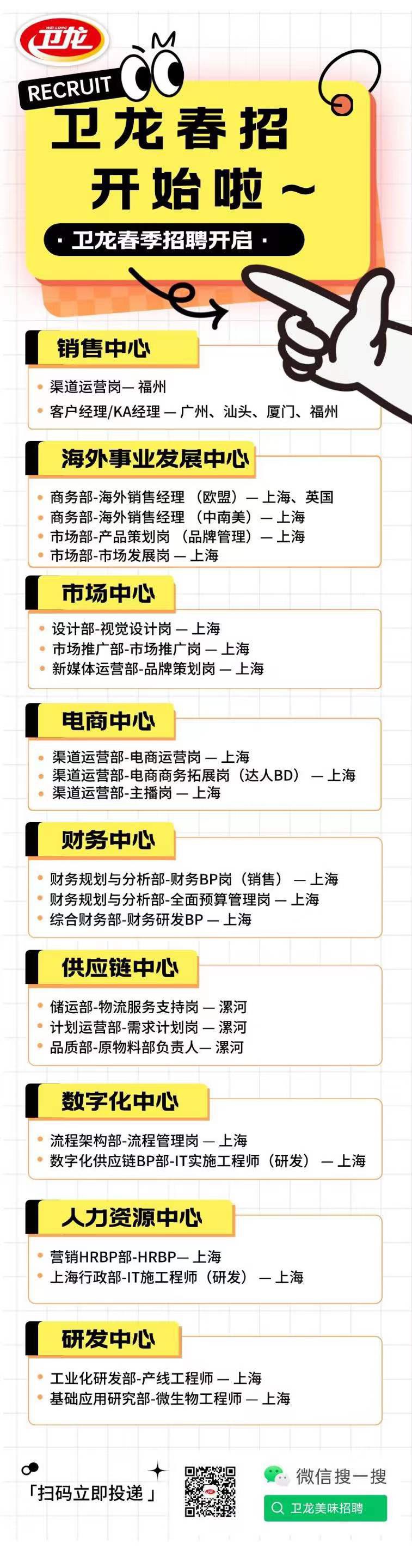 《零售網(wǎng)》獲悉,1月4日,衛(wèi)龍發(fā)布了一則春季招聘信息。 招聘職位涵蓋了銷售、海外事業(yè)發(fā)展、市場、電商、供應(yīng)鏈等9大中心,并提供了多個崗位,包括渠道運(yùn)營、客戶經(jīng)理、產(chǎn)品策劃、電商運(yùn)營、市場推廣、流程架構(gòu)部和營銷HRBP部等職位。 二十多年前,衛(wèi)龍董事長劉衛(wèi)平懷揣夢想,白手起家,在河南漯創(chuàng)建了衛(wèi)龍美味。如今,衛(wèi)龍美味已發(fā)展成為國內(nèi)最大的集研發(fā)、生產(chǎn)和銷售為一體的現(xiàn)代化辣味休閑食品企業(yè)。目前,衛(wèi)龍美味旗下產(chǎn)品線涵蓋調(diào)味面制品、菜制品、豆制品及其他品類,所涉及的重點(diǎn)產(chǎn)品包括大、小面筋,親嘴燒,麻辣麻辣,魔芋爽,風(fēng)吃海帶和78°鹵蛋等。 衛(wèi)龍美味的目標(biāo)遠(yuǎn)不止于此,他們正在大步流星修煉內(nèi)功,在流程在線、業(yè)務(wù)在線、智能制造等方面加大投入,通過“數(shù)智化”不斷提升組織效率。作為行業(yè)龍頭,衛(wèi)龍美味現(xiàn)有2所研發(fā)中心,國內(nèi)銷售終端覆蓋73.5萬,暢銷全球30多個國家和地區(qū)。 2022年12月15日,衛(wèi)龍美味在港交所正式上市,自此開啟全球化發(fā)展全新篇章。未來,衛(wèi)龍美味將依托企業(yè)使命的強(qiáng)大驅(qū)動力,為實(shí)現(xiàn)“傳統(tǒng)美食娛樂化、休閑化、便捷化、親民化、數(shù)智化,樂活123年的生態(tài)平臺”的美好愿景不懈努力,以傳統(tǒng)美味為載體,將中國博大精深的美食文化向世界傳播。不斷精進(jìn),不斷努力,讓世界人人愛上中國味! |