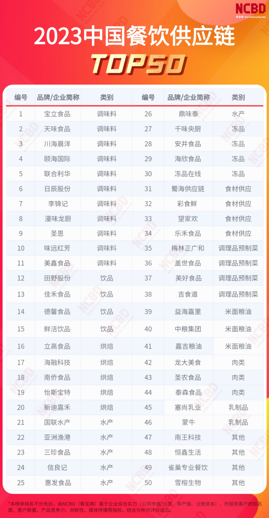 本文來源 / 餐寶典 近日,餐飲大數(shù)據(jù)研究機(jī)構(gòu)NCBD(餐寶典)正式發(fā)布“2023中國餐飲供應(yīng)鏈TOP50”榜單,蜀海、塞尚乳業(yè)、美好食品、李錦記等企業(yè)上榜。 據(jù)悉,此次評選針對數(shù)千家餐飲供應(yīng)鏈企業(yè),基于企業(yè)綜合實(shí)力(公司市值/估值、年產(chǎn)值、注冊資本)、所服務(wù)客戶的知名度、客戶數(shù)量、產(chǎn)品競爭力、創(chuàng)新性、媒體傳播等指標(biāo),通過桌面研究、深度訪談、專家調(diào)研評審等方法,結(jié)合分析師評價(jià),進(jìn)行初審、復(fù)審,最終確定上榜名單。 上榜企業(yè)中,調(diào)味料類最多,共11家;水產(chǎn)和烘焙緊隨其后,分別是6家和5家。 具體榜單如下: |