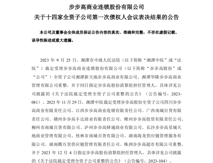 1月11日,步步高商業(yè)連鎖股份有限公司發(fā)布公告,披露其十四家全資子公司第一次債權人會議表決結果。 公告顯示,湘潭市中級人民法院已裁定受理步步高股份全資子公司湘潭新天地步步高商業(yè)有限公司、湘潭華隆步步高商業(yè)管理有限公司等十四家公司的重整申請,并指定步步高股份清算組擔任管理人。 截至表決截止時間,各家公司同意相關議案的債權人占出席會議有表決權債權人的比例均超過90%,且所代表的債權額占無財產擔保債權總額的比例也均超過50%。 根據(jù)破產法的規(guī)定,這些決議已獲得通過,并對全體債權人有約束力。 |