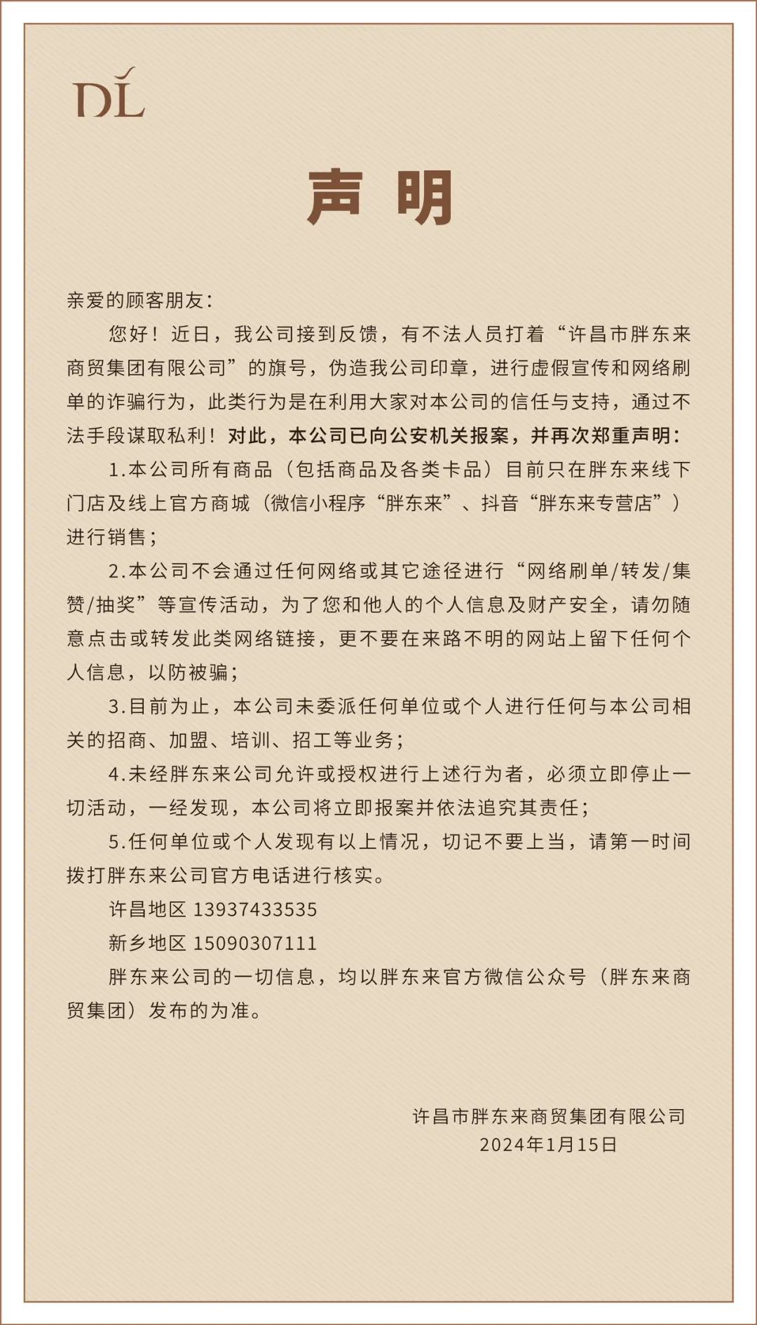 1月15日,胖東來官方微信公眾號(胖東來商貿集團)發(fā)布聲明,近日有不法人員打著“許昌市胖東來商貿集團有限公司”的旗號,偽造該公司印章,進行虛假宣傳和網絡刷單的詐騙行為,通過不法手段謀取私利!對此,胖東來已向公安機關報案。 聲 明 親愛的顧客朋友: 您好!近日,我公司接到反饋,有不法人員打著“許昌市胖東來商貿集團有限公司”的旗號,偽造我公司印章,進行虛假宣傳和網絡刷單的詐騙行為,此類行為是在利用大家對本公司的信任與支持,通過不法手段謀取私利!對此,本公司已向公安機關報案,并再次鄭重聲明: 1.本公司所有商品(包括商品及各類卡品)目前只在胖東來線下門店及線上官方商城(微信小程序“胖東來”、抖音“胖東來專營店”)進行銷售; 2.本公司不會通過任何網絡或其它途徑進行“網絡刷單/轉發(fā)/集贊/抽獎”等宣傳活動,為了您和他人的個人信息及財產安全,請勿隨意點擊或轉發(fā)此類網絡鏈接,更不要在來路不明的網站上留下任何個人信息,以防被騙; 3.目前為止,本公司未委派任何單位或個人進行任何與本公司相關的招商、加盟、培訓、招工等業(yè)務; 4.未經胖東來公司允許或授權進行上述行為者,必須立即停止一切活動,一經發(fā)現(xiàn),本公司將立即報案并依法追究其責任; 5.任何單位或個人發(fā)現(xiàn)有以上情況,切記不要上當,請第一時間撥打胖東來公司官方電話進行核實。 許昌地區(qū)13937433535 新鄉(xiāng)地區(qū)15090307111 胖東來公司的一切信息,均以胖東來官方微信公眾號(胖東來商貿集團)發(fā)布的為準。 許昌市胖東來商貿集團有限公司 2024年1月15日 |