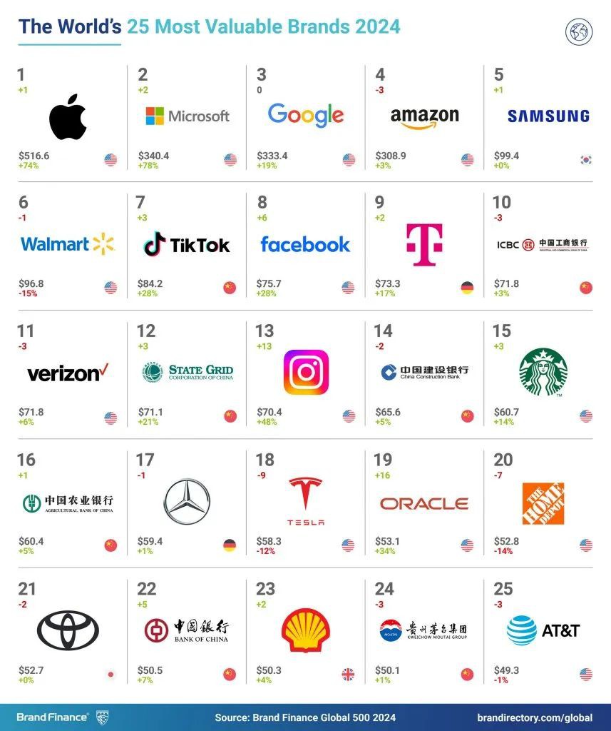 1月17日消息,每一年,全球領(lǐng)先品牌價值咨詢公司Brand Finance都會對5000家最著名品牌進行評估。全球前500名最有價值且最卓越的全球品牌將被納入年度Brand Finance Global 500 2024排名。 今年,蘋果(Apple)實現(xiàn)了卓越的品牌價值增長,劇增2190億美元(74%)至5170億美元,重新奪回全球最有價值品牌的頭銜。盡管iPhone銷量已經(jīng)基本趨于平穩(wěn),但其尋找新市場、擴展生態(tài)系統(tǒng),并鼓勵人們更換為更高價值iPhone的戰(zhàn)略非常奏效。蘋果仍然保持了其在頂級智能手機市場中的地位,占據(jù)了71%的市場份額。 英偉達(NVIDIA)品牌價值增加163%,達到445億美元,成為了全球發(fā)展最快的品牌。作為AI領(lǐng)域核心的芯片供應(yīng)商,英偉達被認為創(chuàng)新度極高,同時熟悉程度、考量程度和推薦度均同比上升。 Deutsche Telekom品牌價值增加17%,達到733億美元,摘得世界最有價值通訊品牌的桂冠,超過了Verizon,其品牌價值增加 6%,達到718億美元。Deutsche Telekom排名全球第9,同時也是最有價值的歐洲品牌。 特斯拉(Tesla)品牌價值下降12%至583億美元,跌出了前10名,跌至第18位,而比亞迪(BYD)品牌價值增加20%,達到121億美元,其已超越特斯拉成為全球最大的電動車制造商。盡管比亞迪的產(chǎn)量更高,但特斯拉的品牌價值仍是比亞迪的五倍。這突出了品牌作為企業(yè)資產(chǎn)的長遠意義,幫助特斯拉實現(xiàn)價格溢價,支持其公司價值,并有可能推動新的增長。 |