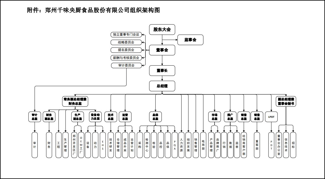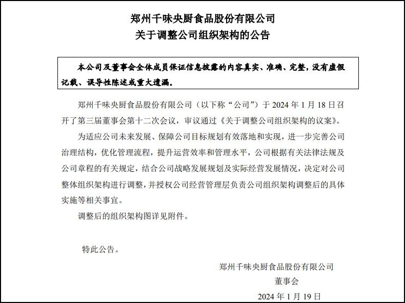 1月18日,被稱為預制菜第一股千味央廚公告,公司召開了第三屆董事會第十二次會議,審議通過《關于調整公司組織架構的議案》。 公告稱,為適應公司未來發(fā)展、保障公司目標規(guī)劃有效落地和實現(xiàn),進一步完善公司治理結構,優(yōu)化管理流程,提升運營效率和管理水平。 公告還表示,公司根據有關法律法規(guī)及公司章程的有關規(guī)定,結合公司戰(zhàn)略發(fā)展規(guī)劃及實際經營發(fā)展情況,決定對公司整體組織架構進行調整,并授權公司經營管理層負責公司組織架構調整后的具體實施等相關事宜。 |