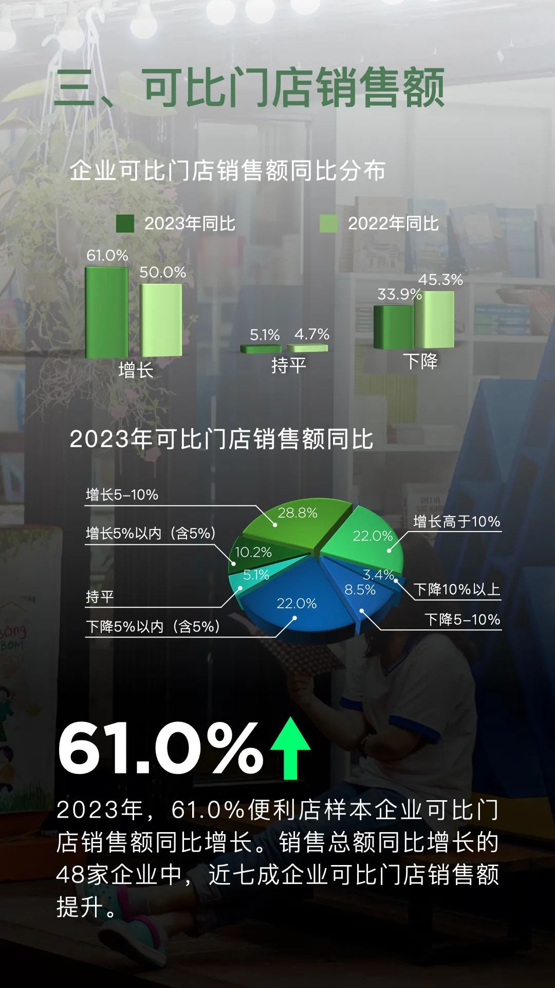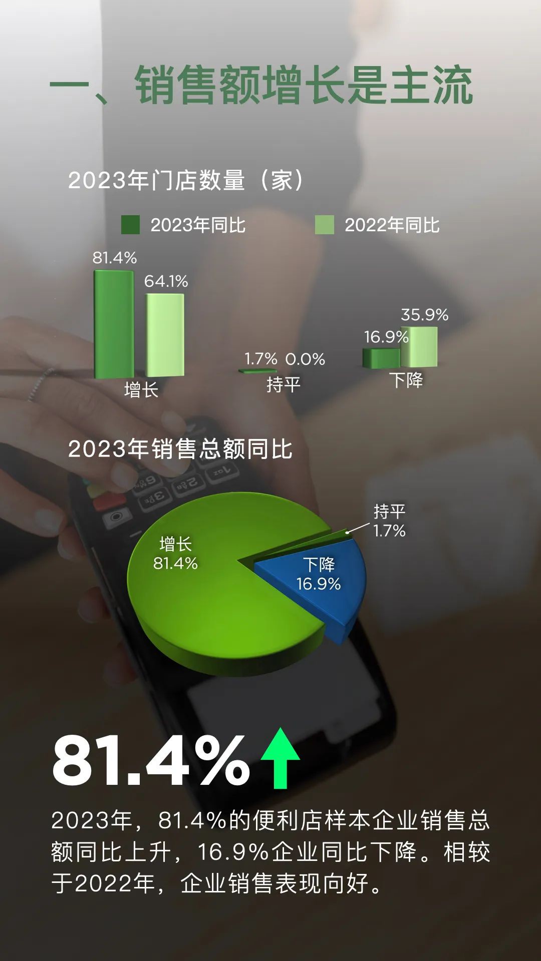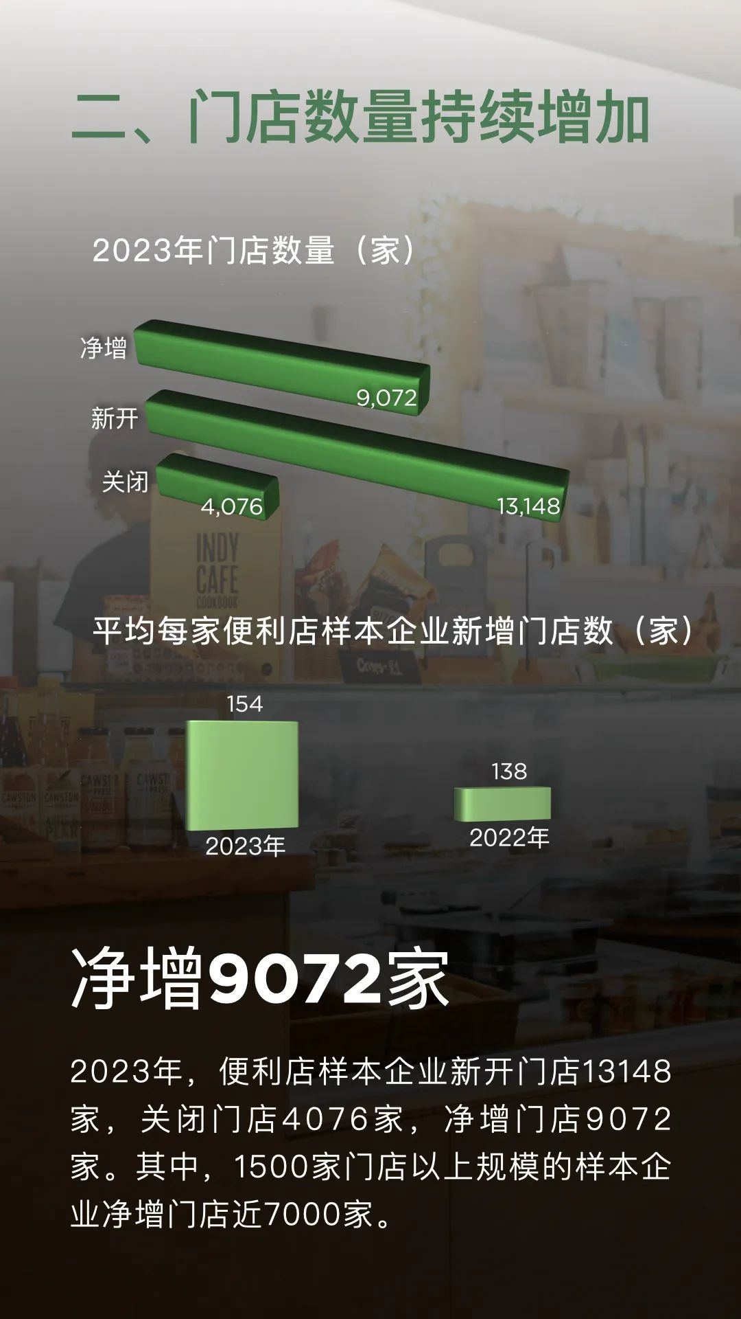 1月19日,中國連鎖經(jīng)營協(xié)會發(fā)布《2023年便利店業(yè)態(tài)發(fā)展情況概覽》顯示,樣本便利店企業(yè)新開門店數(shù)量達(dá)到13148家,同時關(guān)閉門店4076家,凈增門店9072家。其中,規(guī)模在1500家門店以上的企業(yè)貢獻了近7000家的凈增門店,占據(jù)了凈增門店總數(shù)的近八成。與2022年相比,頭部企業(yè)的拓店速度明顯加快。 在銷售額方面,2023年有81.4%的便利店企業(yè)實現(xiàn)了同比增長,而僅有16.9%的企業(yè)銷售總額出現(xiàn)同比下降。這一數(shù)據(jù)表明,便利店行業(yè)的整體銷售情況相較于2022年有所改善。在銷售同比出現(xiàn)下滑的企業(yè)中,有九成企業(yè)的可比門店銷售出現(xiàn)下降,其中包括一些知名企業(yè)。 從同店銷售情況來看,2023年有61.0%的便利店樣本企業(yè)可比門店銷售額實現(xiàn)了同比增長。在銷售總額同比增長的48家企業(yè)中,有近七成企業(yè)的可比門店銷售也得到了提升。相較于2022年,企業(yè)的門店質(zhì)量有了進一步的提升。 線上銷售方面,2023年有61.0%的便利店樣本企業(yè)線上銷售總額同比增長,但也有20.3%的企業(yè)同比下降。與2022年相比,線上銷售的增長速度有所放緩。這可能是由于實體門店的客流恢復(fù)對線上銷售產(chǎn)生了一定的替代效應(yīng)。 總體而言,便利店行業(yè)在多個方面表現(xiàn)出了強勁的發(fā)展態(tài)勢,包括銷售額、門店數(shù)量、可比門店銷售額、企業(yè)凈利潤、門店來客數(shù)、線上銷售額以及重點工作和發(fā)展戰(zhàn)略等。隨著消費者需求的不斷增長和市場環(huán)境的持續(xù)改善,便利店行業(yè)有望在未來繼續(xù)保持穩(wěn)健的發(fā)展態(tài)勢。 具體如下: 一、銷售額增長是主流 2023年,81.4%的便利店樣本企業(yè)銷售總額同比上升,16.9%企業(yè)同比下降。相較于2022年,企業(yè)銷售表現(xiàn)向好。 二、門店數(shù)量持續(xù)增加 2023年,便利店樣本企業(yè)新開門店13148家,關(guān)閉門店4076家,凈增門店9072家。其中,1500家門店以上規(guī)模的樣本企業(yè)凈增門店近7000家。 三、可比門店銷售額 2023年,61.0%便利店樣本企業(yè)可比門店銷售額同比增長。銷售總額同比增長的48家企業(yè)中,近七成企業(yè)可比門店銷售額提升。 四、企業(yè)凈利潤 2023年,52.5%的便利店樣本企業(yè)凈利潤同比實現(xiàn)增長。32.2%的企業(yè)凈利潤同比出現(xiàn)下降。贏利能力相較2022年有所提升。 五、門店來客數(shù) 2023年,55.9%的便利店樣本企業(yè)來客數(shù)同比增長,37.3%的樣本企業(yè)來客數(shù)同比下降。 六、線上銷售總額 2023年,61.0%便利店樣本企業(yè)線上銷售總額同比增長,20.3%企業(yè)同比下降。實體門店的客流恢復(fù)替代了部分線上銷售。 七、2024年重點工作 2024年,便利店樣本企業(yè)除繼續(xù)對門店標(biāo)準(zhǔn)化數(shù)字化改造和線上業(yè)務(wù)拓展外,嘗試新門店類型成為新晉的三大重點工作之一。 八、發(fā)展戰(zhàn)略 2024年相較2023年,企業(yè)態(tài)度更為樂觀,71.2%的便利店樣本企業(yè)選擇擴張戰(zhàn)略。半數(shù)以上企業(yè)選擇深耕已有區(qū)域夯實競爭優(yōu)勢。 |