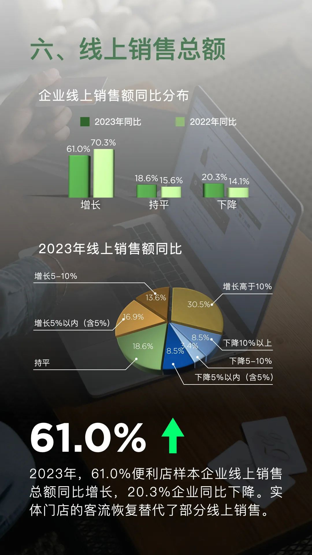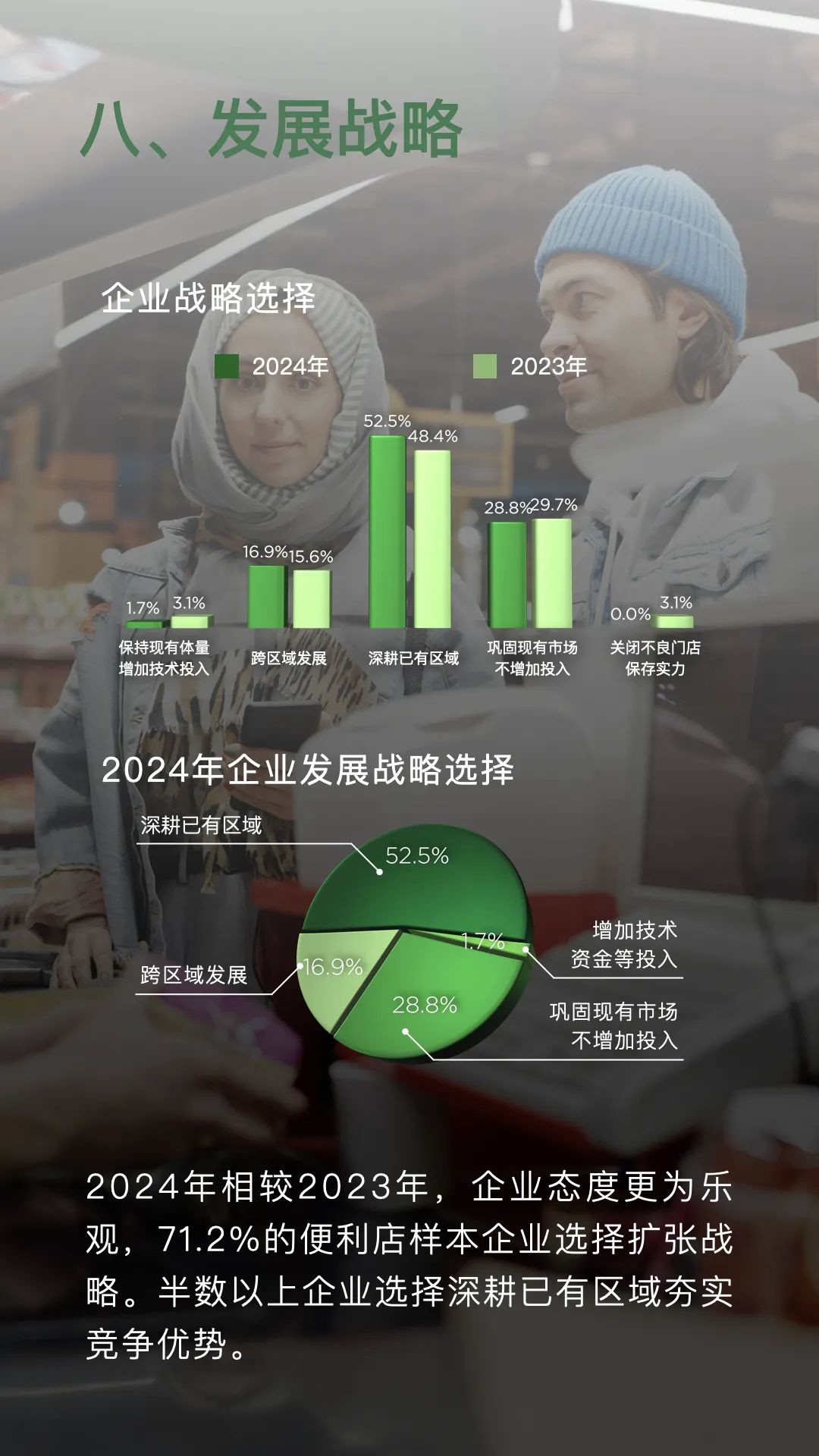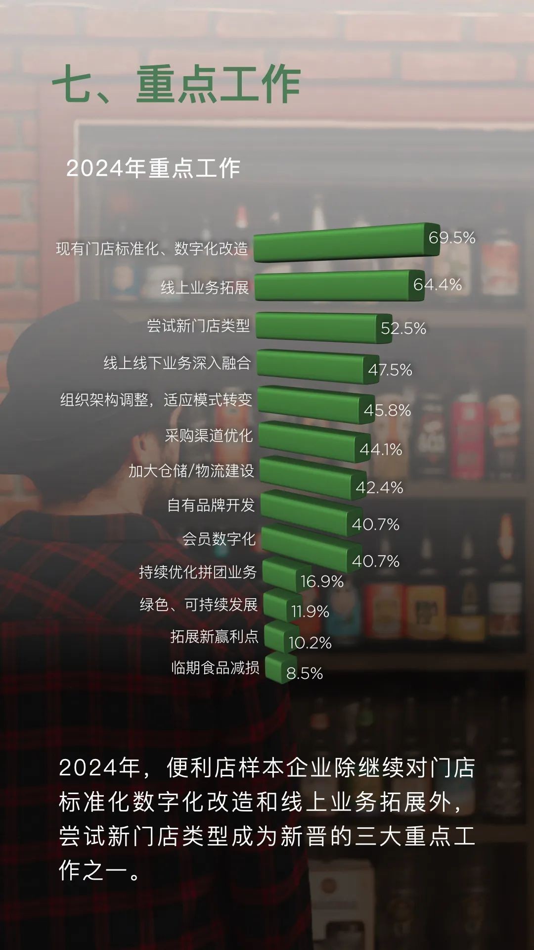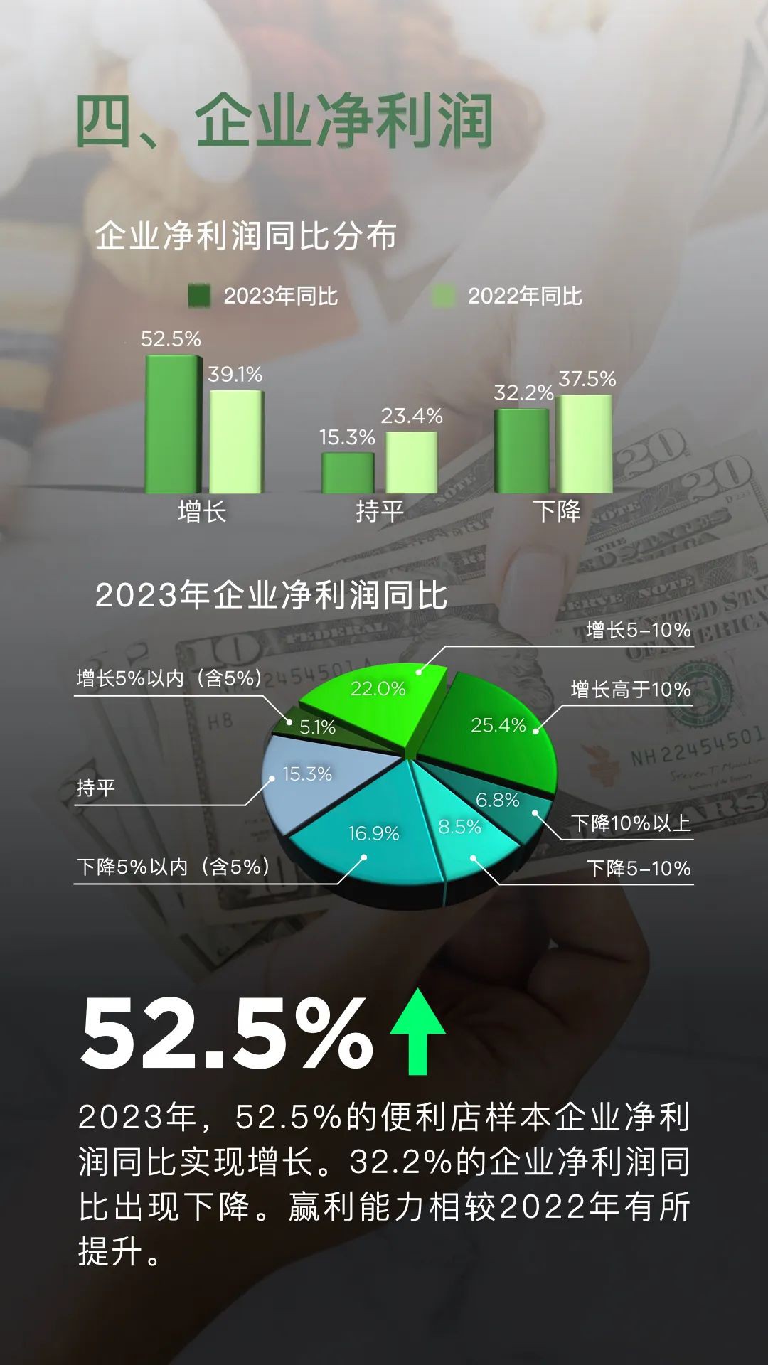 1月19日,中國連鎖經(jīng)營協(xié)會發(fā)布《2023年便利店業(yè)態(tài)發(fā)展情況概覽》顯示,樣本便利店企業(yè)新開門店數(shù)量達(dá)到13148家,同時關(guān)閉門店4076家,凈增門店9072家。其中,規(guī)模在1500家門店以上的企業(yè)貢獻了近7000家的凈增門店,占據(jù)了凈增門店總數(shù)的近八成。與2022年相比,頭部企業(yè)的拓店速度明顯加快。 在銷售額方面,2023年有81.4%的便利店企業(yè)實現(xiàn)了同比增長,而僅有16.9%的企業(yè)銷售總額出現(xiàn)同比下降。這一數(shù)據(jù)表明,便利店行業(yè)的整體銷售情況相較于2022年有所改善。在銷售同比出現(xiàn)下滑的企業(yè)中,有九成企業(yè)的可比門店銷售出現(xiàn)下降,其中包括一些知名企業(yè)。 從同店銷售情況來看,2023年有61.0%的便利店樣本企業(yè)可比門店銷售額實現(xiàn)了同比增長。在銷售總額同比增長的48家企業(yè)中,有近七成企業(yè)的可比門店銷售也得到了提升。相較于2022年,企業(yè)的門店質(zhì)量有了進一步的提升。 線上銷售方面,2023年有61.0%的便利店樣本企業(yè)線上銷售總額同比增長,但也有20.3%的企業(yè)同比下降。與2022年相比,線上銷售的增長速度有所放緩。這可能是由于實體門店的客流恢復(fù)對線上銷售產(chǎn)生了一定的替代效應(yīng)。 總體而言,便利店行業(yè)在多個方面表現(xiàn)出了強勁的發(fā)展態(tài)勢,包括銷售額、門店數(shù)量、可比門店銷售額、企業(yè)凈利潤、門店來客數(shù)、線上銷售額以及重點工作和發(fā)展戰(zhàn)略等。隨著消費者需求的不斷增長和市場環(huán)境的持續(xù)改善,便利店行業(yè)有望在未來繼續(xù)保持穩(wěn)健的發(fā)展態(tài)勢。 具體如下: 一、銷售額增長是主流 2023年,81.4%的便利店樣本企業(yè)銷售總額同比上升,16.9%企業(yè)同比下降。相較于2022年,企業(yè)銷售表現(xiàn)向好。 二、門店數(shù)量持續(xù)增加 2023年,便利店樣本企業(yè)新開門店13148家,關(guān)閉門店4076家,凈增門店9072家。其中,1500家門店以上規(guī)模的樣本企業(yè)凈增門店近7000家。 三、可比門店銷售額 2023年,61.0%便利店樣本企業(yè)可比門店銷售額同比增長。銷售總額同比增長的48家企業(yè)中,近七成企業(yè)可比門店銷售額提升。 四、企業(yè)凈利潤 2023年,52.5%的便利店樣本企業(yè)凈利潤同比實現(xiàn)增長。32.2%的企業(yè)凈利潤同比出現(xiàn)下降。贏利能力相較2022年有所提升。 五、門店來客數(shù) 2023年,55.9%的便利店樣本企業(yè)來客數(shù)同比增長,37.3%的樣本企業(yè)來客數(shù)同比下降。 六、線上銷售總額 2023年,61.0%便利店樣本企業(yè)線上銷售總額同比增長,20.3%企業(yè)同比下降。實體門店的客流恢復(fù)替代了部分線上銷售。 七、2024年重點工作 2024年,便利店樣本企業(yè)除繼續(xù)對門店標(biāo)準(zhǔn)化數(shù)字化改造和線上業(yè)務(wù)拓展外,嘗試新門店類型成為新晉的三大重點工作之一。 八、發(fā)展戰(zhàn)略 2024年相較2023年,企業(yè)態(tài)度更為樂觀,71.2%的便利店樣本企業(yè)選擇擴張戰(zhàn)略。半數(shù)以上企業(yè)選擇深耕已有區(qū)域夯實競爭優(yōu)勢。 |