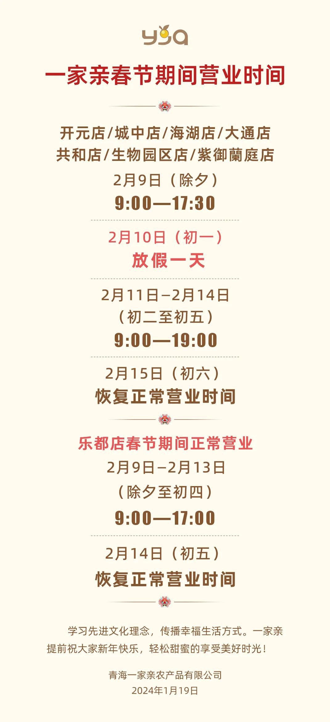 職業(yè)零售網(wǎng)獲悉,1月19日,青海一家親生鮮超市發(fā)布2024年一家親春節(jié)期間營業(yè)時間調整公告! 公開信中表示,為了春節(jié)期間讓員工分享生命中更多的幸福和溫暖,也為了讓員工感受到企業(yè)的進步是讓大家有更好的寄托,是值得他們認可和熱愛的,一家親公司決定:2024年2月10日(正月初一)放假一天。 值得注意的是,由于樂都店新開業(yè),為了方便周邊顧客購物,春節(jié)當天暫不閉店。隨著團隊的成長和工作的完善,我們后期也將調整營業(yè)時間,讓員工感受到生活的輕松與快樂。 公開信原文如下: 親愛的顧客朋友: 你們好!非常感謝大家對一家親的支持和關愛,隨著企業(yè)的發(fā)展和社會的進步,一家親的企業(yè)文化制度也向著更人性化(考慮到員工的身體健康和生活質量)的方向提升和完善。由于員工常年的辛苦,為一家親的發(fā)展付出了很多,同時也失去了一些與家人、孩子、朋友團聚享樂的寶貴時光。 為了春節(jié)期間讓員工分享生命中更多的幸福和溫暖,也為了讓員工感受到企業(yè)的進步是讓大家有更好的寄托,是值得他們認可和熱愛的,一家親公司決定:2024年2月10日(正月初一)放假一天。(春節(jié)期間各店營業(yè)時間有調整,詳見下文) 希望大家理解,我們所做的目的是為了學習和踐行美好的商業(yè)理念,讓更多的人停下來歇歇,享受生命的美好。只有身心的健康,我們的生命才會釋放出無窮的智慧和無限的創(chuàng)造力,會分享當下,享受生活,明天才會更有動力,更加陽光! 我們一定會和商業(yè)同行們相互學習,相互進步,不斷促進商業(yè)繁榮及提升品味,把更多的人培養(yǎng)成優(yōu)秀的,品德高尚的,腳踏實地、有愛心、樂觀、專業(yè)的商業(yè)人才。讓更多經(jīng)商的朋友明白經(jīng)營的目的不只是為了掙錢,還知道我們肩負著更多的社會責任和使命,一起創(chuàng)造和分享商業(yè)為我們帶來的快樂和幸福! 謝謝大家! 青海一家親農產(chǎn)品有限公司 2024年1月19日 |