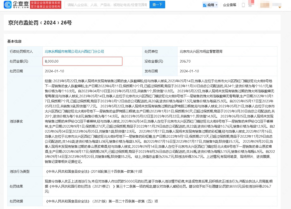 企查查App顯示,近日,北京永輝超市有限公司大興西紅門分公司因違反食品安全法,被北京市大興區(qū)市場監(jiān)督管理局罰款8000元,并沒收違法所得。 處罰事由顯示,2023年5月至9月間,當(dāng)事人銷售過期的食人族酸辣粉1個、饞大師泡椒酸辣無骨鴨掌3袋、金羅烤腸1個、來伊份QQ豆干香辣味1袋、彩虹糖9袋、泰山原漿啤酒8瓶,上述商品貨值總金額為206.7元。 |