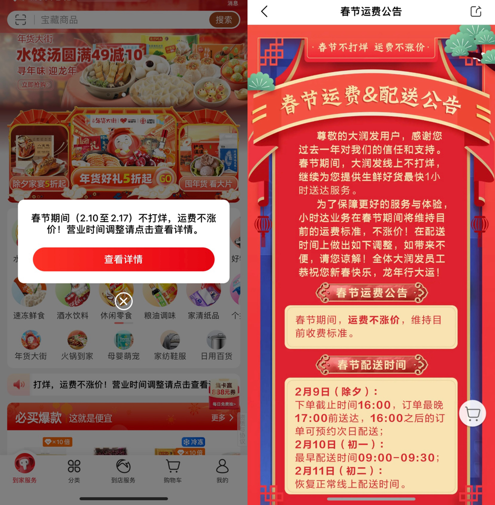 1月30日,大潤發(fā)優(yōu)鮮APP發(fā)布線上春節(jié)運費及配送公告,全國優(yōu)鮮渠道在過年期間(2月10日-2月17日,正月初一至初八)運費不漲價,維持目前收費標準、生鮮好貨小時達服務持續(xù)保障。 據(jù)大潤發(fā)相關數(shù)據(jù),1月13日上線的年貨大街,目前華東區(qū)線上各類商品訂單數(shù)同比去年同期增幅明顯,高達431%。牛肉、智利車厘子、紅顏草莓、白對蝦、帝王海蝦滑等商品熱銷;車厘子、有機牛奶占據(jù)全國搜索前2位;春節(jié)水果禮盒同比日增長率高峰時達到214%。 松鼠桂魚、豬肚雞和佛跳墻成為大潤發(fā)年菜熱銷TOP3,其中松鼠桂魚業(yè)績環(huán)比增長762%占據(jù)榜首。值得一提的是,《繁花》電視劇熱播后,上海老味道美食、老字號品牌受關注,豫園制造禮盒系列業(yè)績環(huán)比增長高達569%,八寶飯系列環(huán)比增長76%;鹵味豬肉、牛肉系列等熟食也在春節(jié)迎來高增長。 除了選好食材做高品質(zhì)年夜飯外,新年煥新的年飾年花、送禮必備的禮盒年貨也是必不可少。大潤發(fā)鮮花團隊負責人透露,目前大潤發(fā)全國年宵花主力品種有富貴竹、銀柳、澳洲臘梅、蝴蝶蘭等,預估今年全國年宵花業(yè)績同比可增長50%左右。 在年飾上,消費者對有新年“龍”元素的產(chǎn)品興趣更高,今年春節(jié)大潤發(fā)聯(lián)名奶龍、寶可夢IP推出系列商品,寶可夢在年前陸續(xù)上市26個單品,春聯(lián)窗花紅包等年節(jié)飾品就有14項之多。龍年特定包裝的商品、好彩頭的禮盒,有特色的商品和玩具都成為新年熱門選擇。 年輕人在年貨購買上,更加看重“健康”和“品質(zhì)”,送長輩聚焦保健食品、奶粉、早餐、保健酒等。食養(yǎng)結(jié)合的禮盒受到消費者青睞,比如呷無忌的堅果禮盒在年貨大街期間的業(yè)績環(huán)比上月增長127%,還有薈尚的有機雜糧禮盒、菌菇禮盒等,送禮也送健康。 大潤發(fā)春節(jié)不打烊,通過差異化年節(jié)商品、龍年限定系列等,打造年夜飯、年貨、年禮、新年煥新居等多個場景,大潤發(fā)一年一度的“年貨大街”1月13日開市至今持續(xù)進行中,超1000款年貨禮盒一站式購足。“新年佳釀榜”“家宴推薦榜”“新意好禮榜”……大潤發(fā)推出10大年節(jié)必買榜單,加碼不一樣的年貨,持續(xù)為消費者提供既有品質(zhì)又有新意的春節(jié)購物選擇。 |