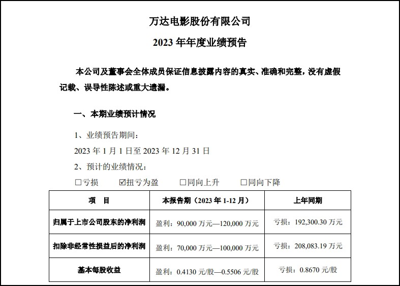 1月30日,萬達電影股份有限公司發(fā)布2023年度業(yè)績預(yù)告,預(yù)計實現(xiàn)盈利。 報告期內(nèi),萬達電影預(yù)計歸屬于上市公司股東的凈利潤在9億至12億元之間,而上年同期為虧損19.23億元?鄢墙(jīng)常性損益后的凈利潤預(yù)計在7億至10億元之間,上年同期為虧損20.81億元。 萬達電影在公告中詳細(xì)解釋了業(yè)績變動的原因。首先,2023年電影行業(yè)持續(xù)向好,全國電影票房同比增長83.4%,恢復(fù)至2019年的85.6%。公司順應(yīng)市場規(guī)律和觀眾需求,在變化中積極變革,院線板塊票房收入和非票房收入均實現(xiàn)較大增長。其次,公司內(nèi)容板塊亦取得較好的經(jīng)營業(yè)績,包括電影、電視劇和游戲等方面。 展望未來,萬達電影表示,2024年元旦檔全國電影票房刷新紀(jì)錄,電影市場有望實現(xiàn)開門紅。同時,影片儲備較為充足,電影市場有望繼續(xù)延續(xù)快速恢復(fù)態(tài)勢。 |