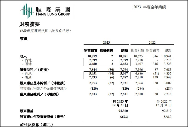 1月30日中午,恒隆地產(chǎn)有限公司發(fā)布2023年度全年業(yè)績。公告顯示,2023年,恒隆地產(chǎn)雖然受人民幣兌港幣貶值影響,而且年內(nèi)未有錄得物業(yè)銷售收入(2022年為3.16億港元),但總收入大致與2022年持平,為103.16億港元。 公告披露,2023年,恒隆地產(chǎn)物業(yè)租賃收入上升3%至103.16億港元,整體營業(yè)溢利亦上升2%至73.89億港元。而隨著利息支出凈額上升,股東應(yīng)占基本純利下跌1%至41.37億港元。 |