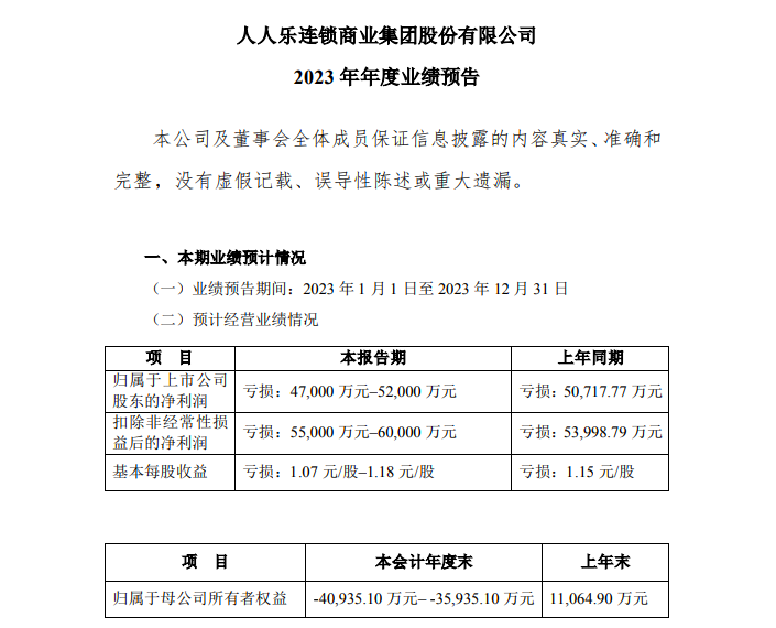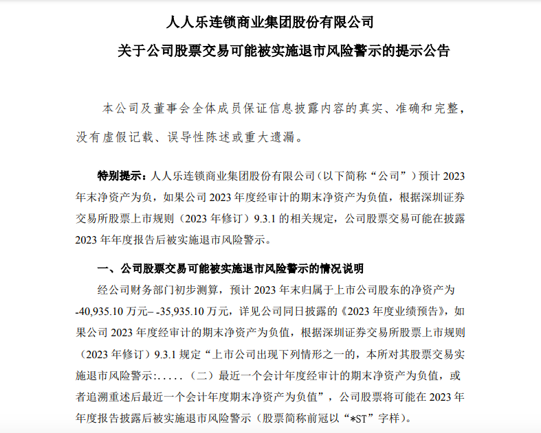 人人樂,曾和華潤(rùn)萬家、新一佳齊名被稱為“廣東超市三大巨頭”,如今卻陷入困境,面臨“披星戴帽”的風(fēng)險(xiǎn)。 01 人人樂預(yù)虧最高5.2億 資不抵債或被*ST 1月30日晚,人人樂超市發(fā)布業(yè)績(jī)預(yù)告,公司預(yù)計(jì)2023年歸屬于上市公司股東的凈利潤(rùn)虧損4.7億-5.2億元,上年同期虧損5.07億元。 對(duì)于虧損,人人樂解釋稱,受外部市場(chǎng)及內(nèi)部經(jīng)營(yíng)諸多不利因素疊加影響,收入持續(xù)下降,經(jīng)營(yíng)業(yè)績(jī)不及預(yù)期。人人樂表示,“公司于2023年第四季度完成了股票協(xié)議轉(zhuǎn)讓后董事會(huì)及經(jīng)營(yíng)班子改組換屆,各項(xiàng)改革正在加快推進(jìn)之中,收入下滑已經(jīng)得到初步控制,但暫未形成規(guī)模效應(yīng)! 在發(fā)布業(yè)績(jī)預(yù)告的同時(shí),人人樂還發(fā)布公告稱,經(jīng)公司財(cái)務(wù)部門初步測(cè)算,預(yù)計(jì)2023年末歸屬于上市公司股東的凈資產(chǎn)為-4.09億元至-3.59億元,若公司2023年度經(jīng)審計(jì)的期末凈資產(chǎn)為負(fù)值,根據(jù)深交所股票上市規(guī)則,公司股票將可能在2023年年度報(bào)告披露后被實(shí)施退市風(fēng)險(xiǎn)警示(股票簡(jiǎn)稱前冠以“*ST”字樣)。 值得注意的是,這已經(jīng)是人人樂第三次因連續(xù)虧損而被戴上“*ST”的帽子。 02 昔日廣東超市三巨頭之一 公開資料顯示,人人樂發(fā)家于廣東深圳,前身為深圳市人人樂連鎖商業(yè)有限公司,是一家特大型連鎖商業(yè)企業(yè),公司的主營(yíng)業(yè)務(wù)包括大賣場(chǎng)、LeSuper高端精品超市、人人樂百貨和網(wǎng)購(gòu)生活超市,以及線上品牌和海外供應(yīng)與物流鏈。其曾和華潤(rùn)萬家、新一佳超市并成為“廣東超市三巨頭”。 1996年,何金明下海在深圳南山區(qū)開出人人樂首家門店,與隨之而來的家樂福(1995年正式進(jìn)入中國(guó)市場(chǎng))、沃爾瑪(1996年正式進(jìn)入中國(guó)市場(chǎng))兩大外資巨頭展開直面競(jìng)爭(zhēng),被兩大巨頭視為本土勁敵。 2010年人人樂在深交所上市,當(dāng)年?duì)I收突破100億元,全國(guó)門店數(shù)量超過100家,創(chuàng)始人何金明也因此短暫地坐上了江西首富的位置。 但好景不長(zhǎng),2012年人人樂首次出現(xiàn)虧損,營(yíng)收也經(jīng)歷腰斬,隨后便陷入了ST、變賣資產(chǎn)摘帽、再ST、再賣資產(chǎn)摘帽的循環(huán)—— 2014年和2015年,人人樂連續(xù)兩年虧損,分別虧損4.61億和4.75億元,并進(jìn)入ST狀態(tài)。 2016年,人人樂通過出售物業(yè)實(shí)現(xiàn)盈利得以摘帽,但這波輸血也僅讓它撐了兩年。 2017年人人樂凈利潤(rùn)虧損5.36億元。 2018年再次虧損3.55億元,營(yíng)收滑落至81.3億元。 2019年4月,人人樂因?yàn)檫B續(xù)兩年虧損再一次被ST,公司股票簡(jiǎn)稱由“人人樂”變更為“*ST人樂”。 2015年,退休的何金明宣布重新出山,還曾表示,“人人樂現(xiàn)在、將來都不會(huì)被賣掉”。但轉(zhuǎn)眼2019年,何金明就將公司控股權(quán)轉(zhuǎn)讓給了西安曲江文化產(chǎn)業(yè)投資(集團(tuán))有限公司,實(shí)際控制人變更為西安曲江新區(qū)管理委員會(huì)。 2020年,人人樂通過變賣資產(chǎn)實(shí)現(xiàn)盈利,公司股票簡(jiǎn)稱恢復(fù)為“人人樂”。值得關(guān)注的是,在人人樂2020年3538.28萬元的凈利潤(rùn)中,通過處置子公司西安人人樂實(shí)業(yè)有限公司(以下簡(jiǎn)稱“西安實(shí)業(yè)公司”)股權(quán)實(shí)現(xiàn)投資收益 36900.38萬元,通過轉(zhuǎn)讓全資子公司西安市人人樂超市有限公司永和坊項(xiàng)目資產(chǎn)(以下簡(jiǎn)稱“永和坊項(xiàng)目”)實(shí)現(xiàn)資產(chǎn)處置收益8069.33萬元。 2022年8月8日,人人樂股東深圳浩明集團(tuán)、深圳人人樂咨詢公司、何金明、張政與公司控股股東西安曲江文投集團(tuán)(下稱“曲江文投”)的一致行動(dòng)人西安通濟(jì)永樂商業(yè)運(yùn)營(yíng)管理有限公司(下稱“永樂商管”)簽署了《股份轉(zhuǎn)讓協(xié)議》。按照協(xié)議約定,永樂商管按照每股5.88元受讓人人樂無限售A股股份1.73億股,占上市公司股份總數(shù)的39.29%。 2023年7月17日,公司收到永樂商管的告知函以及中國(guó)證券登記結(jié)算有限公司出具的《證券過戶登記確認(rèn)書》,本次股份轉(zhuǎn)讓已通過深交所合規(guī)性審核,上述交易落定。截至2023年三季度末,永樂商管直接持有人人樂1.73億股,占上市公司股份總數(shù)的39.30%,成為人人樂第一大股東。曲江文投合計(jì)持有人人樂2.66億股股份,占上市公司股份總數(shù)的60.44%。 人人樂對(duì)此表示,曲江文投利用其自身資本優(yōu)勢(shì)以及在文化、旅游及教育板塊的相關(guān)資源優(yōu)勢(shì)為上市公司賦能,支持上市公司改善經(jīng)營(yíng)狀況,提升經(jīng)營(yíng)業(yè)績(jī),實(shí)現(xiàn)可持續(xù)高質(zhì)量發(fā)展。同時(shí)通過進(jìn)一步鞏固對(duì)上市公司的控制權(quán),提高國(guó)有資本配置和運(yùn)營(yíng)效率。 然而,國(guó)資的入主并沒有為人人樂帶來立竿見影的效果,在零售行業(yè)整體復(fù)蘇的背景下,由于自身運(yùn)營(yíng)能力的問題以及市場(chǎng)份額的流失,人人樂在2023年上半年的虧損面甚至進(jìn)一步擴(kuò)大。 如今,這已經(jīng)是人人樂第三次因?yàn