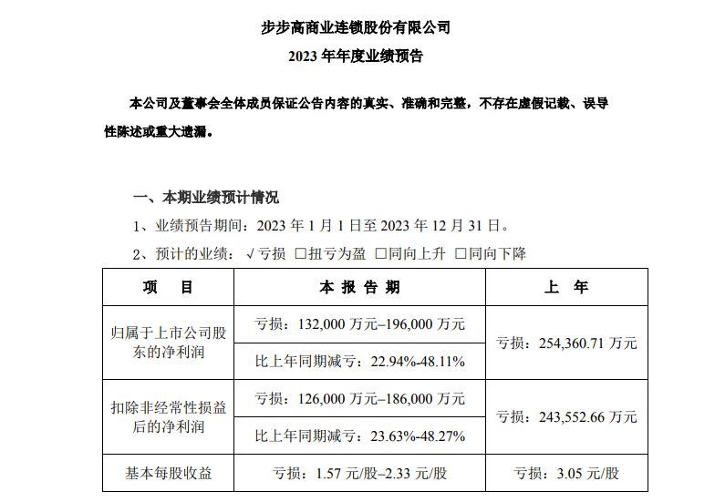 近日,步步高商業(yè)連鎖股份有限公司發(fā)布2023年度業(yè)績(jī)預(yù)告。 公告顯示,公司預(yù)計(jì)2023年度歸屬于上市公司股東的凈利潤(rùn)虧損在13.2億至19.6億元之間,相較上年同期的25.44億元虧損,減虧幅度為22.94%至48.11%?鄢墙(jīng)常性損益后的凈利潤(rùn)虧損預(yù)計(jì)在12.6億至18.6億元,相比上年同期的24.36億元虧損,減虧23.63%至48.27%。 步步高表示,報(bào)告期公司虧損的主要原因在于,2023年度公司所處行業(yè)競(jìng)爭(zhēng)態(tài)勢(shì)愈加嚴(yán)峻,疊加公司流動(dòng)性危機(jī),經(jīng)營(yíng)業(yè)績(jī)受到很大影響;公司調(diào)整經(jīng)營(yíng)策略,主動(dòng)進(jìn)行門(mén)店調(diào)優(yōu),淘汰扭虧無(wú)望門(mén)店,閉店支出較大;南城百貨受流動(dòng)性危機(jī)影響業(yè)績(jī)下滑,公司預(yù)計(jì)其商譽(yù)存在減值跡象。受公司內(nèi)、外部因素雙重影響,預(yù)計(jì)投資性房地產(chǎn)公允價(jià)值整體有所下降,最終公允價(jià)值變動(dòng)金額將由公司聘請(qǐng)的評(píng)估機(jī)構(gòu)及審計(jì)機(jī)構(gòu)進(jìn)行評(píng)估和審計(jì)后確定。 |