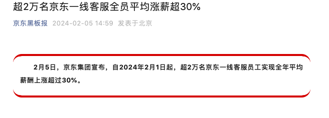 2月5日,京東集團(tuán)宣布,自2024年2月1日起,超2萬(wàn)名京東一線客服員工實(shí)現(xiàn)全年平均薪酬上漲超過(guò)30%。 今年是京東堅(jiān)持春節(jié)也送貨的第12個(gè)年頭,京東客服團(tuán)隊(duì)也將有超萬(wàn)人堅(jiān)守崗位,用專業(yè)、貼心的服務(wù),陪伴用戶度過(guò)新春佳節(jié)。今年,京東為宿遷、成都、武漢三地職場(chǎng)值班的客服員工親屬提供免費(fèi)“探親房”,并組織寫春聯(lián)、包餃子、年夜飯等一系列年味活動(dòng),和家人一起團(tuán)圓過(guò)大年。 京東客服成立于2009年,目前已發(fā)展成為行業(yè)內(nèi)規(guī)模最大的自營(yíng)客服團(tuán)隊(duì)。自成立之初,京東客服堅(jiān)持為用戶提供7x24小時(shí)服務(wù),堅(jiān)守“客戶為先“的初心,做用戶生活的守護(hù)者。同時(shí),積極承擔(dān)社會(huì)責(zé)任,對(duì)有特殊需求的用戶提供差異化服務(wù),如為銀發(fā)一族開(kāi)通長(zhǎng)輩用戶專線,提供專屬服務(wù);而母嬰客服團(tuán)隊(duì)上崗需獲得母嬰咨詢專業(yè)證書(shū);京東客服生命通道團(tuán)隊(duì)成立四年來(lái),已成功挽救近600名有輕生念頭的用戶。由近百位殘疾人組成的“陽(yáng)光天使”團(tuán)隊(duì),他們用真誠(chéng)和熱情服務(wù)著用戶,也擁有了更有尊嚴(yán)和體面的生活。 企業(yè)對(duì)員工好,員工才能用真心去服務(wù)客戶。除了為全員繳納“五險(xiǎn)一金”,京東建立了一套多維度的福利關(guān)懷和人才發(fā)展機(jī)制,讓員工日子過(guò)得更有希望、更加美好。從20多年前創(chuàng)業(yè)之初,京東就始終堅(jiān)持“先人后企”,努力讓每一位京東人都能夠收獲有尊嚴(yán)感、幸福感和成就感的工作和生活。 |