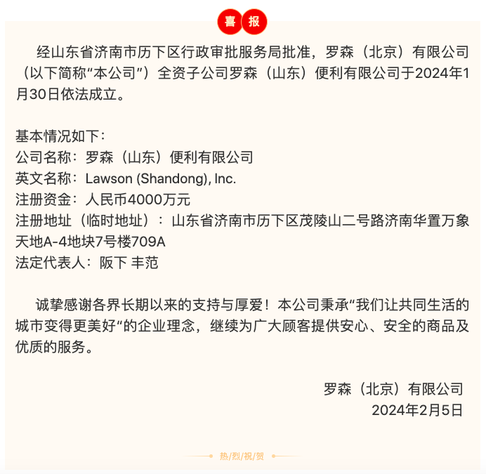 2月5日,北京羅森發(fā)布公告稱,羅森(山東)便利有限公司成立。 公告顯示,羅森(北京)有限公司全資子公司羅森(山東)便利有限公司于2024年1月30日成立,注冊資金4000萬元。 此前,羅森(北京)有限公司一名工作人員表示,山東的羅森便利店開店預(yù)計還需要幾個月時間。 羅森(北京)有限公司開發(fā)部工作人員透露,預(yù)計今年3月至4月山東首家羅森便利店才能開業(yè),“具體的日期還沒有! 該工作人員確認(rèn),首店位于濟(jì)南,但尚不清楚首批會開幾家店,現(xiàn)在仍處于籌備前期階段。 近年來,羅森已在中國擁有5700家以上的門店,遍布上海、北京、重慶、大連等100多個城市。值得注意的是,2020年-2022年,羅森中國連續(xù)三年成為在華外資便利店門店數(shù)量最多的品牌。 此前,羅森公司高管曾至少兩次公開表示,計劃到2025年,把在中國的店鋪數(shù)量增至1萬家。 |
